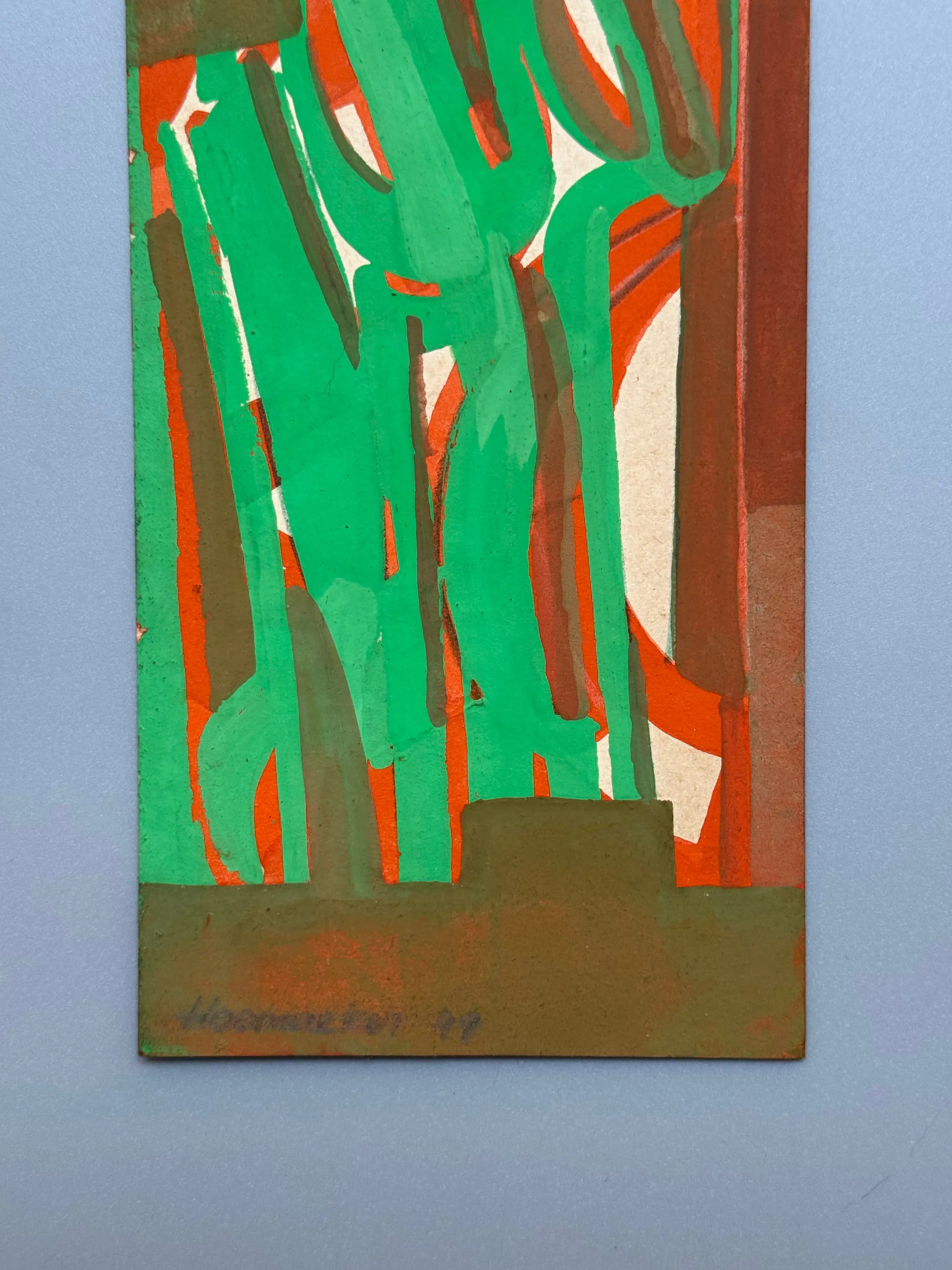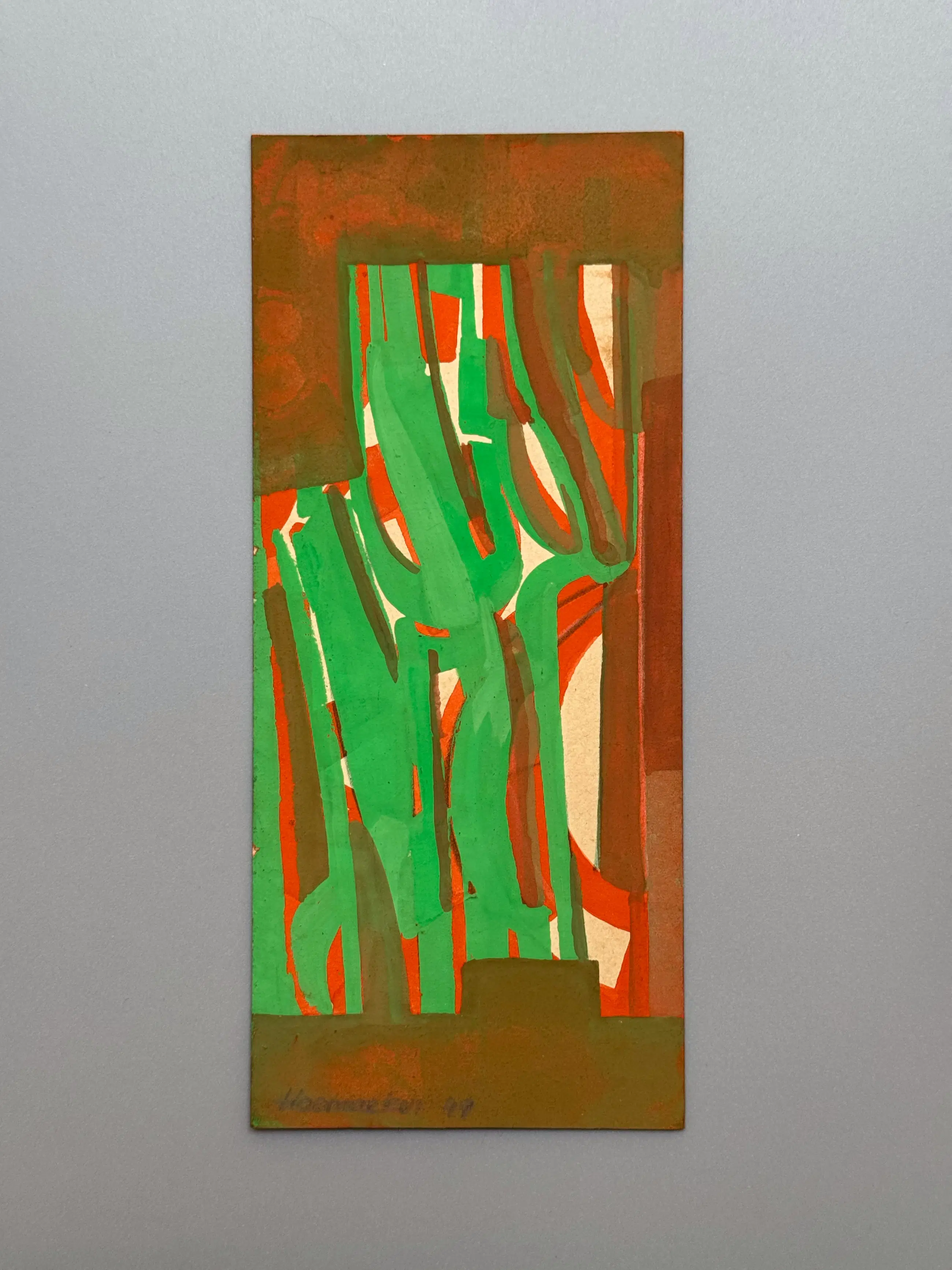 Cette composition verticale présente des formes organiques superposées et un travail de pinceau gestuel, suggérant des éléments végétaux ou calligraphiques émergeant d'une structure rigide. Le style caractéristique de Hoemaeker transparaît dans ses lignes appliquées avec assurance et dans sa capacité à équilibrer spontanéité et maîtrise de la composition. La signature, caractéristique de ses œuvres ultérieures, apparaît dans la marge inférieure et confirme l'attention constante de l'artiste à la paternité et à la présentation.