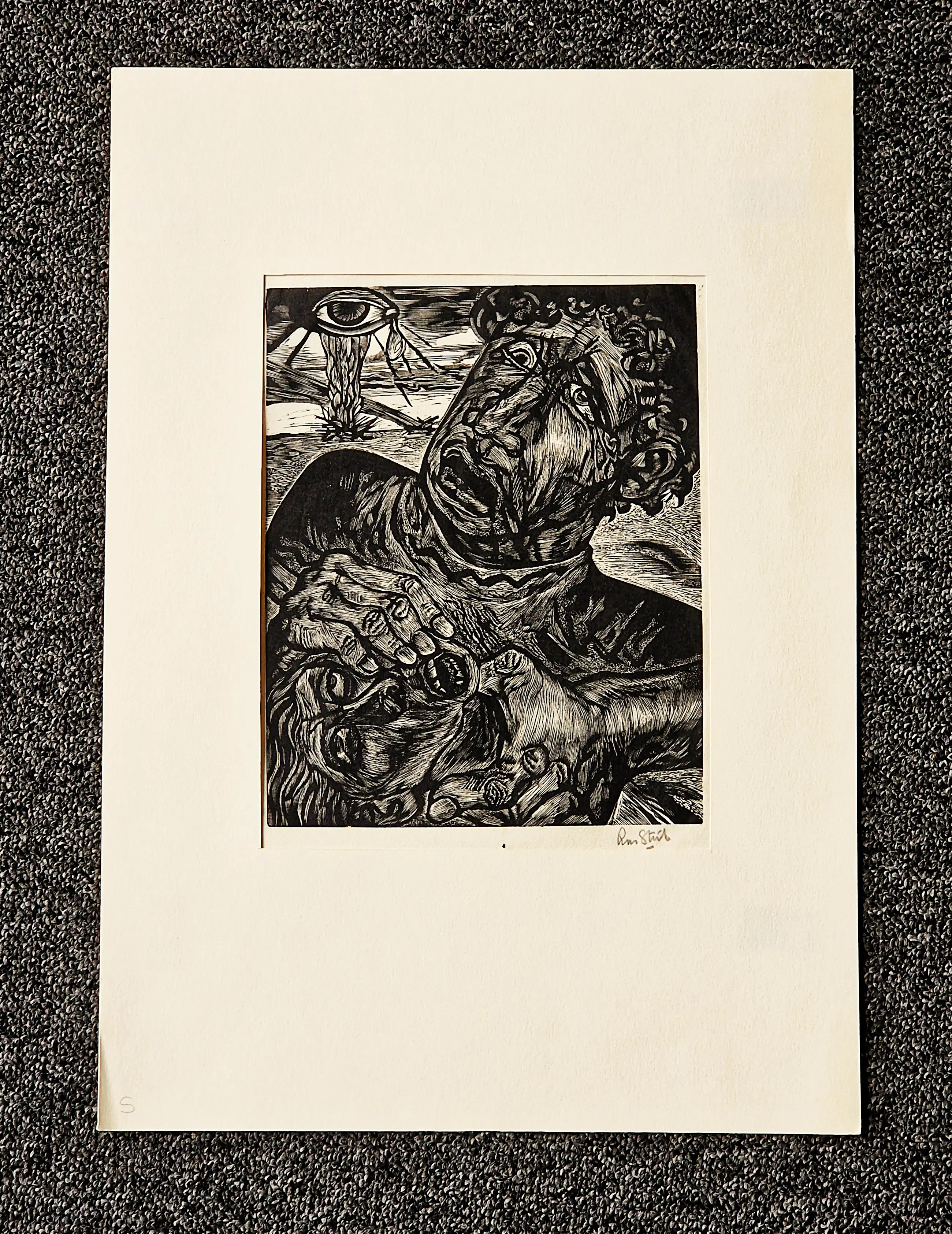 Lou Strik - Grande gravure biblique sur bois/linogravure « Caïn et Abel » signée au crayon