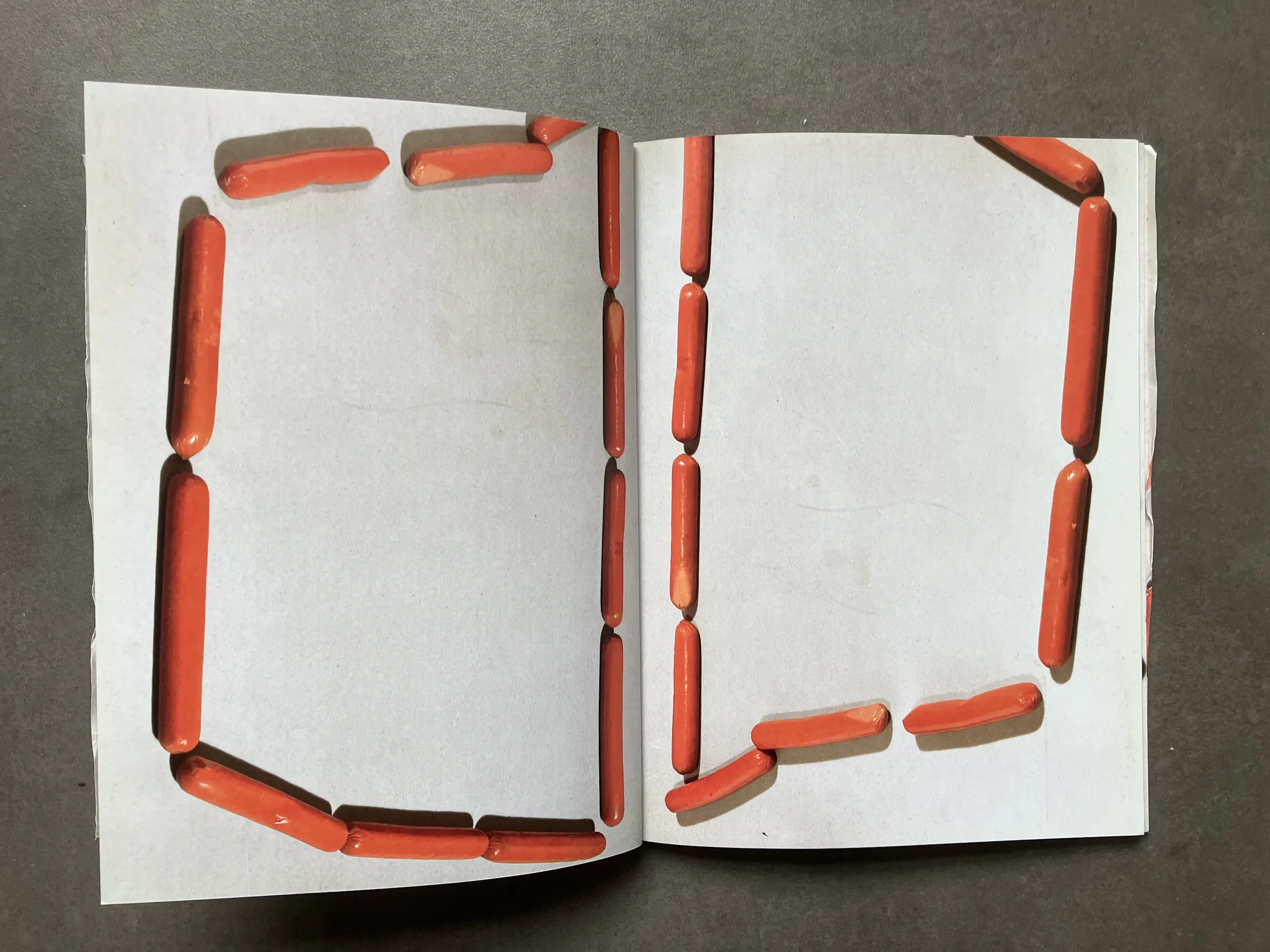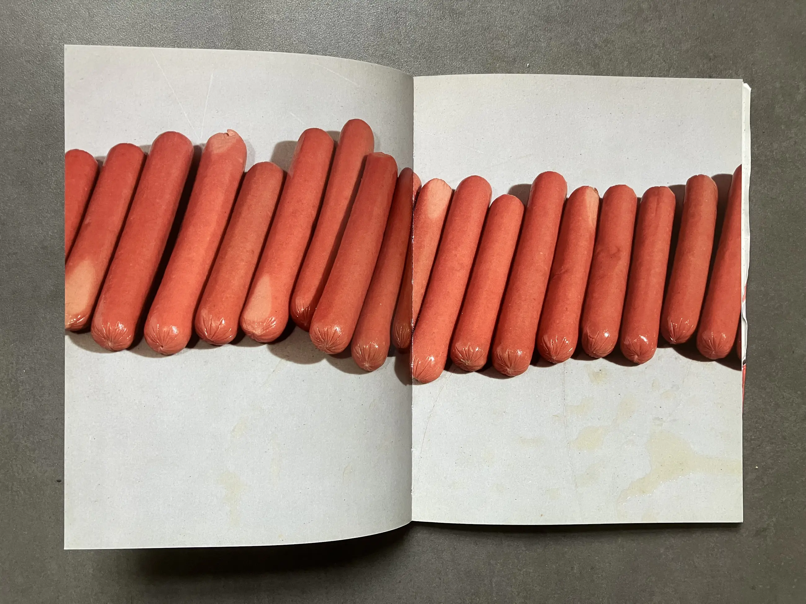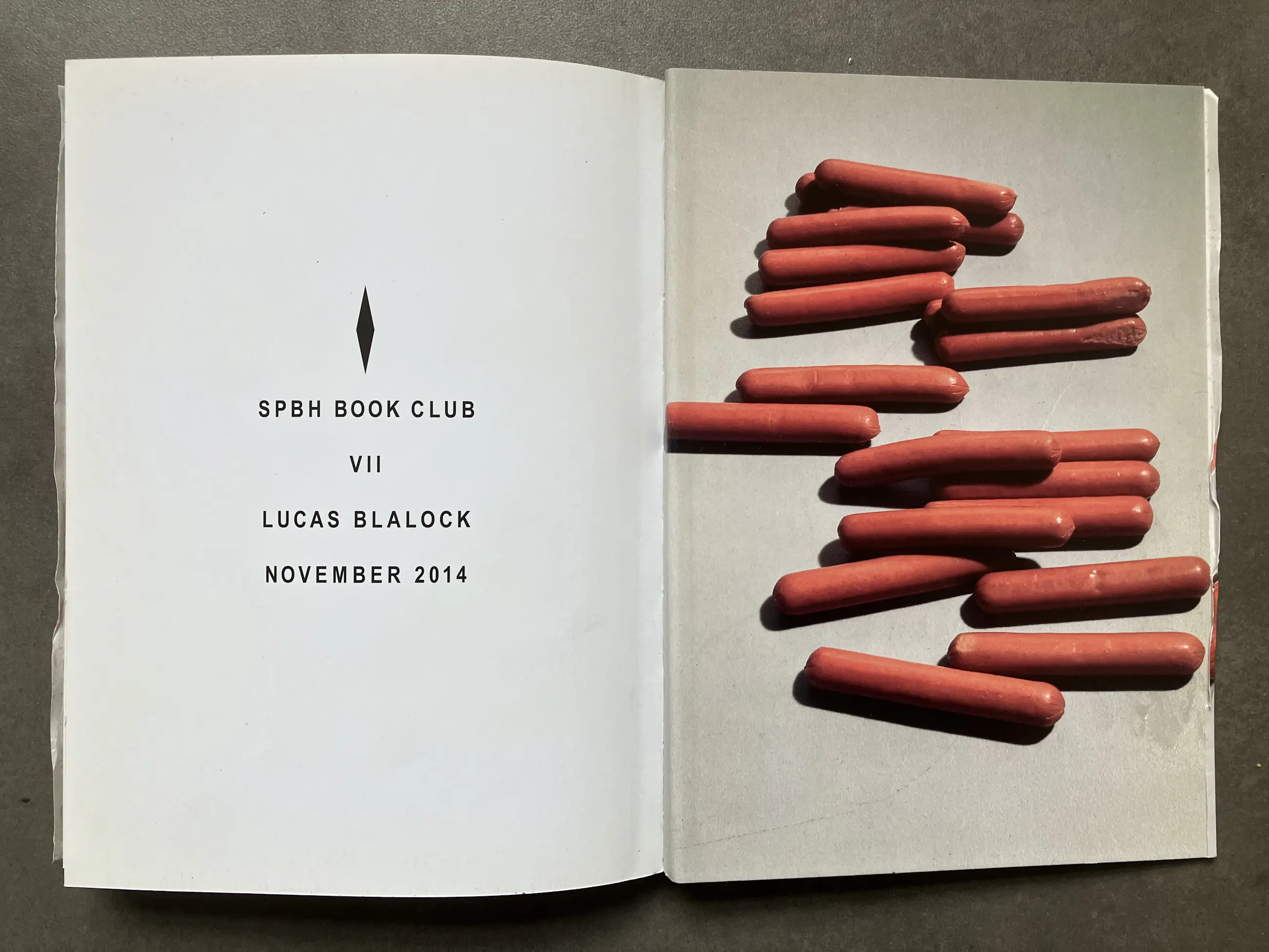 Le Vol. VII du Club de lecture SPBH poursuit l'exploration de Blalock sur les substituts, les hot-dogs faisant office de ligne, de coup de pinceau, de partie du corps et d'objet de nature morte. Le corps de cet aliment entretient une relation complexe et étrange avec la photographie sans surface, une situation que les images exploitent avec humour et dégoût. Le livre lui-même est autant un objet que le livre, son contenu changeant d'orientation et le tout scellé par un autocollant.