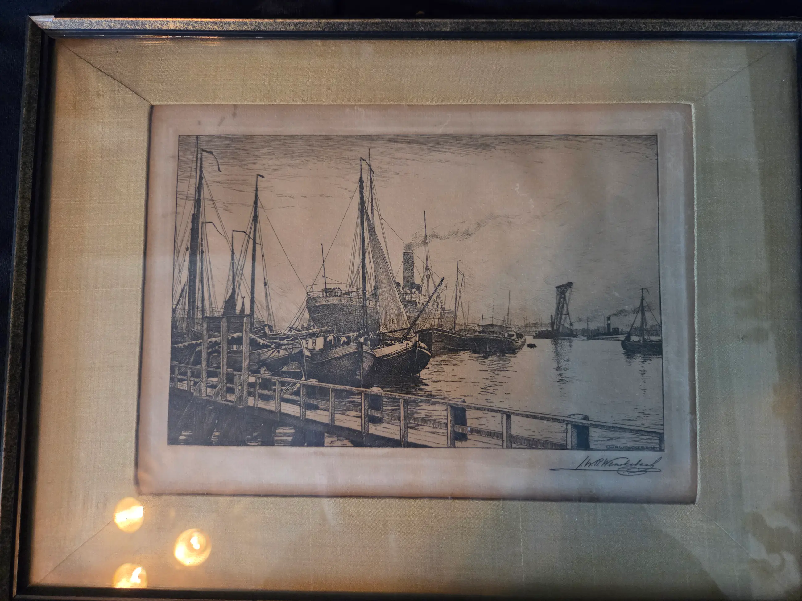 Wenckebach, aussi connu sous le nom de Willem Wenckebach, était non seulement un peintre et illustrateur talentueux (pensez aux célèbres albums Verkade !), mais aussi un graphiste talentueux. Avec cette lithographie, il offre une vue magnifique d'un port animé, immortalisée dans son style caractéristique et atmosphérique.