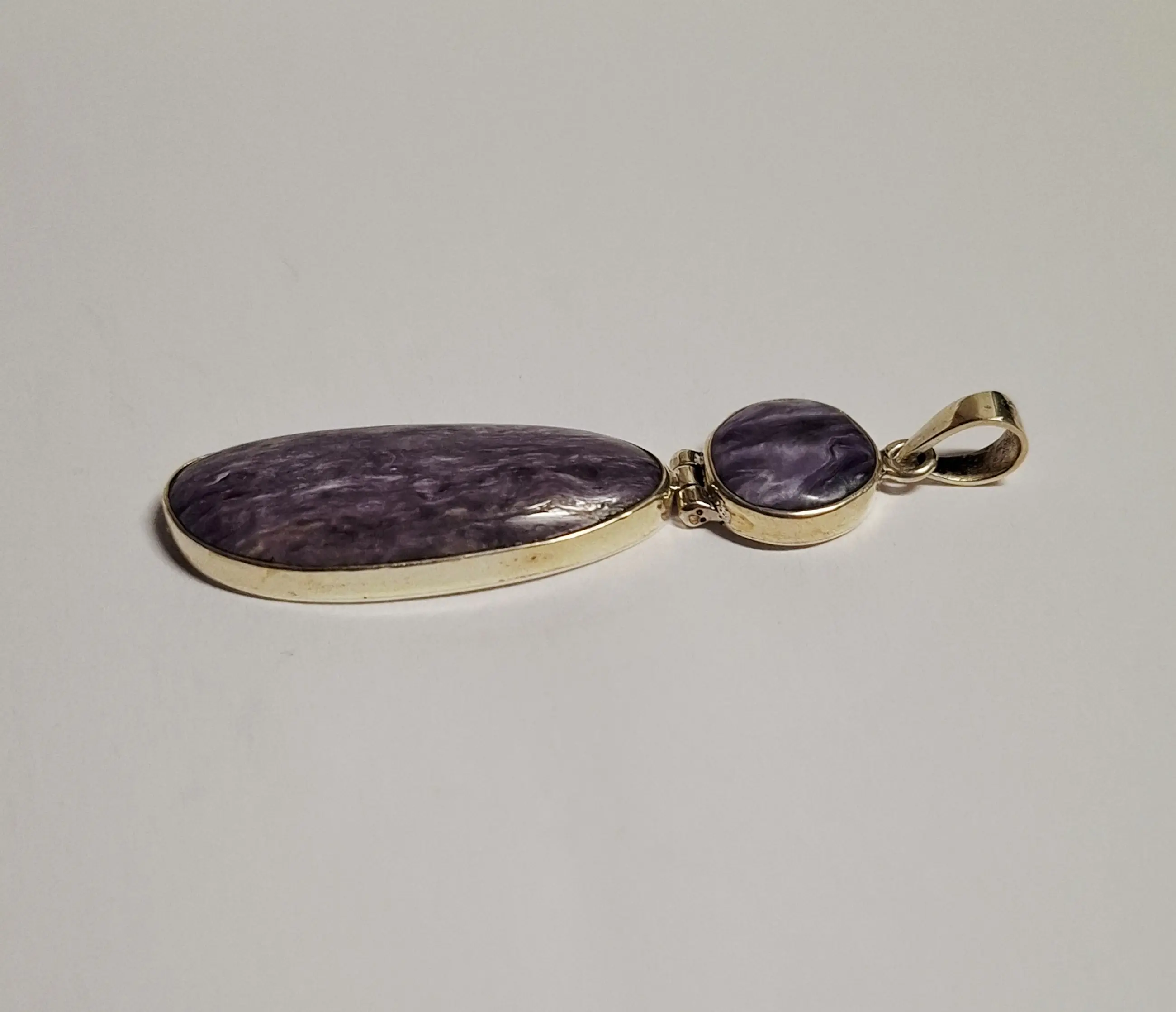 Magnifique pendentif en charoïte violette mouchetée, serti dans de l'argent sterling 925 de qualité joaillière. La pierre de charoïte de ce pendentif mesure environ 44 mm de haut et 23 mm de large, et présente une élégante finition argent. Vers 1980.