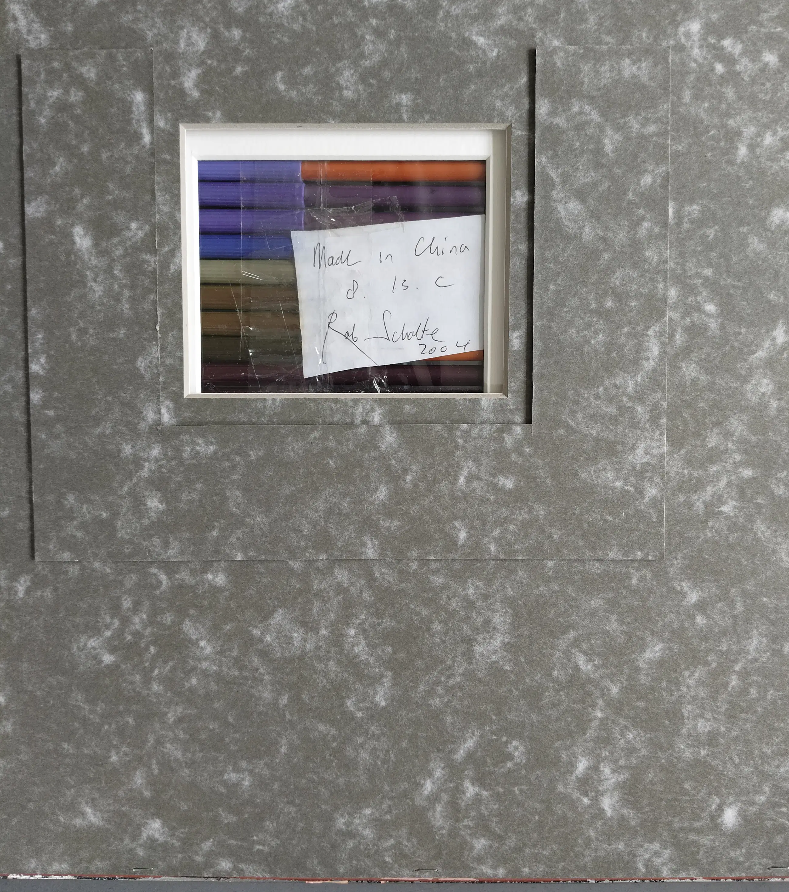 Collage au feutre encadré signé de l'artiste Rob Scholte (1958) de 2004. Signé au stylo au dos, intitulé « Fabriqué en Chine 8.13.C » et daté de 2004. Dimensions de l'image : 50 x 42 cm (H x l). Dimensions du cadre en bois argenté : 86 x 78 cm. Quelques petites taches claires sont visibles sous le passe-partout et quelques coins du cadre ont été retouchés. L'ensemble est par ailleurs en excellent état.
