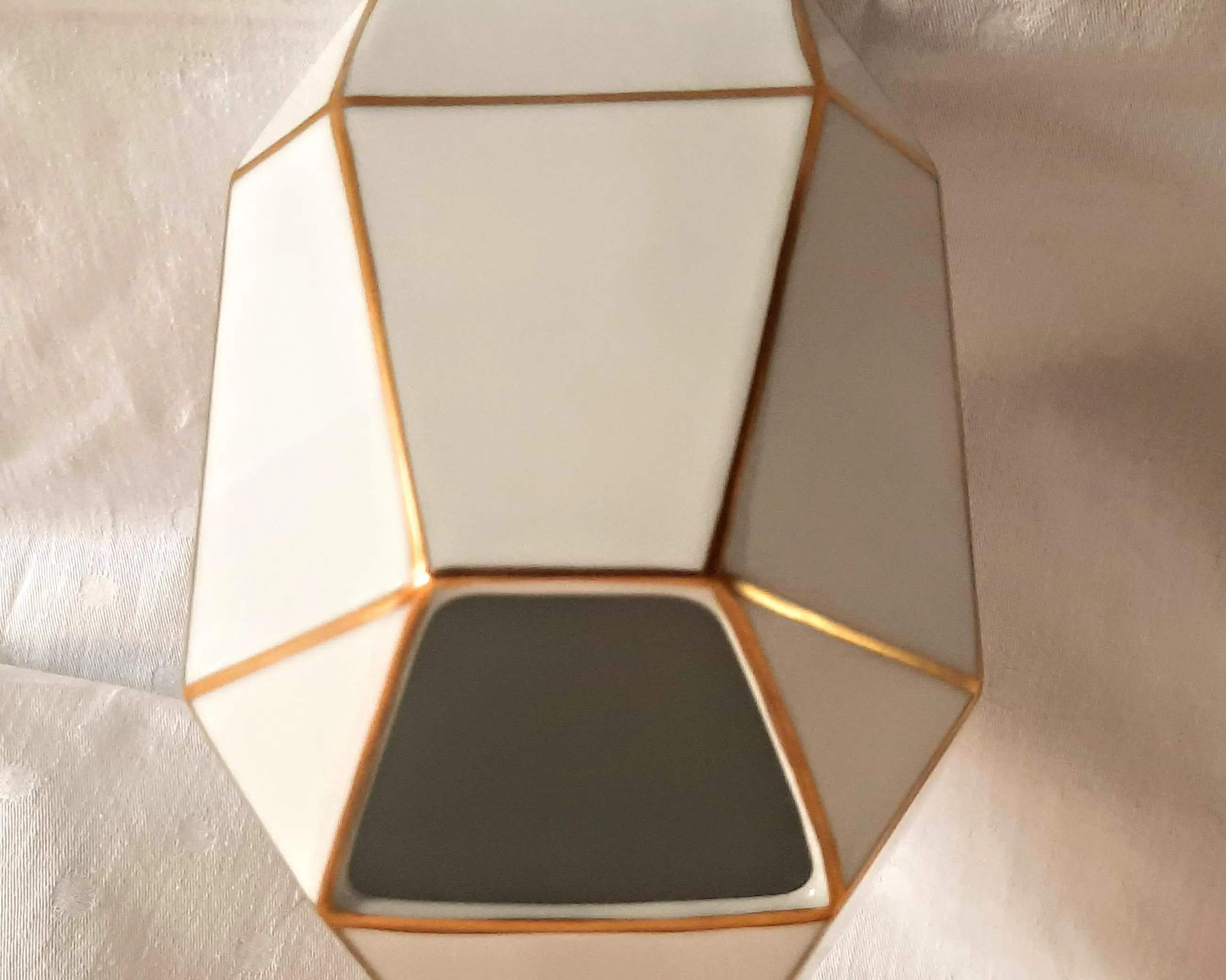 Le vase est en porcelaine blanche et décoré de manière asymétrique avec des lignes dorées -