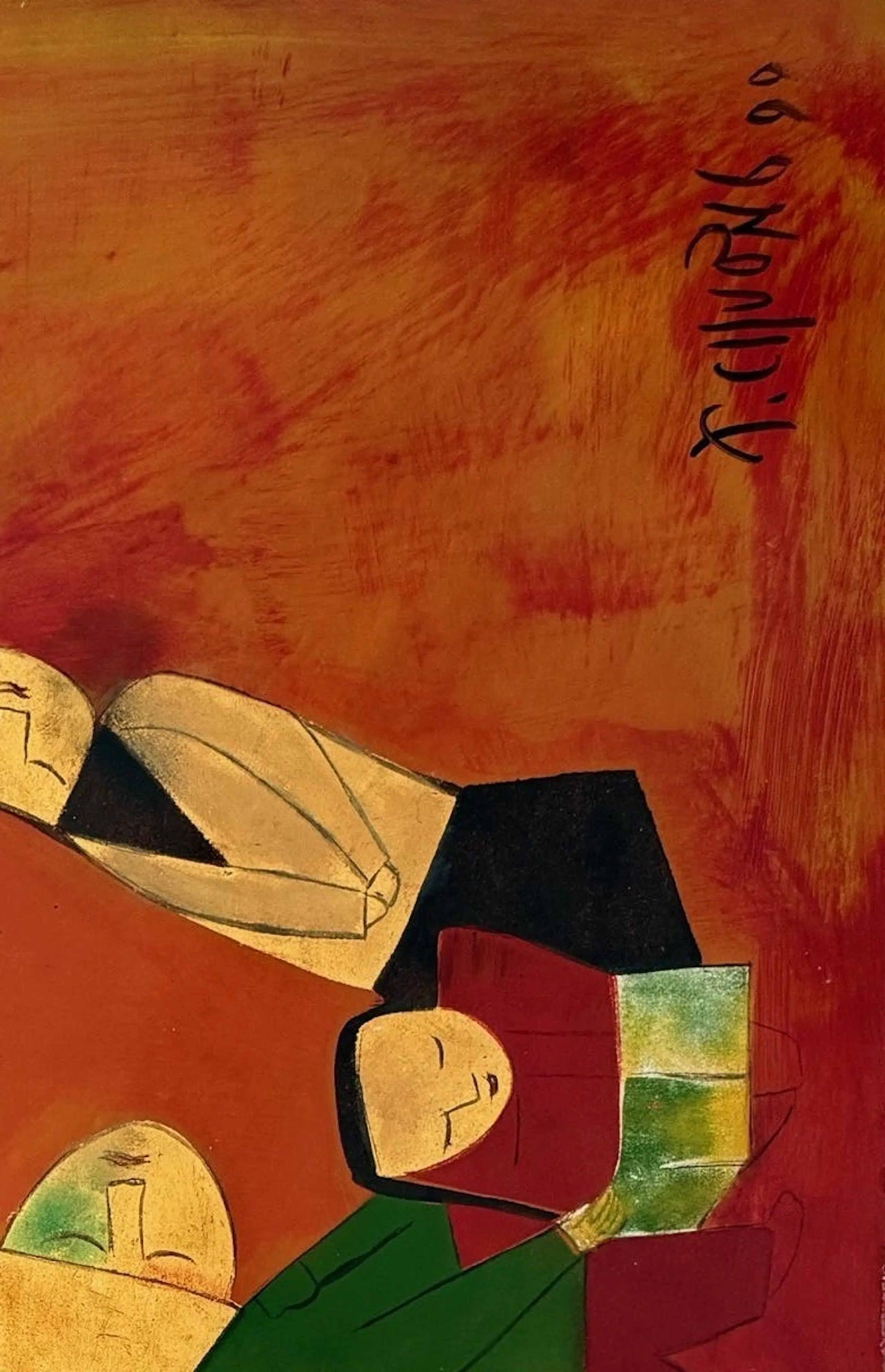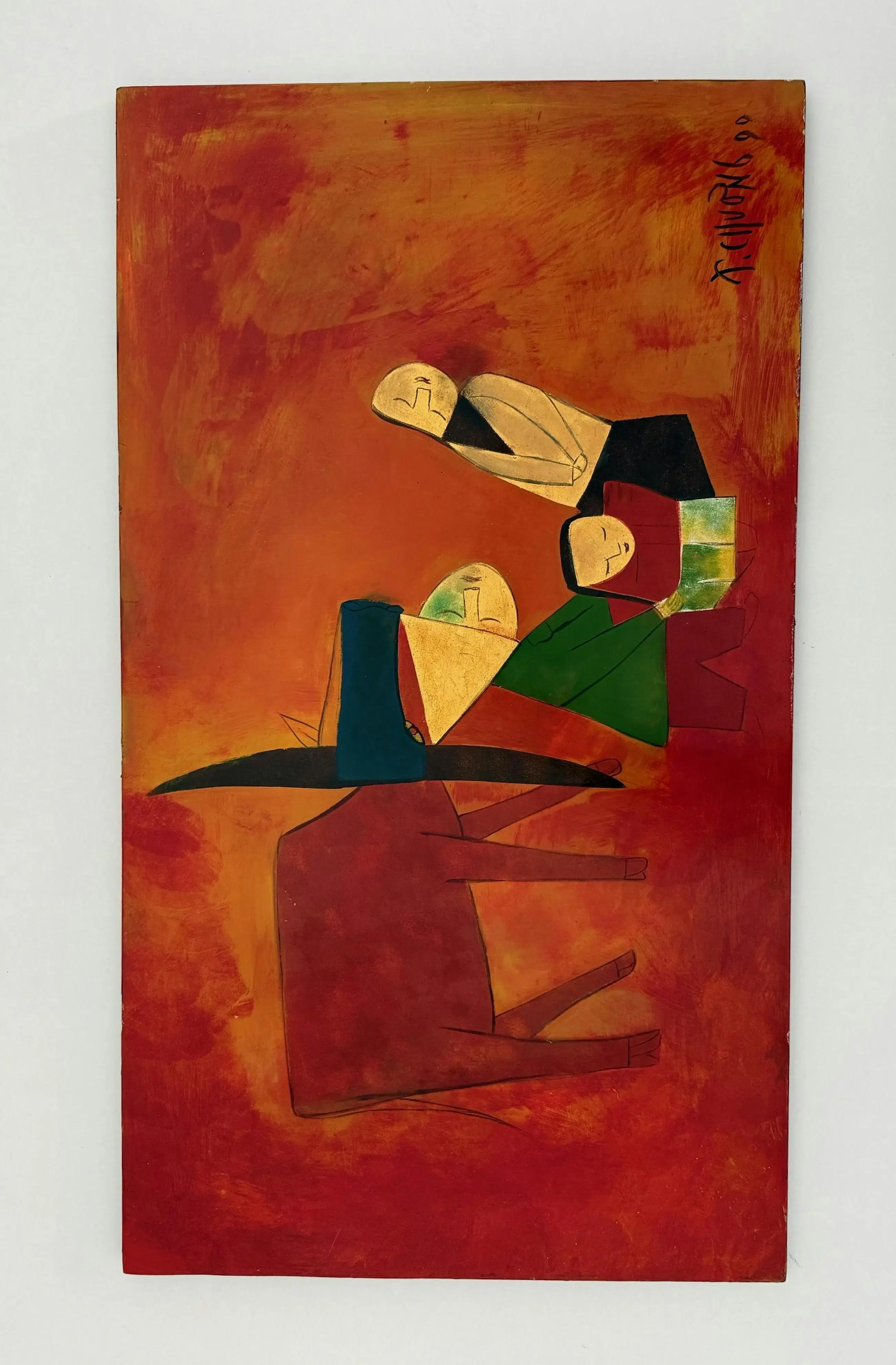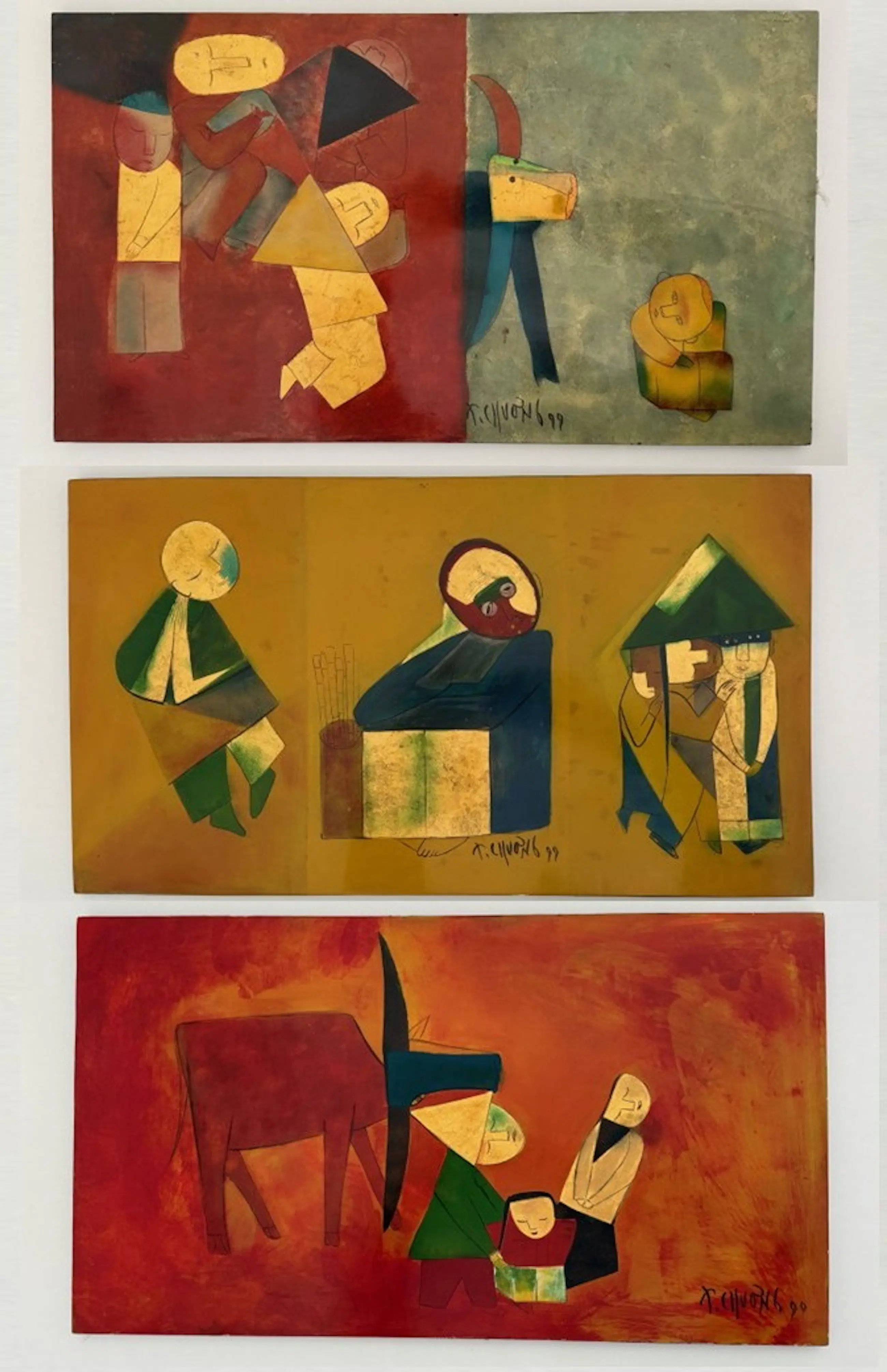 Ces remarquables peintures de 65 x 32 cm du célèbre artiste vietnamien Thanh Chương, datées de 1990, illustrent son style caractéristique, mêlant abstraction moderniste et thèmes traditionnels vietnamiens. La composition présente des formes humaines et animales simplifiées, presque géométriques, rendues dans des tons chauds et terreux de rouge, d'orange et d'ocre. Au centre, un groupe de personnages stylisés – peut-être une famille – est rassemblé sous une haute structure angulaire, symbolisant peut-être une habitation ou un motif culturel. À gauche se dresse la silhouette d'un bœuf ou d'un buffle, symbole intemporel de la vie rurale vietnamienne.