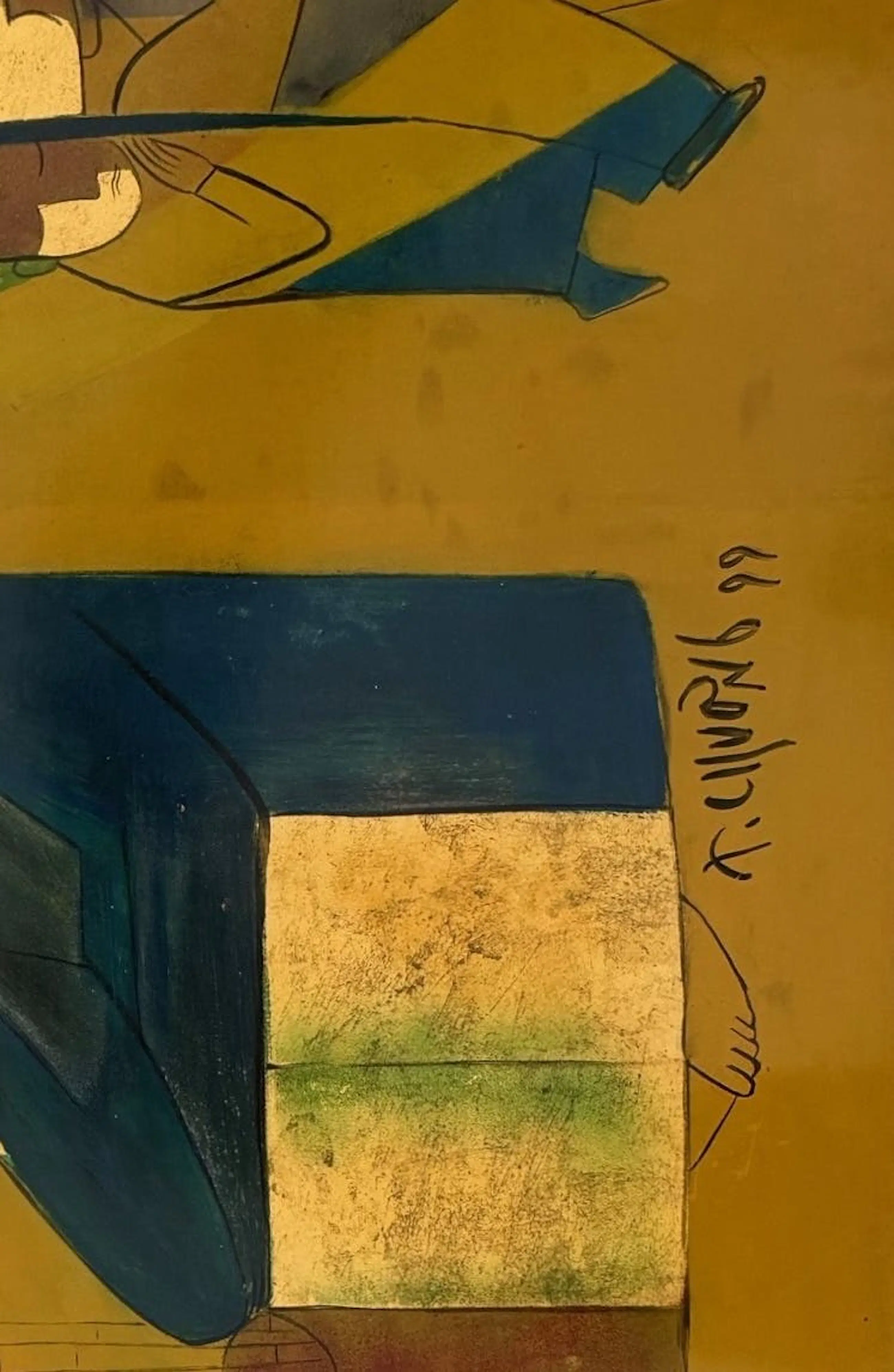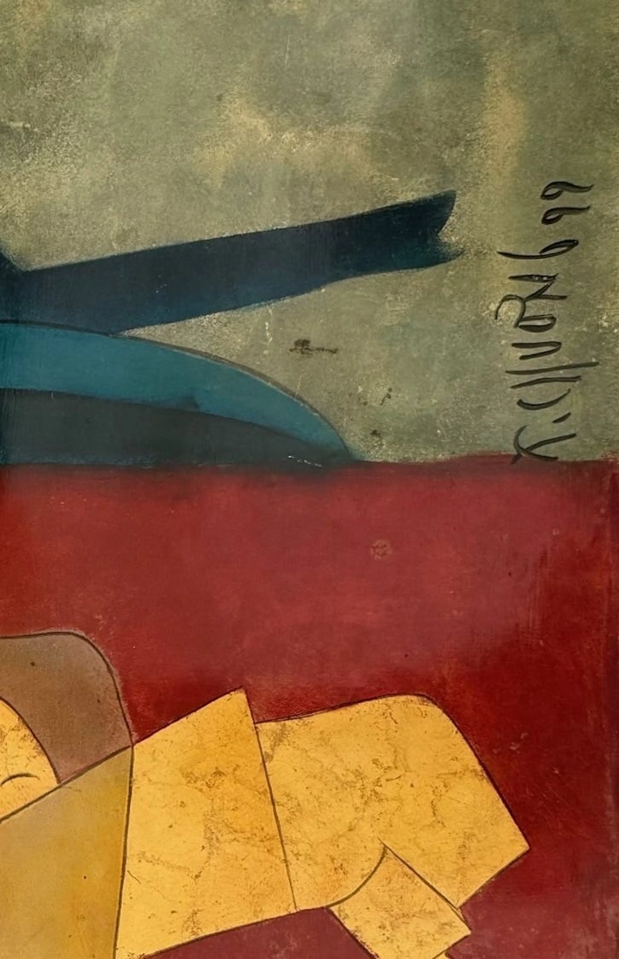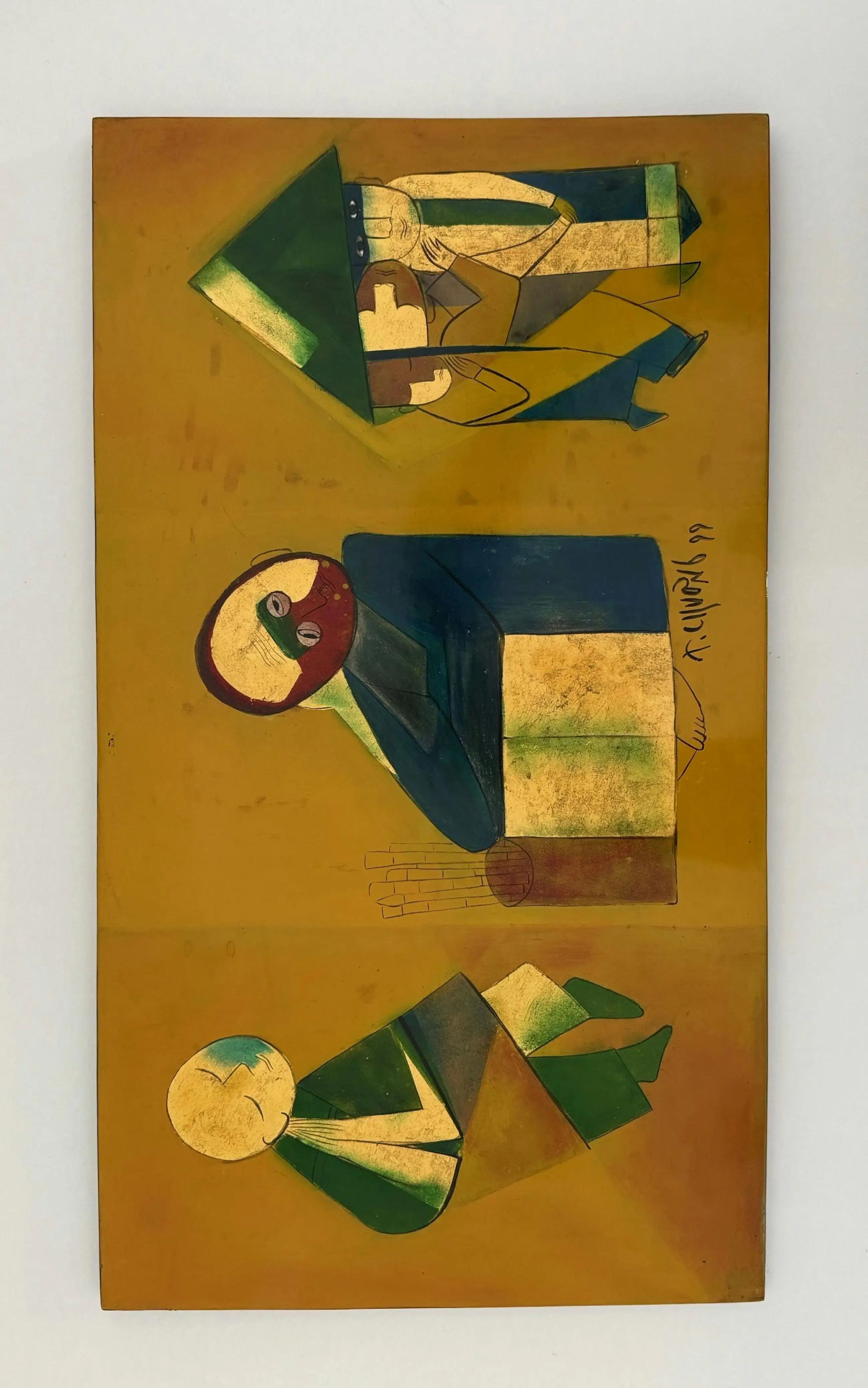 Ces remarquables peintures de 65 x 32 cm du célèbre artiste vietnamien Thanh Chương, datées de 1990, illustrent son style caractéristique, mêlant abstraction moderniste et thèmes traditionnels vietnamiens. La composition présente des formes humaines et animales simplifiées, presque géométriques, rendues dans des tons chauds et terreux de rouge, d'orange et d'ocre. Au centre, un groupe de personnages stylisés – peut-être une famille – est rassemblé sous une haute structure angulaire, symbolisant peut-être une habitation ou un motif culturel. À gauche se dresse la silhouette d'un bœuf ou d'un buffle, symbole intemporel de la vie rurale vietnamienne.