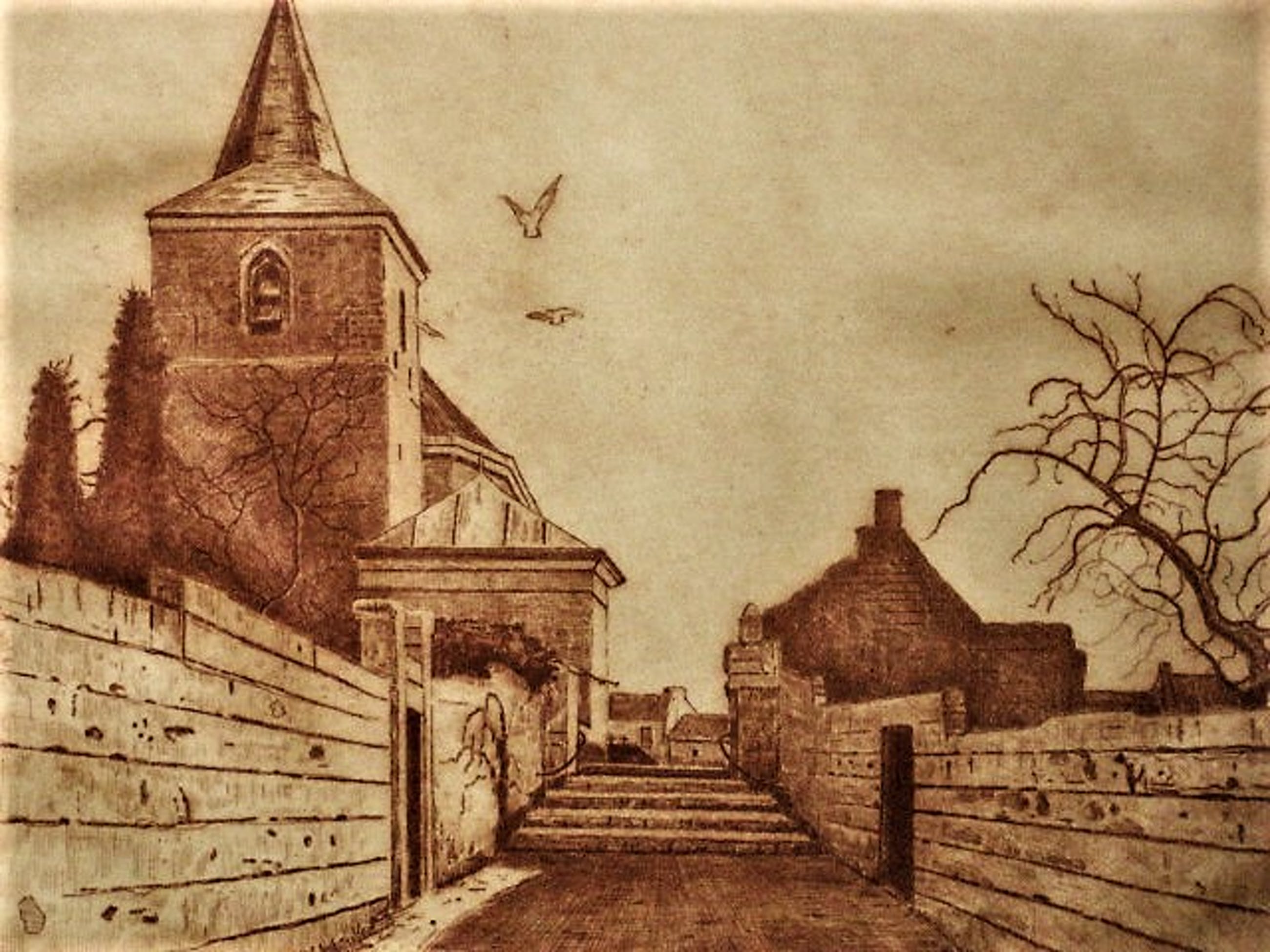 Grote, scherpe zachtrode Lithografie "het dorp Kanne te Zuid Limburg" in 1932 gemaakt door de veelzijdige kunstenaar Ton Meyer.