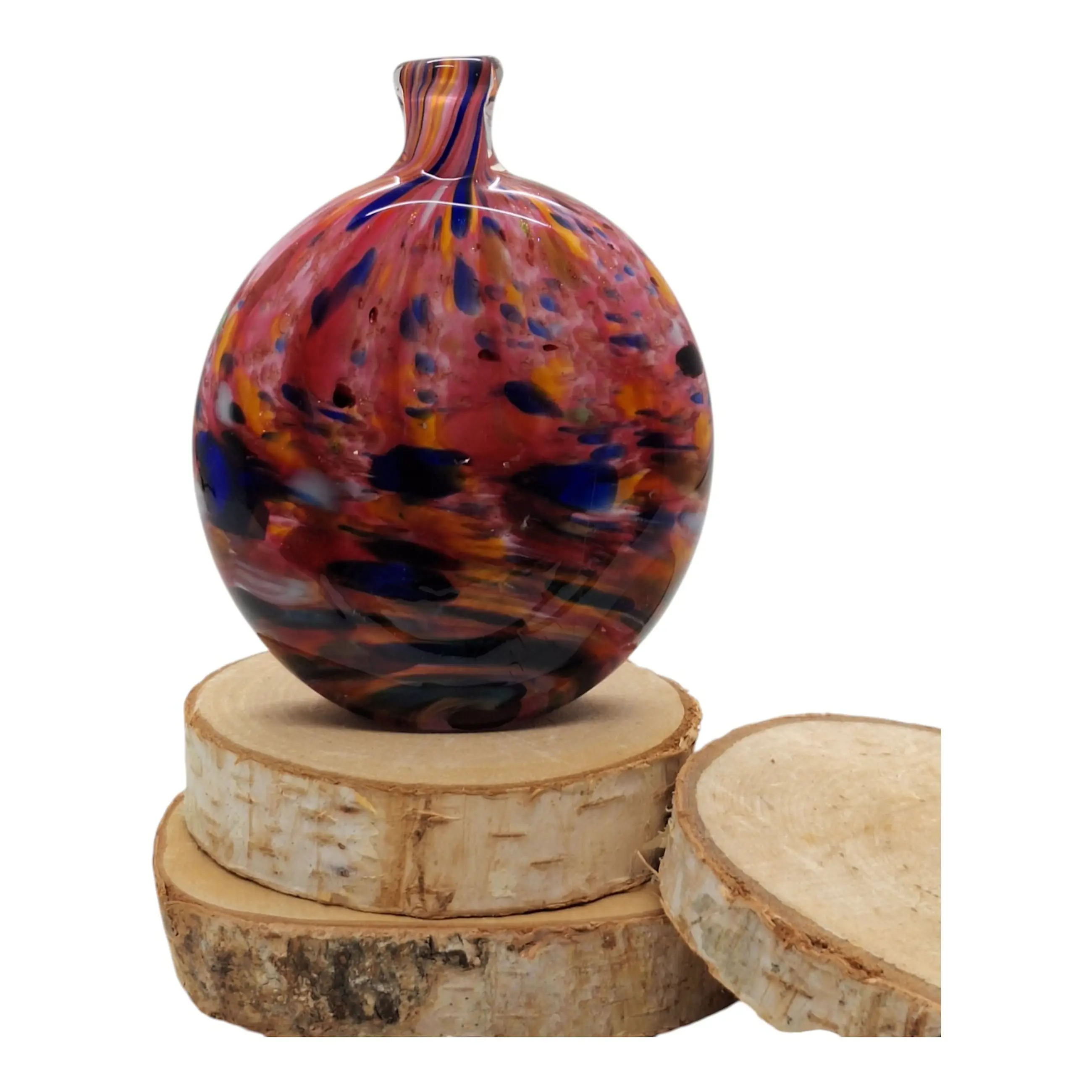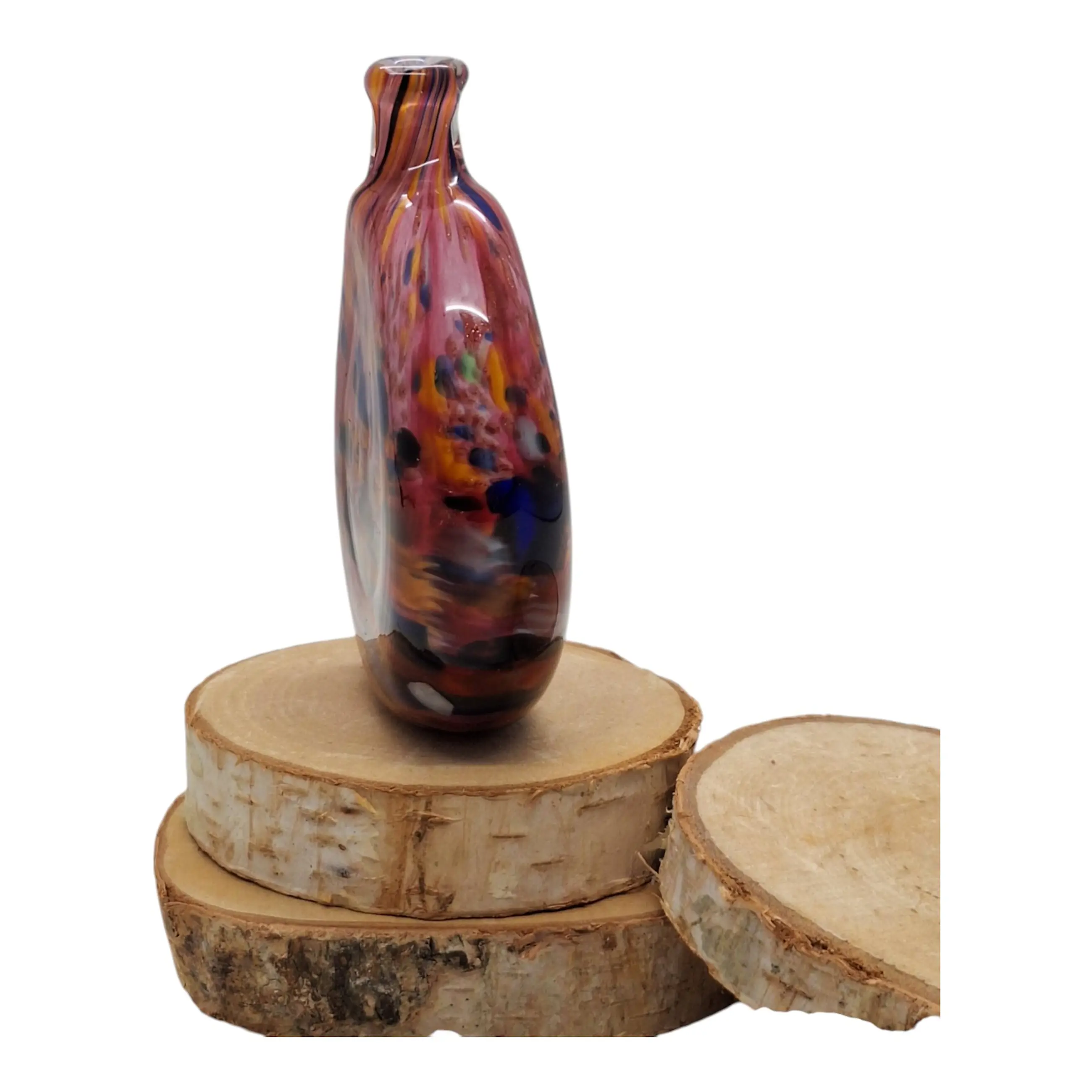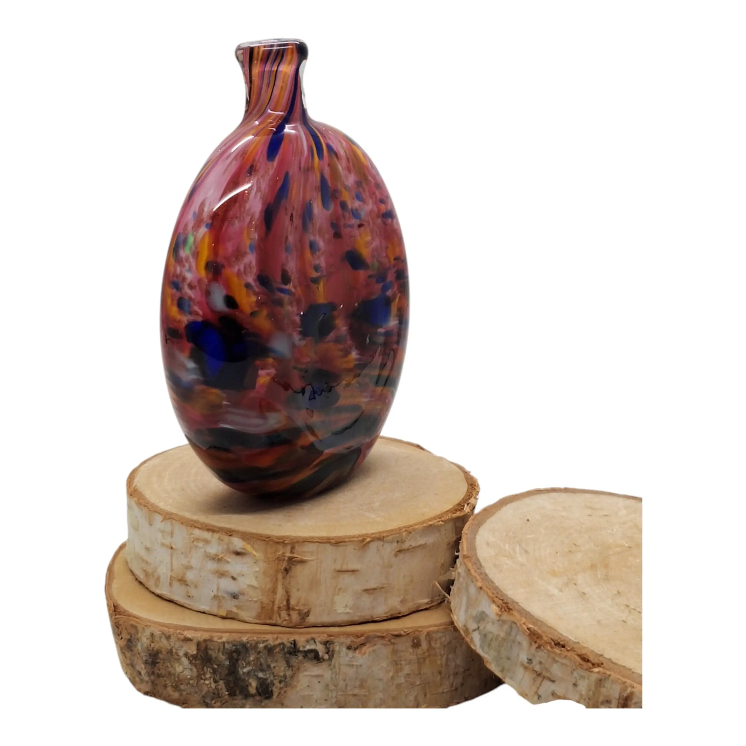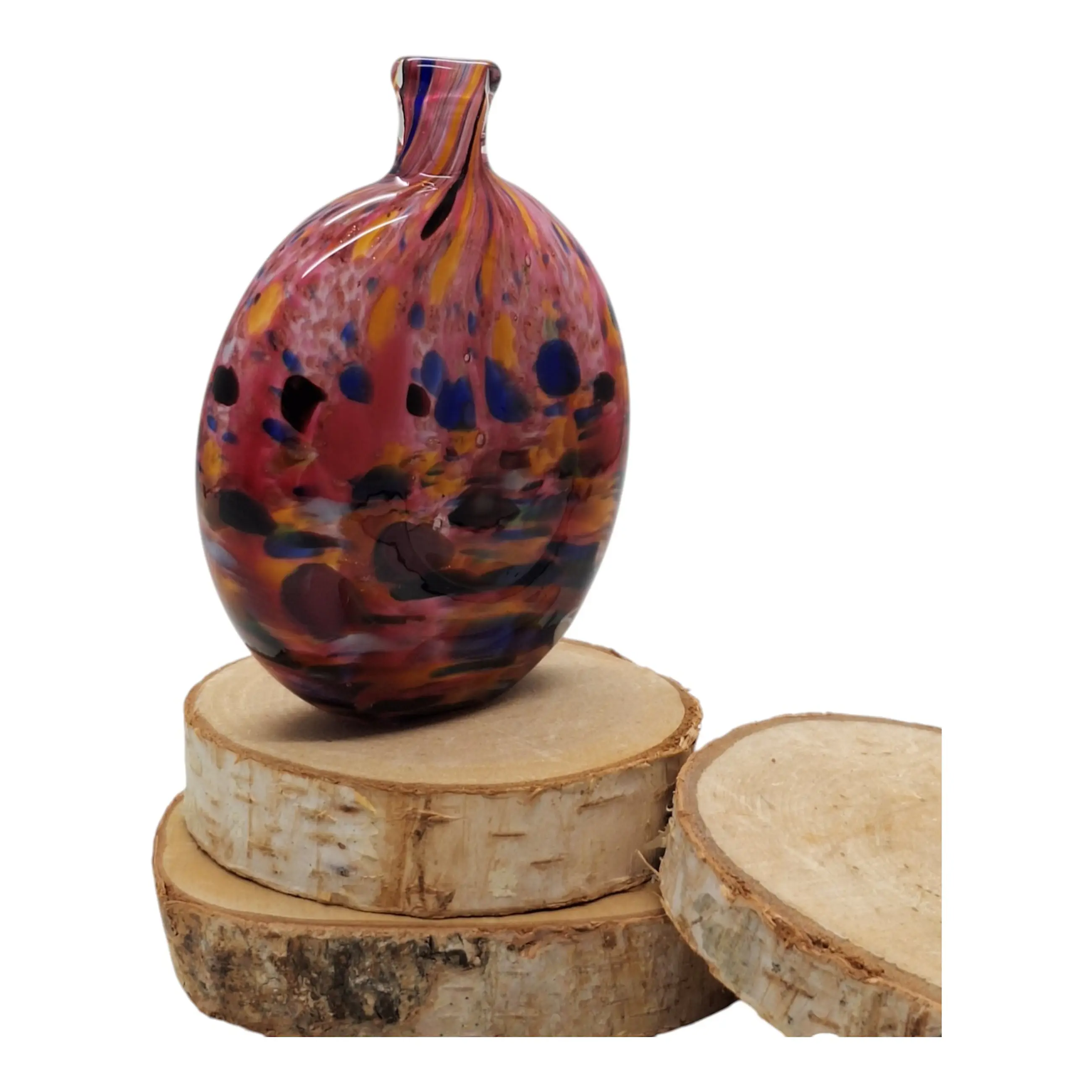 Dit is een handgeblazen glazen vaas met een uniek kleurrijk ontwerp. De vaas heeft een bolvormige basis met een smalle, sierlijk uitlopende hals. Het kleurenpalet bestaat uit een mix van roze, oranje, blauwe en zwarte tinten die in elkaar overvloeien en een abstract, vlekachtig patroon vormen. De vaas heeft meerdere doorzichtige 'vensters', wat een speels effect geeft en de mogelijkheid biedt om de binnenkant gedeeltelijk te zien. Dit object combineert functionaliteit met kunstzinnigheid en zou een opvallend decoratief element in elk interieur kunnen zijn.