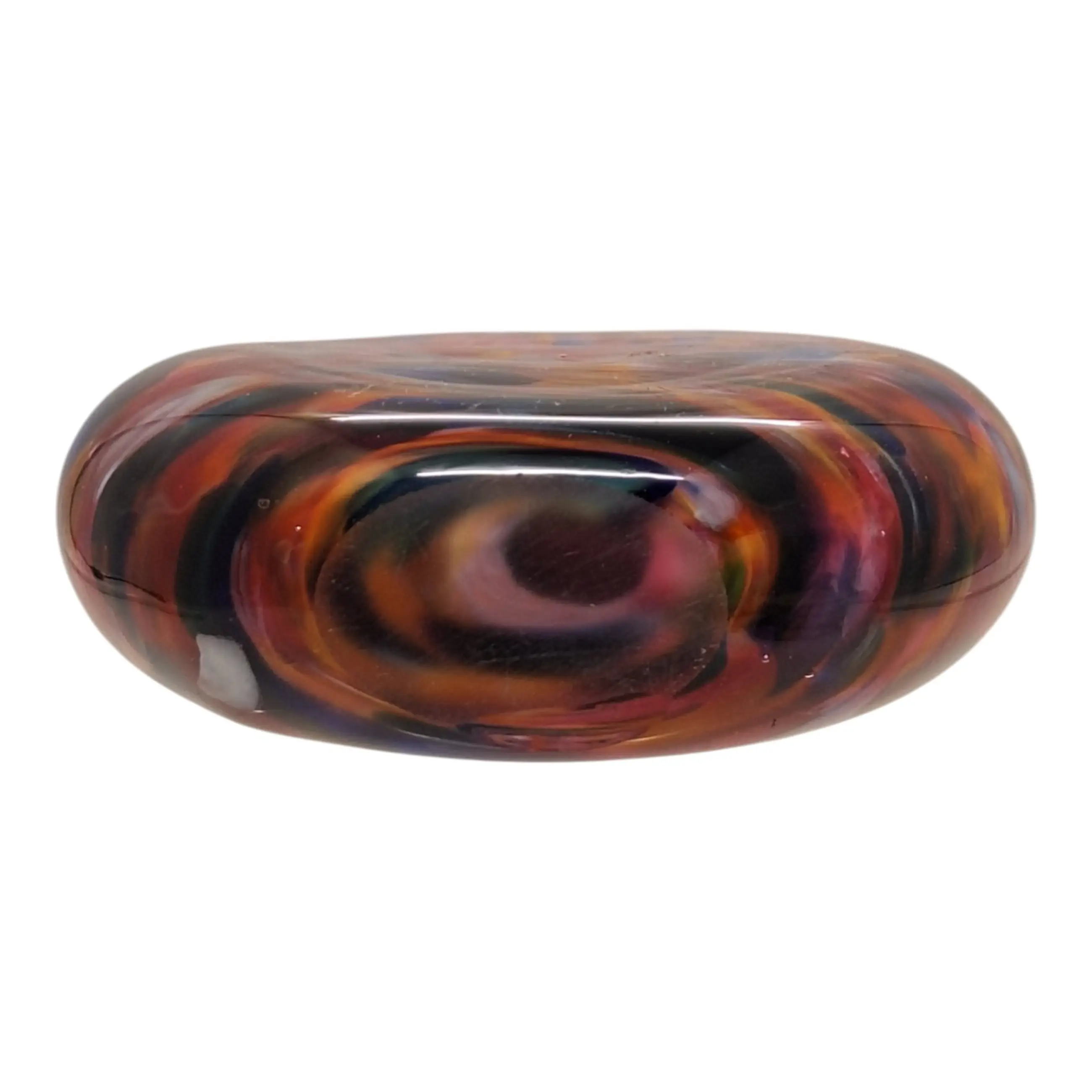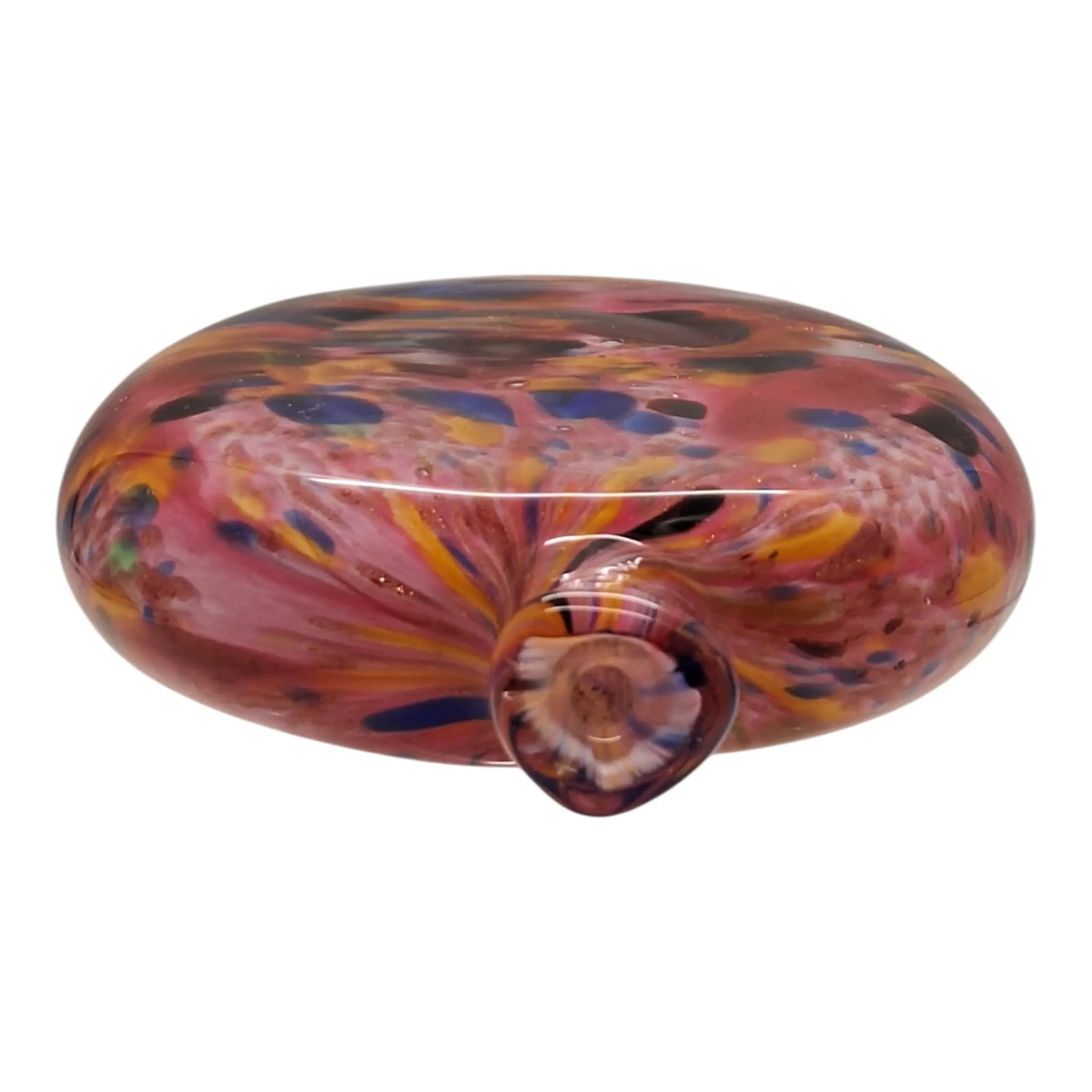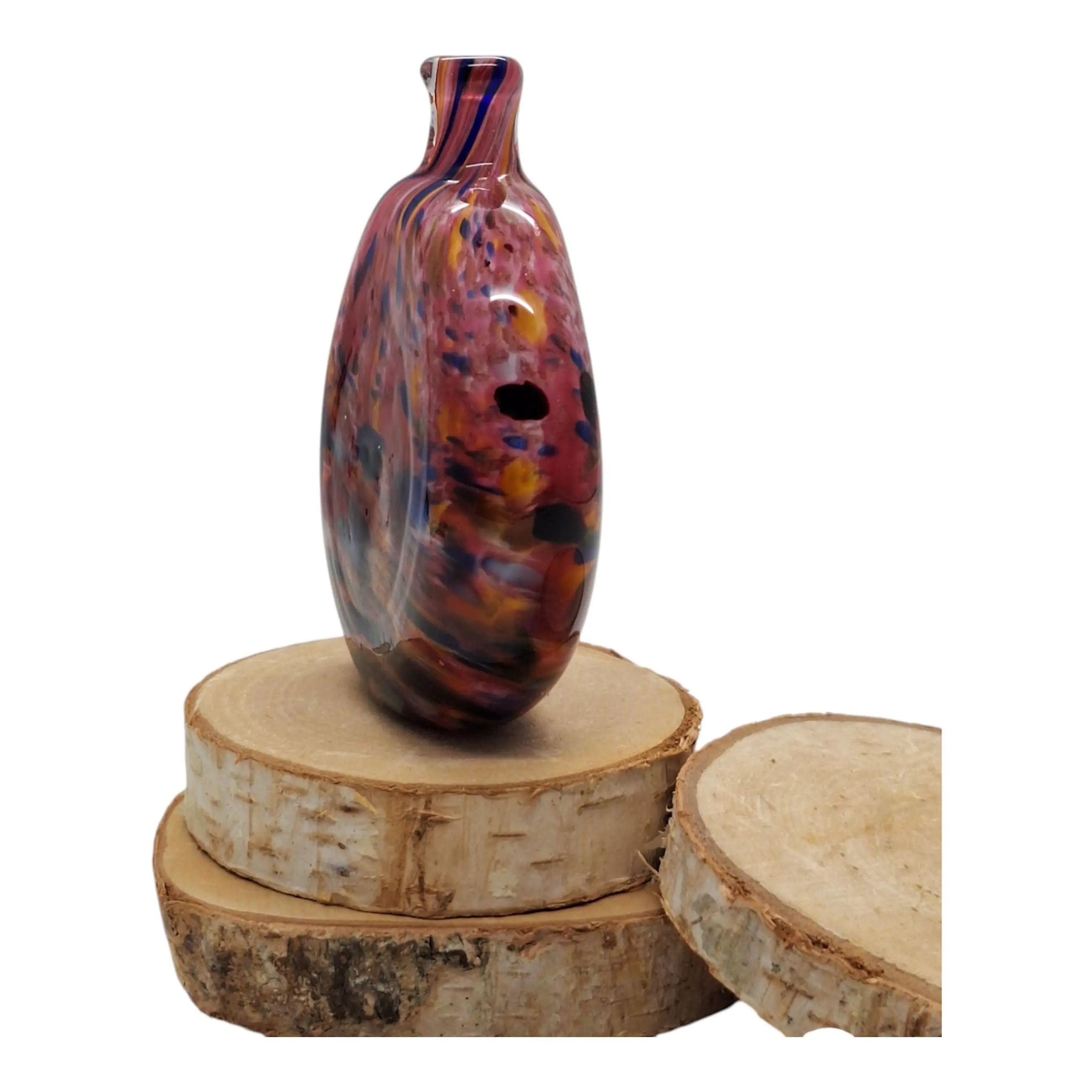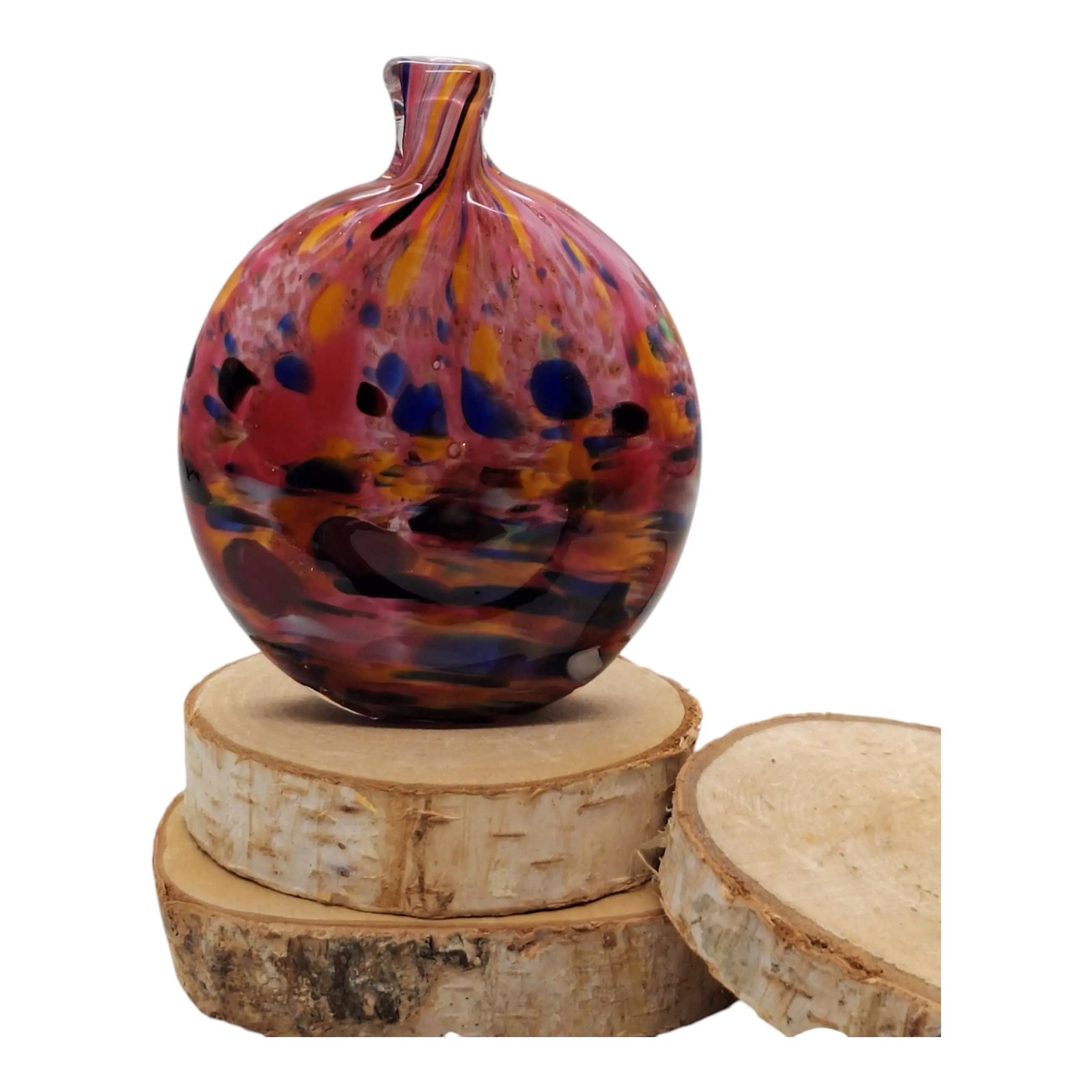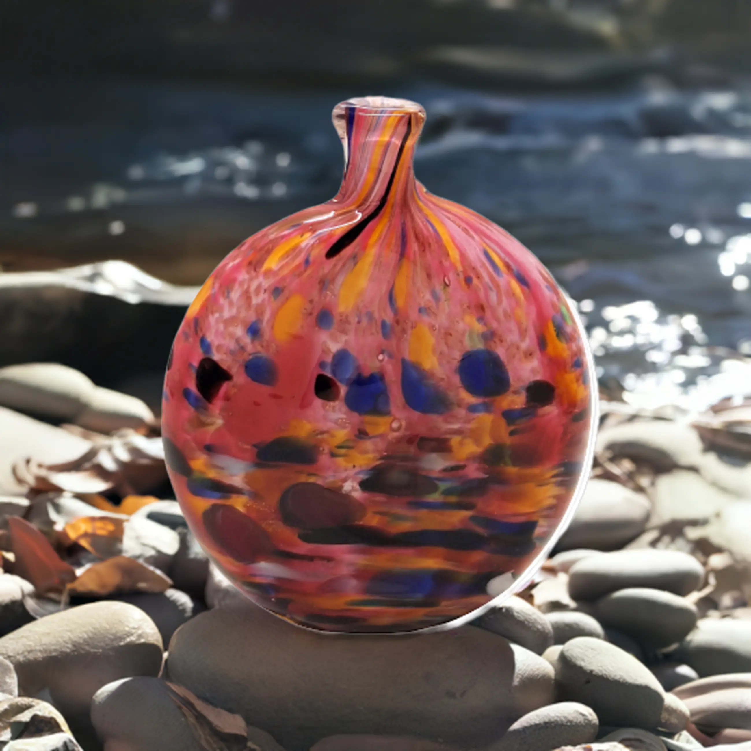Dit is een handgeblazen glazen vaas met een uniek kleurrijk ontwerp. De vaas heeft een bolvormige basis met een smalle, sierlijk uitlopende hals. Het kleurenpalet bestaat uit een mix van roze, oranje, blauwe en zwarte tinten die in elkaar overvloeien en een abstract, vlekachtig patroon vormen. De vaas heeft meerdere doorzichtige 'vensters', wat een speels effect geeft en de mogelijkheid biedt om de binnenkant gedeeltelijk te zien. Dit object combineert functionaliteit met kunstzinnigheid en zou een opvallend decoratief element in elk interieur kunnen zijn.