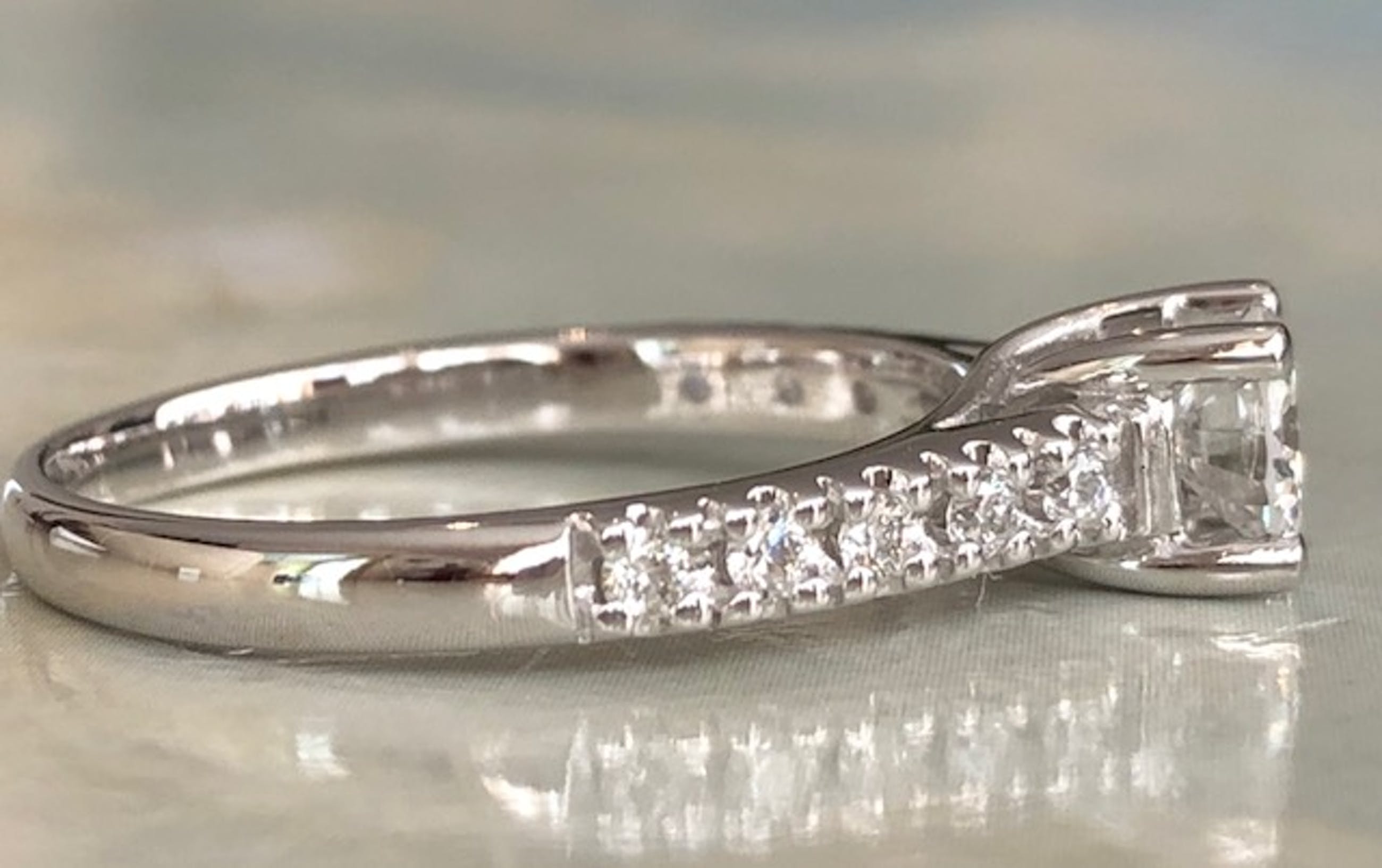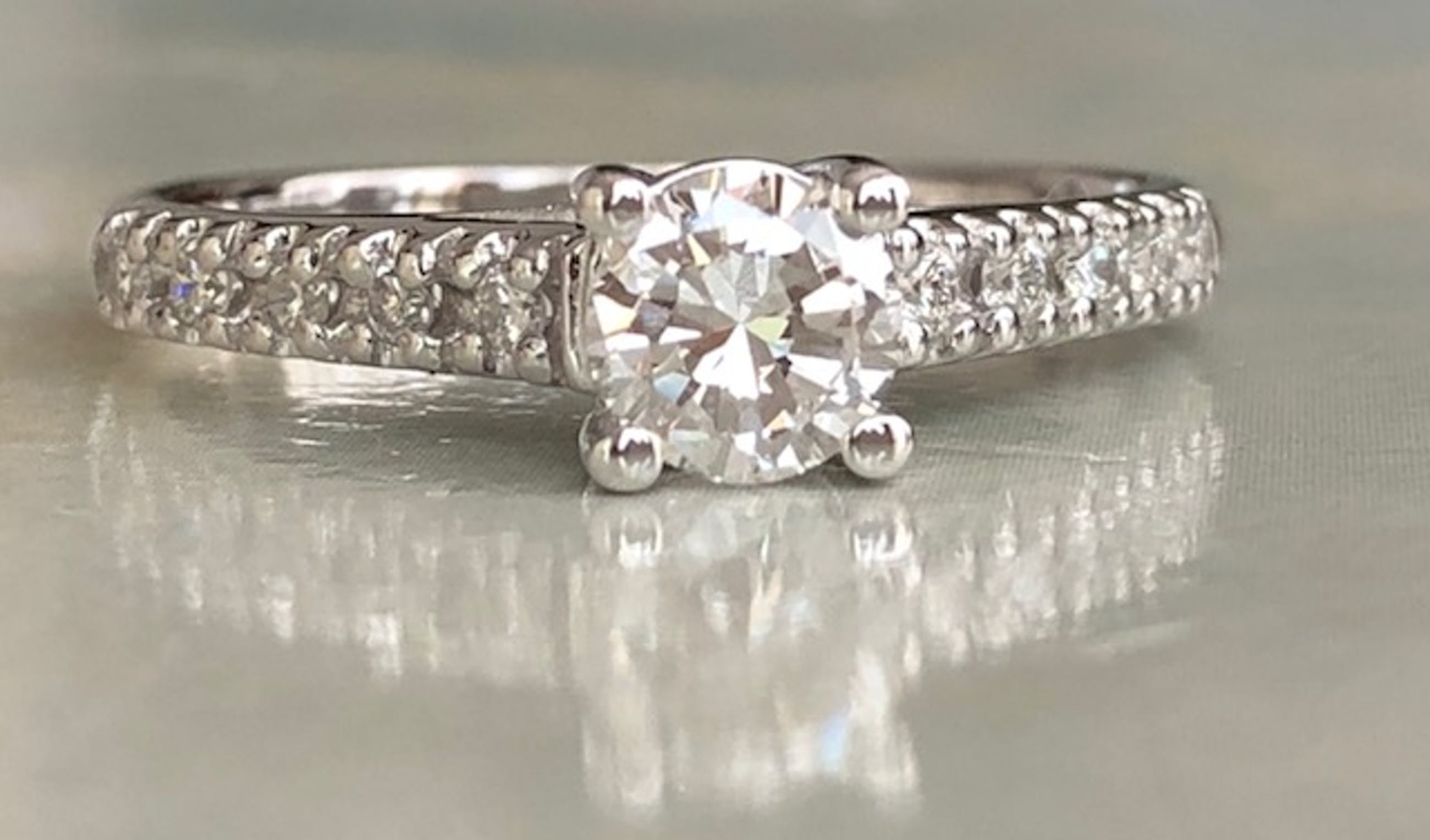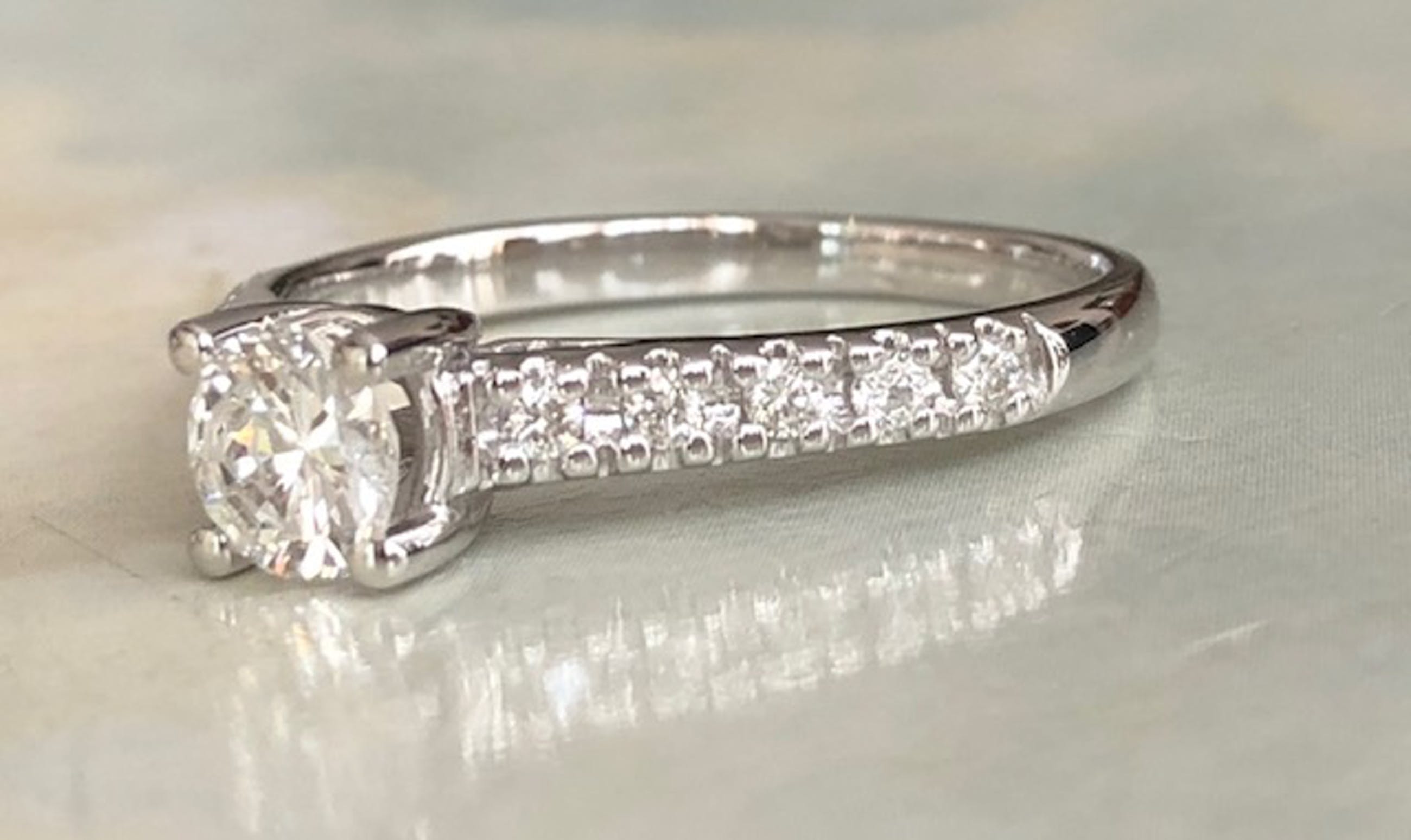 In goede staat aangeboden 14 karaats witgouden solitair ring met een 0.20 crt briljant geslepen diamant van kwaliteit H/VS/SI en 8 stuks briljant geslepen diamanten in totaal ca 0.16 crt H/SI. Totaal: ca 0.36 crt H/VS/SI. Gehalte: 14 KT (gestempeld 585). Gewicht: 2,1 gram Ringmaat: 16,50mm ( kan op maat maken)