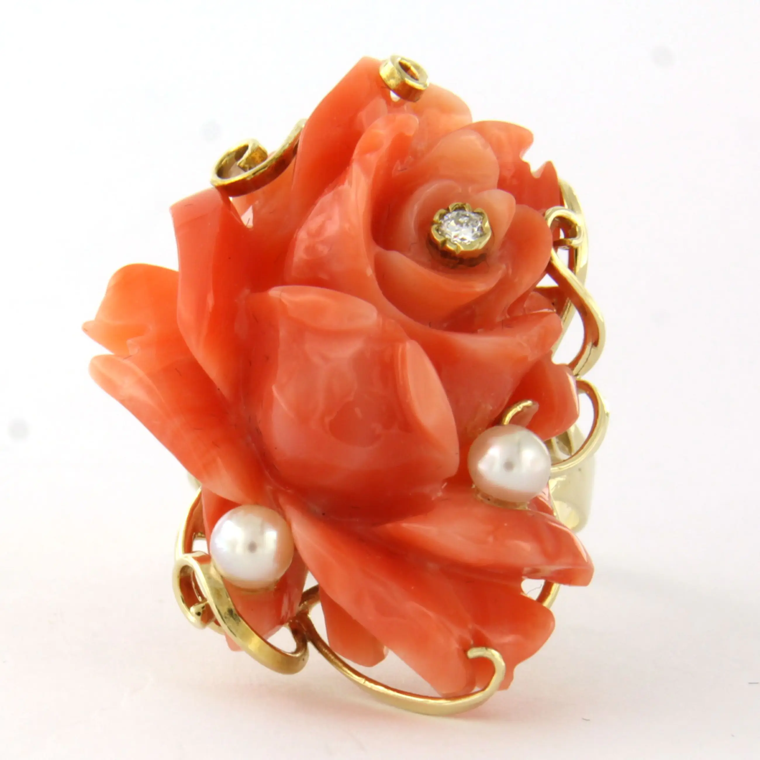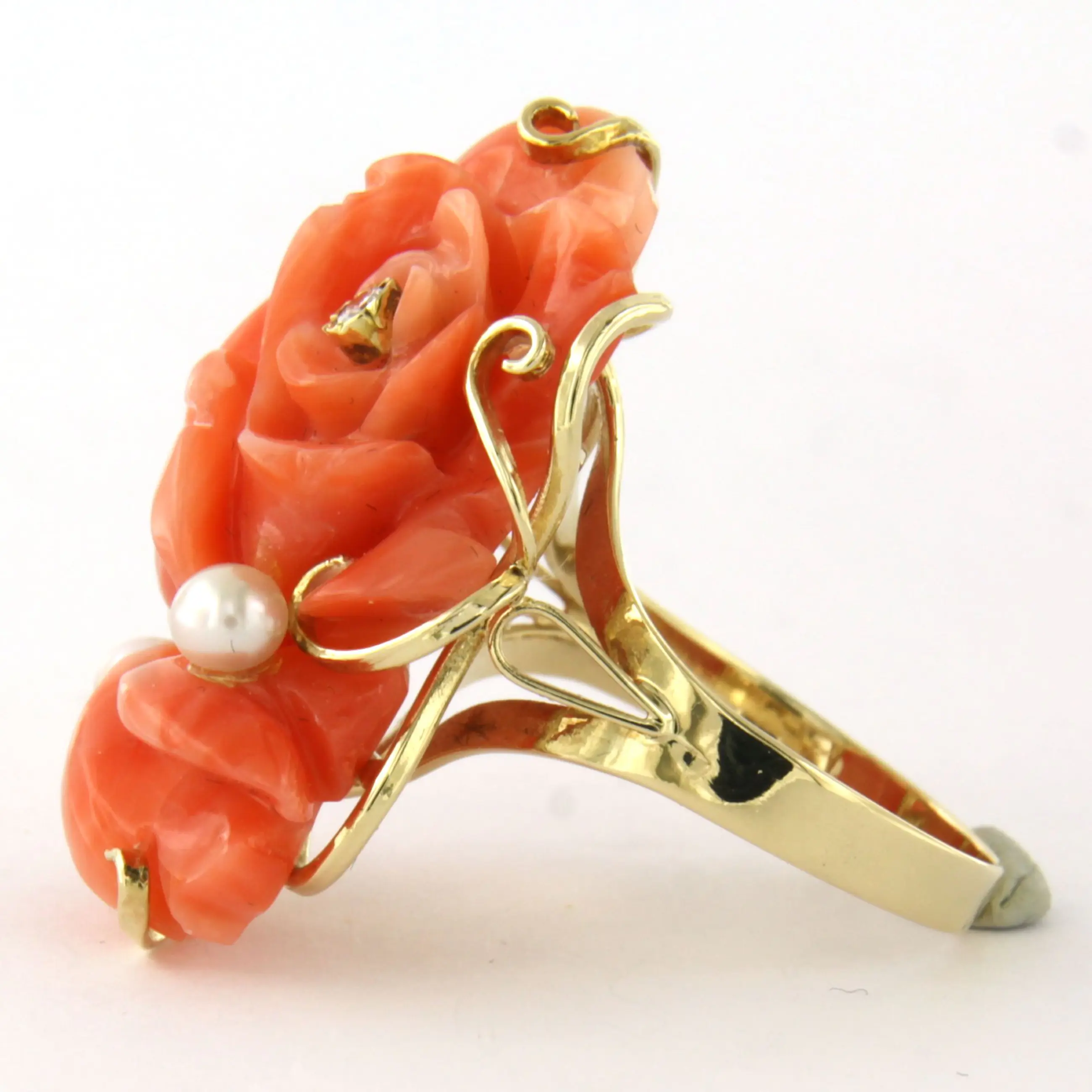 14k geel gouden ring bezet met koraal, parels en briljant geslepen diamant tot. 0.05ct - F/G - VS/SI - ringmaat 17.5(55)