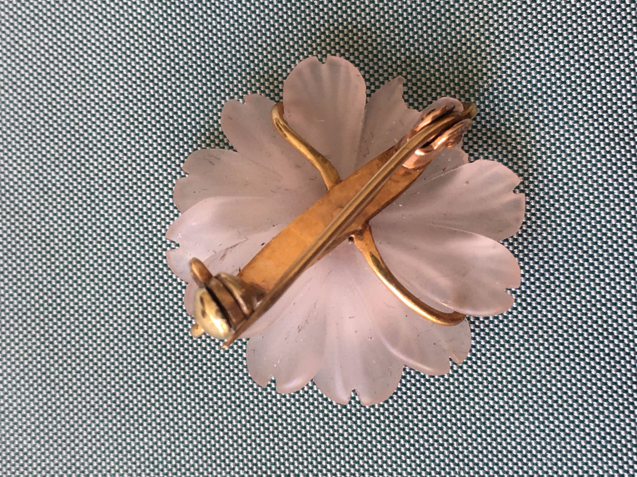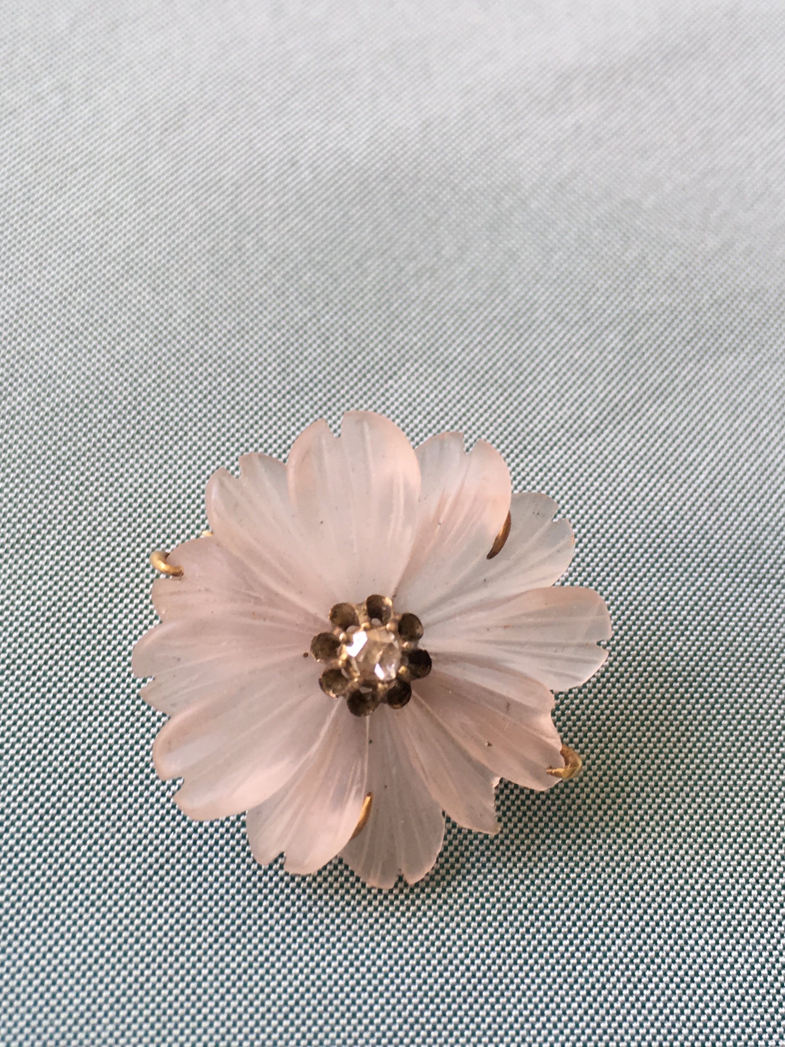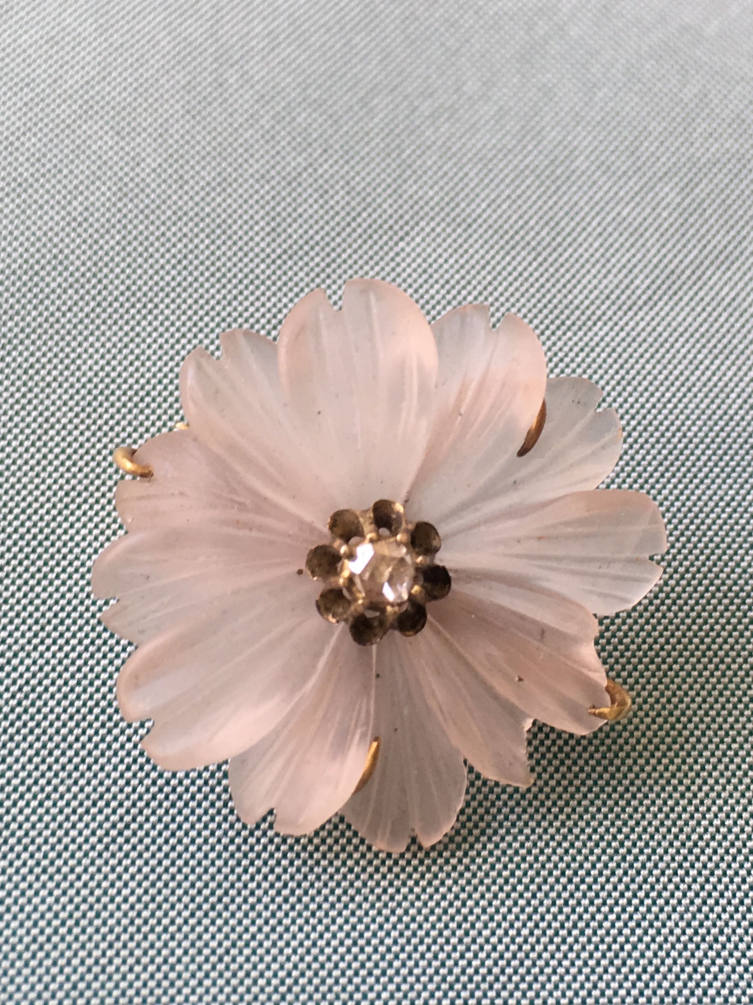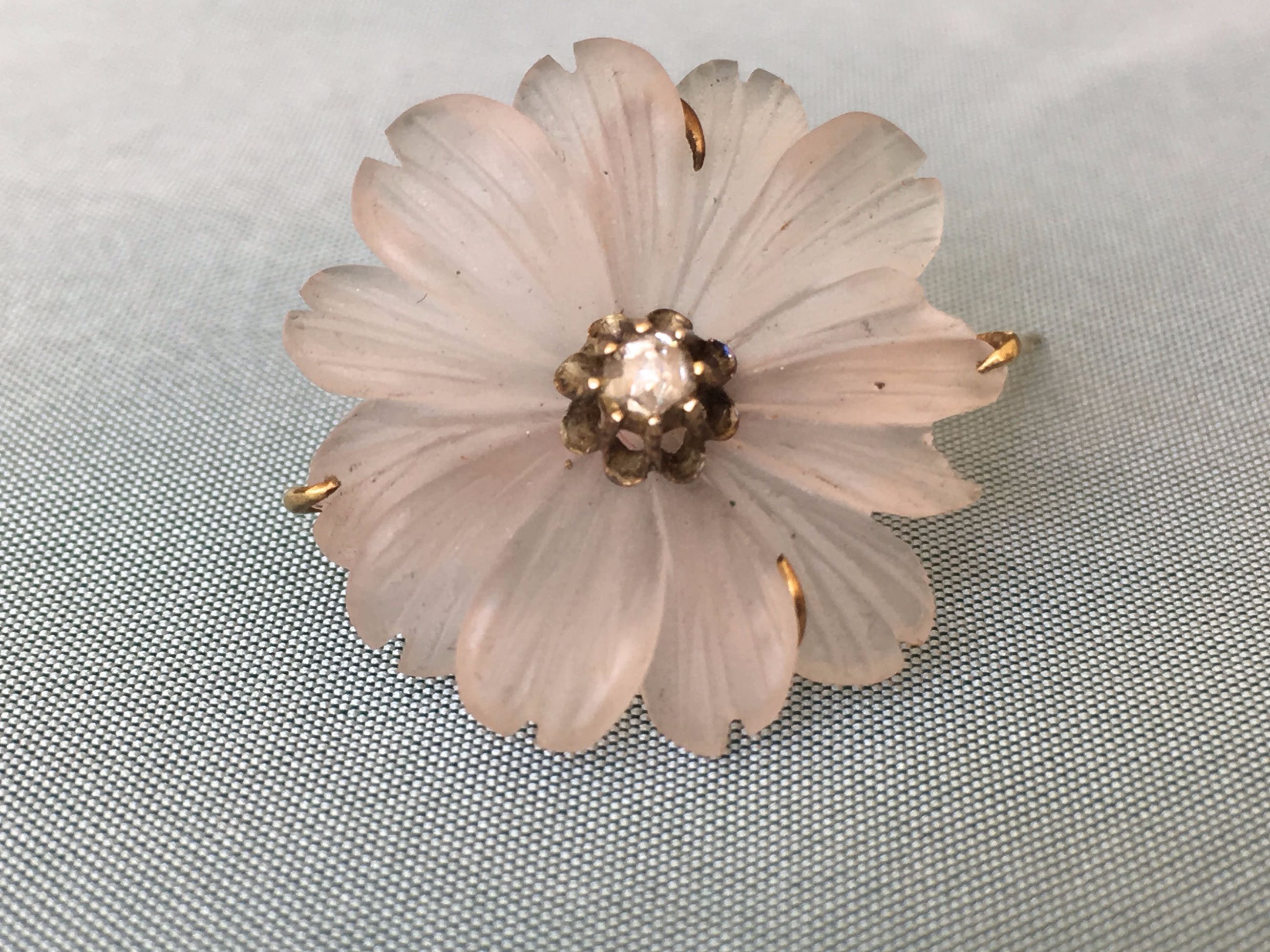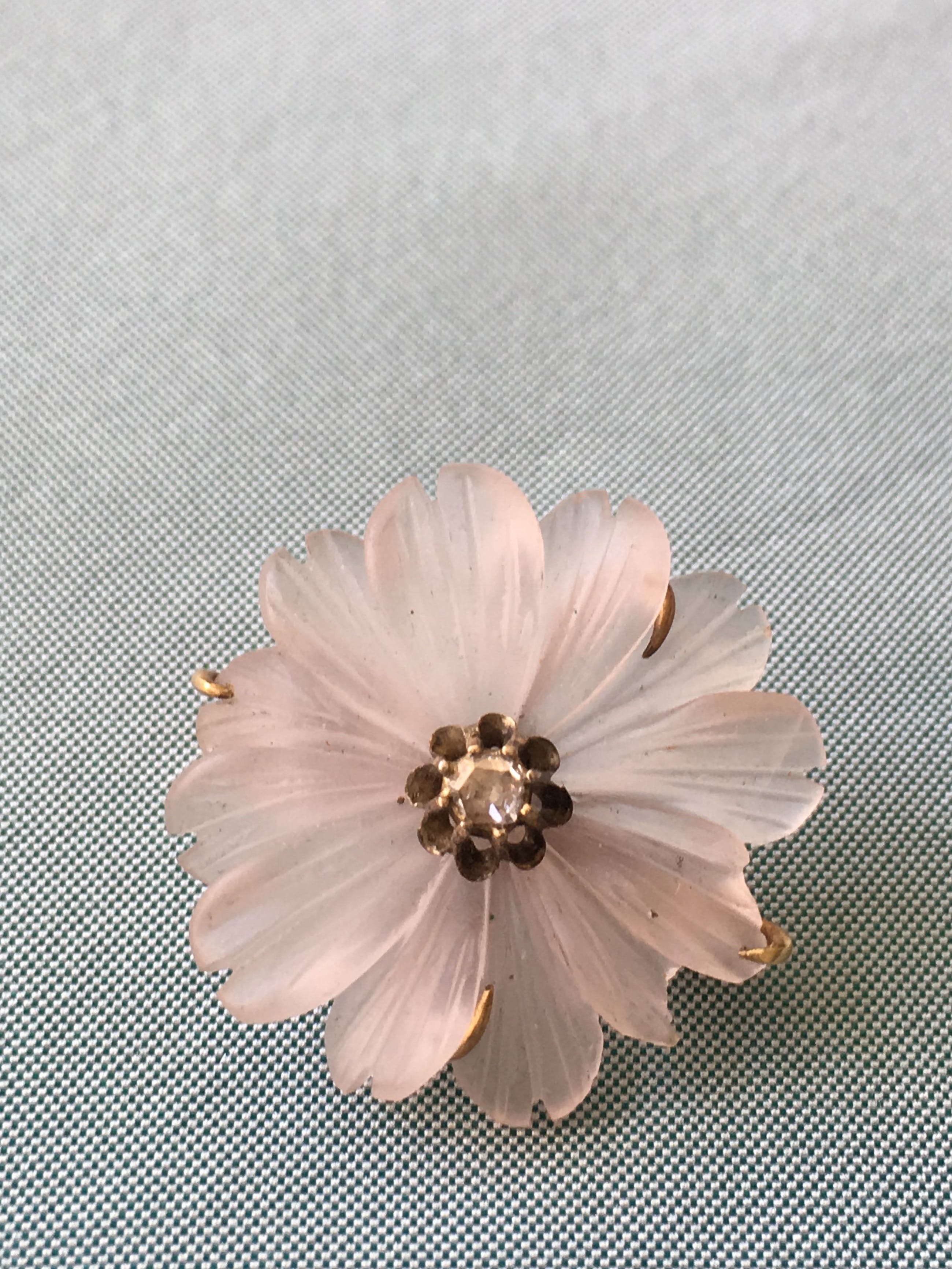 Een vintage broche in de vorm van een madelief bloem bezet met een roosgeslepen diamant in het midden in een chaton zetting. De bloem is gesneden uit rozenkwarts en zeer licht roze van kleur. Een blaadje mist een klein stukje, maar valt nauwelijks op (zie foto's). De broche verkeerd in goede staat, is getoetst op 14 karaat goud, maar niet gekeurd.De diameter is ca. 23 mm en het gewicht is 3.5 gram.