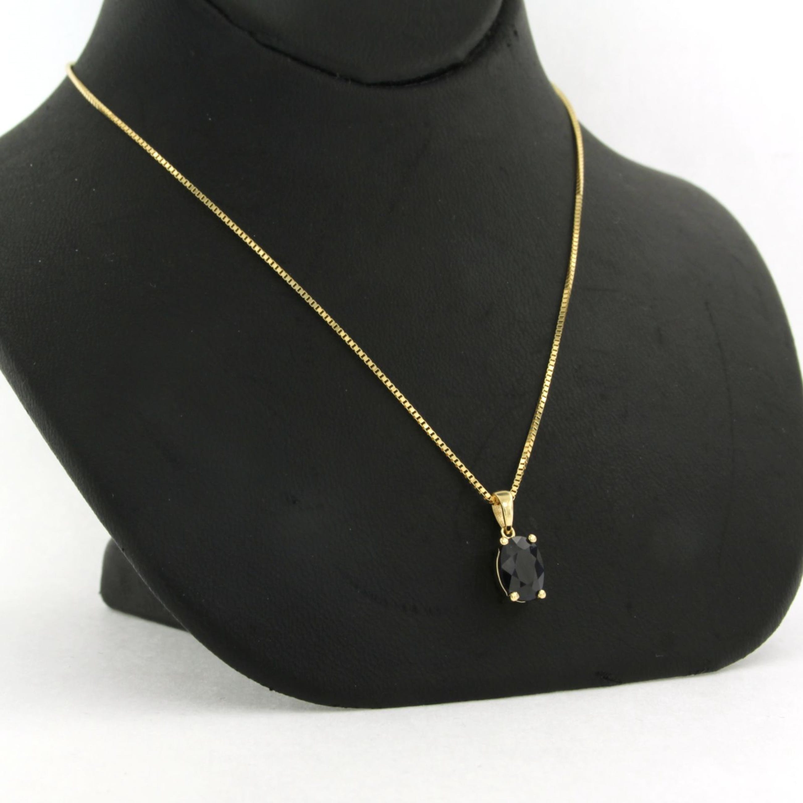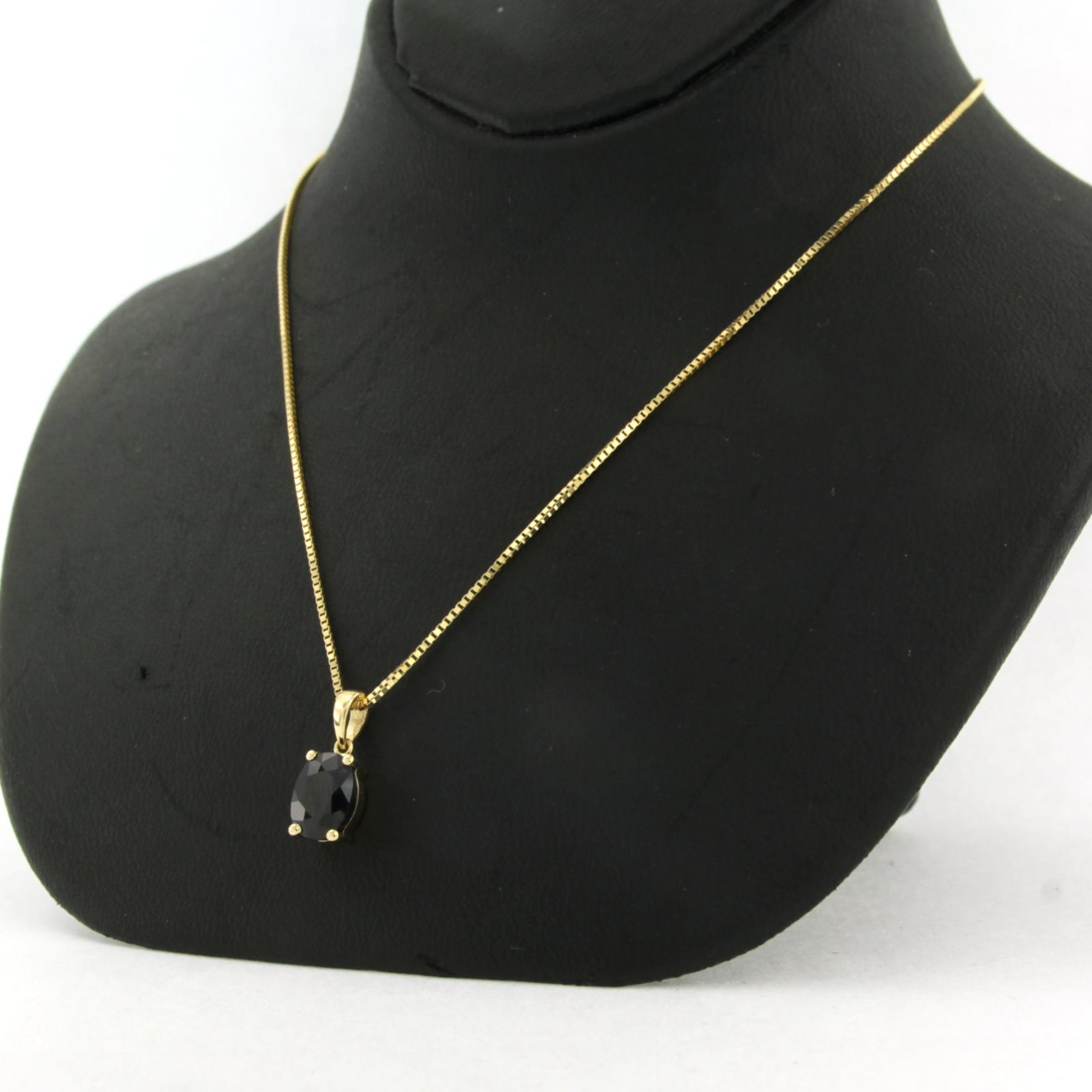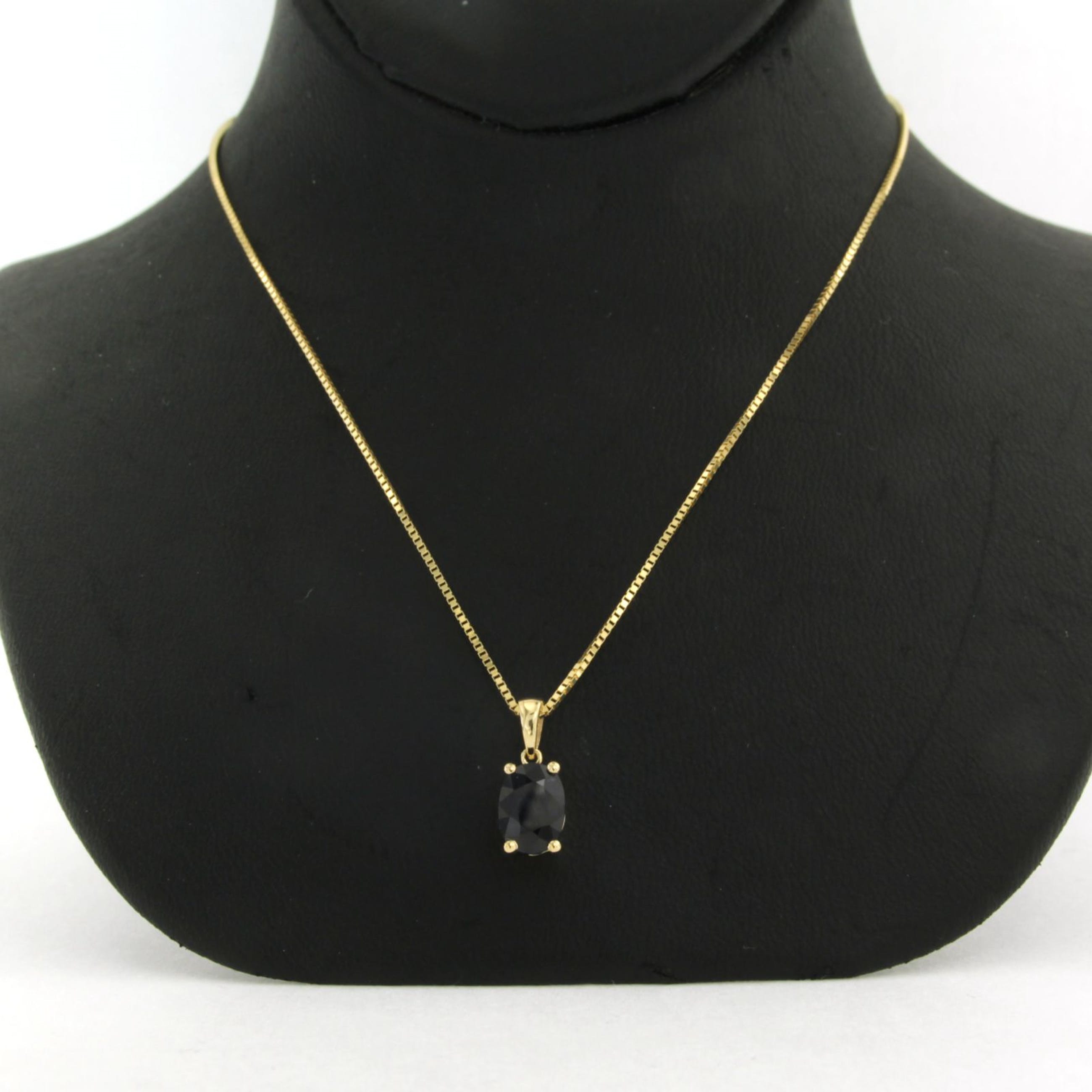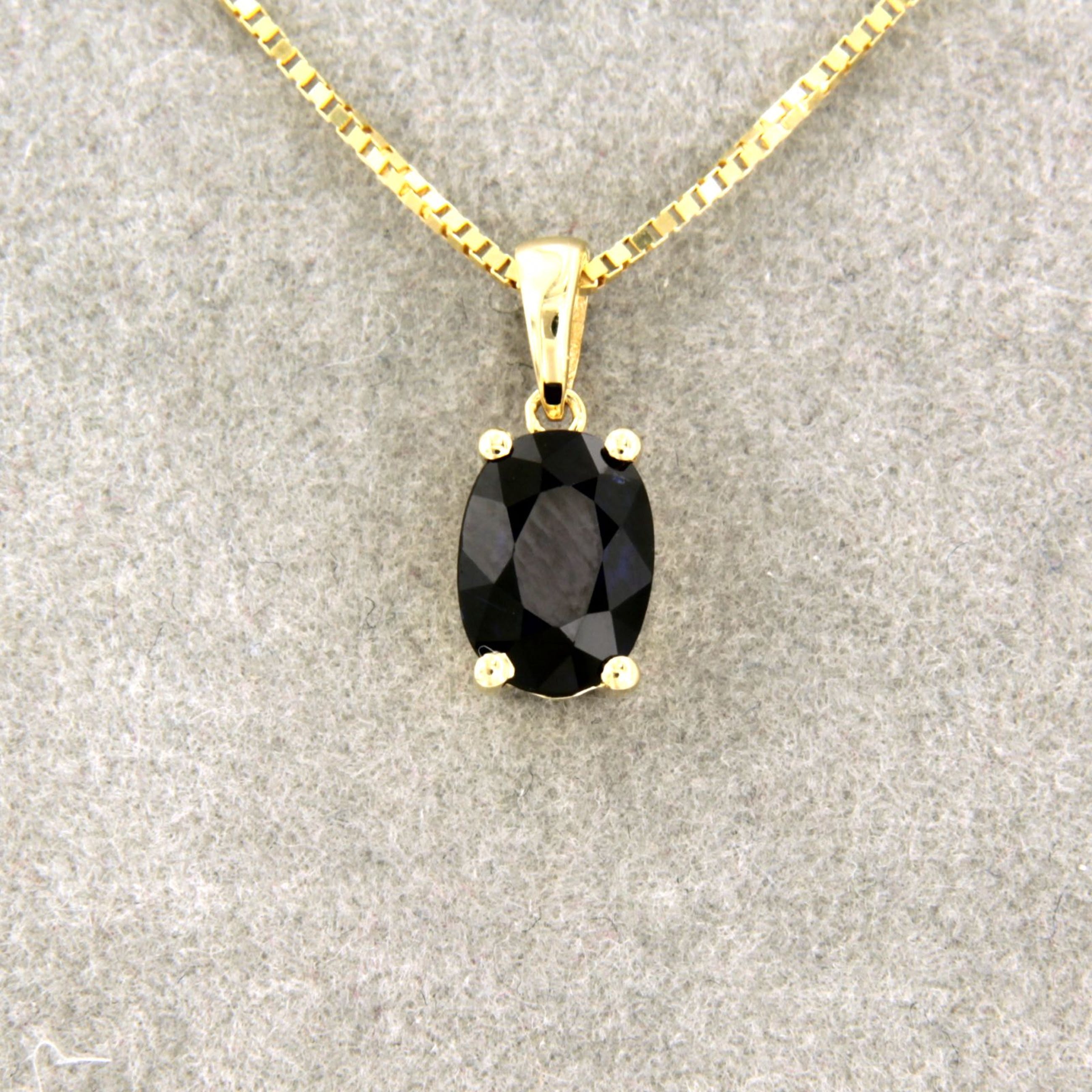 Geelgouden natuurlijke saffier hanger van 0.95 ct. De saffier is ovaal geslepen. De hanger is gekeurd voor 14 karaat goud op het oog naast veerringslot.
