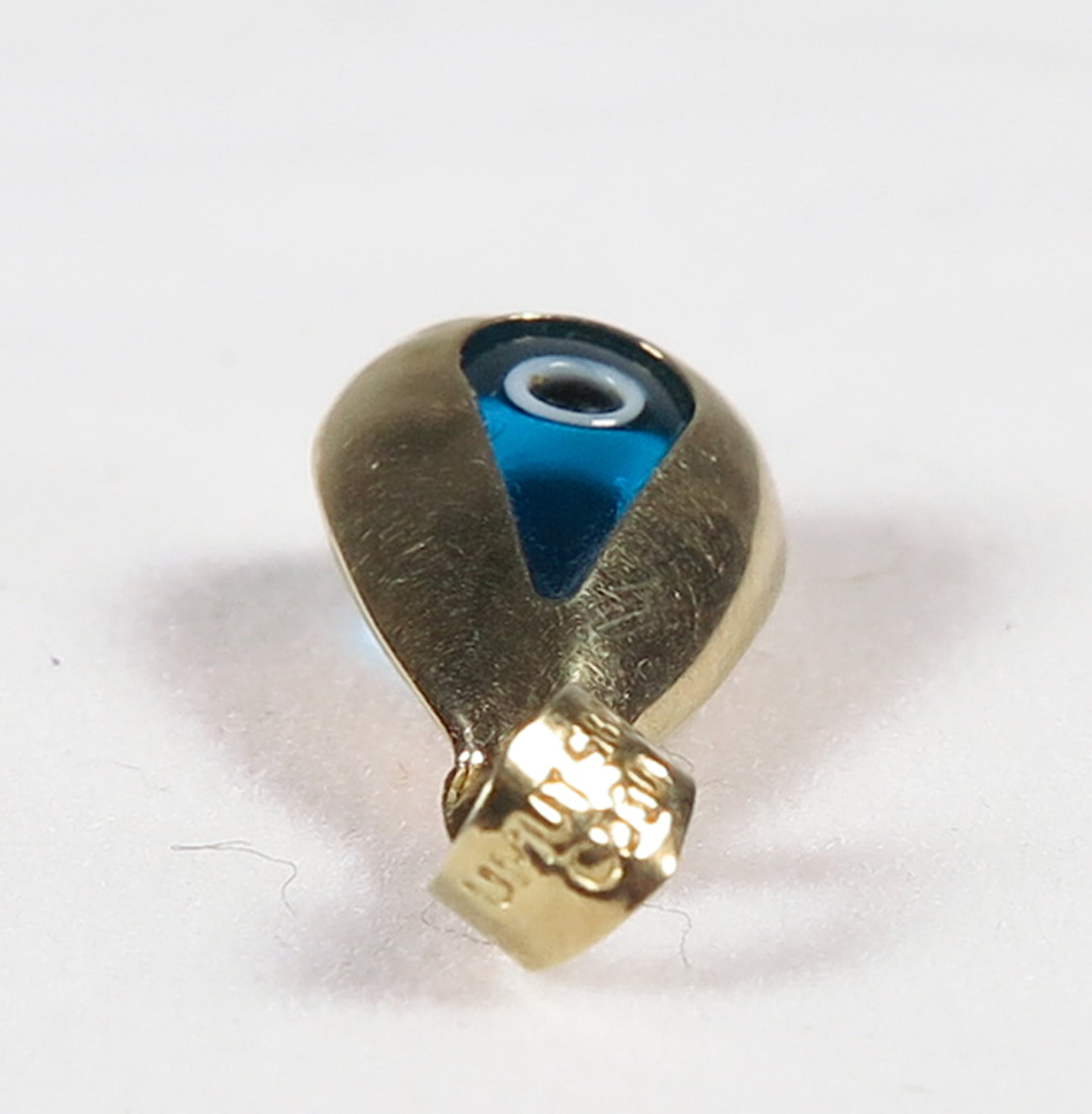 14K gouden hanger bezet met een glazen Turks oog/Nazar. Het vermelde gewicht is inclusief het oog. De afmetingen zijn zonder de ring waar de ketting doorheen moet.