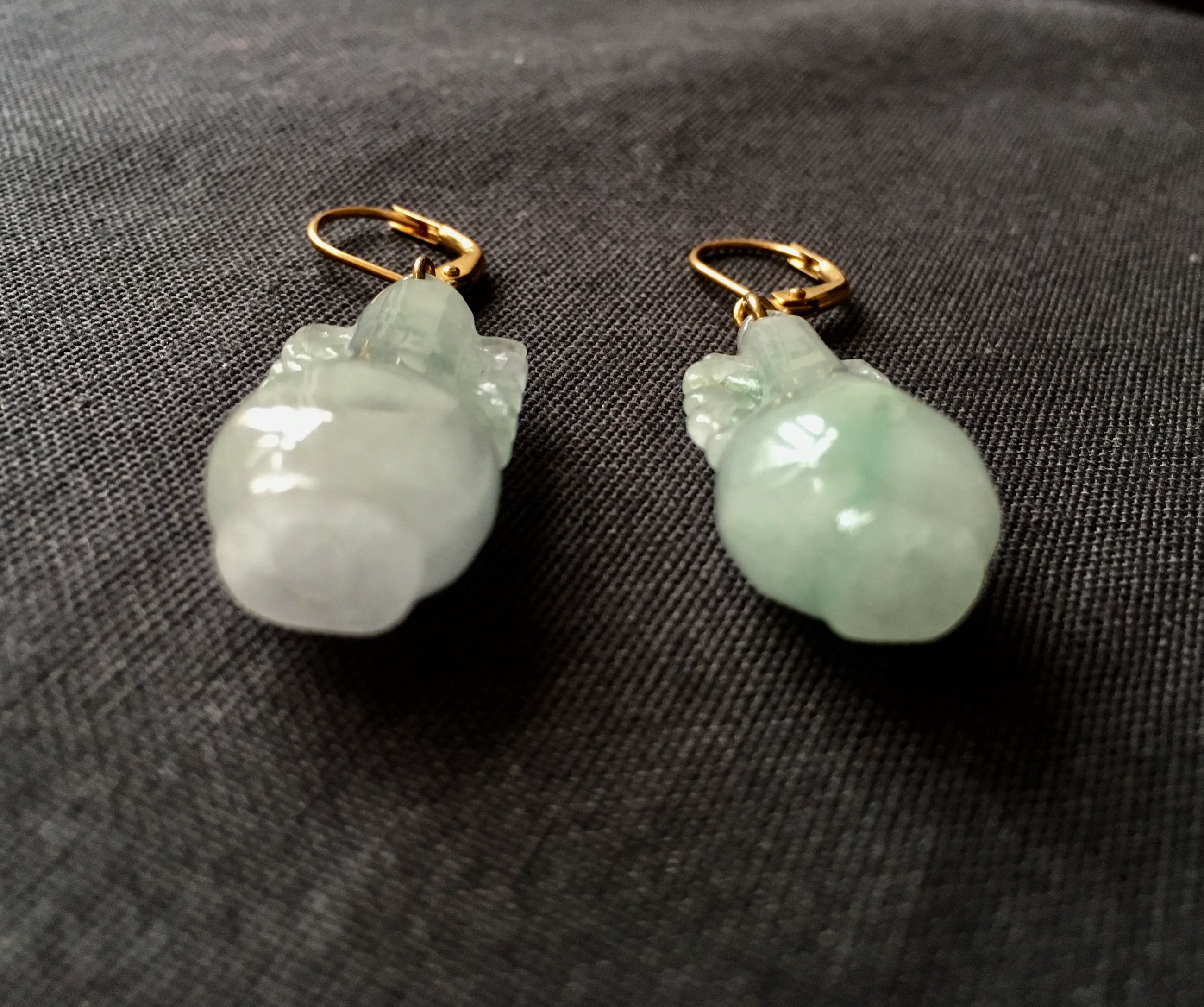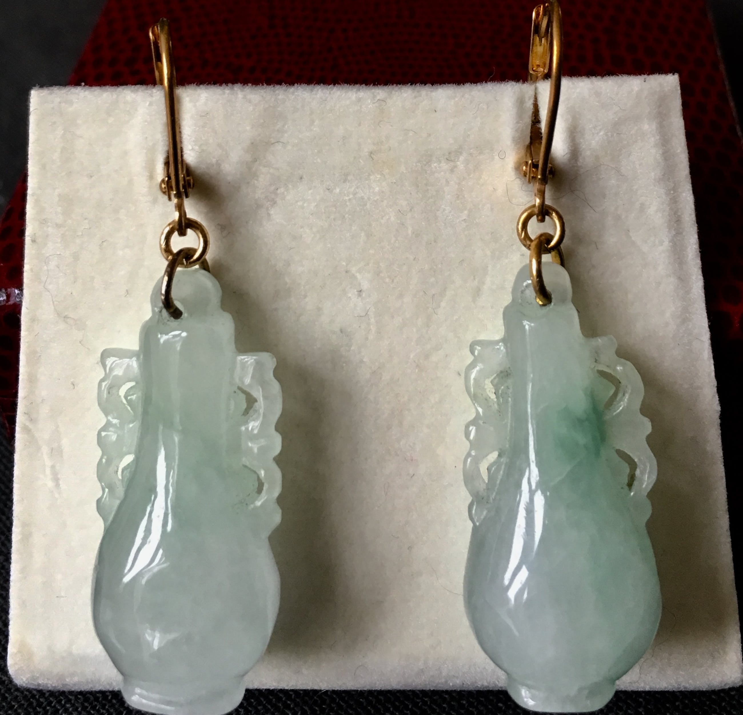 Handgesneden licht groene jadeiet jade oorhangers in de vorm van vaasjes aan een vergulde haak, klapbrisure model. N.B. de haken zijn double verguld 14 k, geen goud.