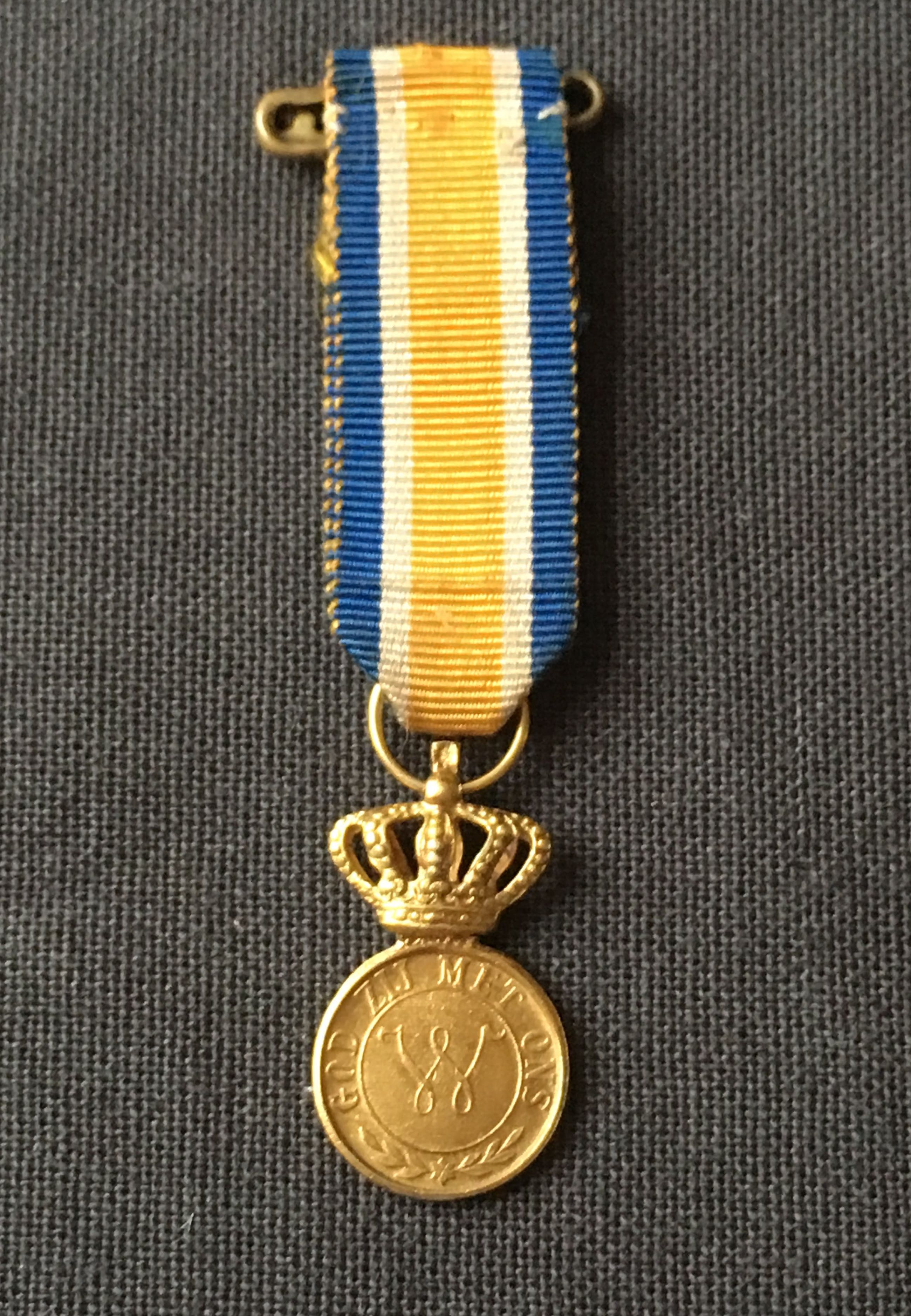 Een onderscheiding aan een origineel met oranje lint, een geelgouden Willemsorde.Op de voorzijde een letter W en het opschrift: 'God zij met ons' op de achterzijde een malthezer kruis met de Nederlandse leeuw en het opschrift rondom:' Je maintiendrai' Gekeurd op het contra-oog met officieel Nederlands eikenblad 585, voor 14 karaat goud.Hoogte van de onderscheiding incl oog: 3 cm, incl. lint: 6 cm., diameter: 13 mm.