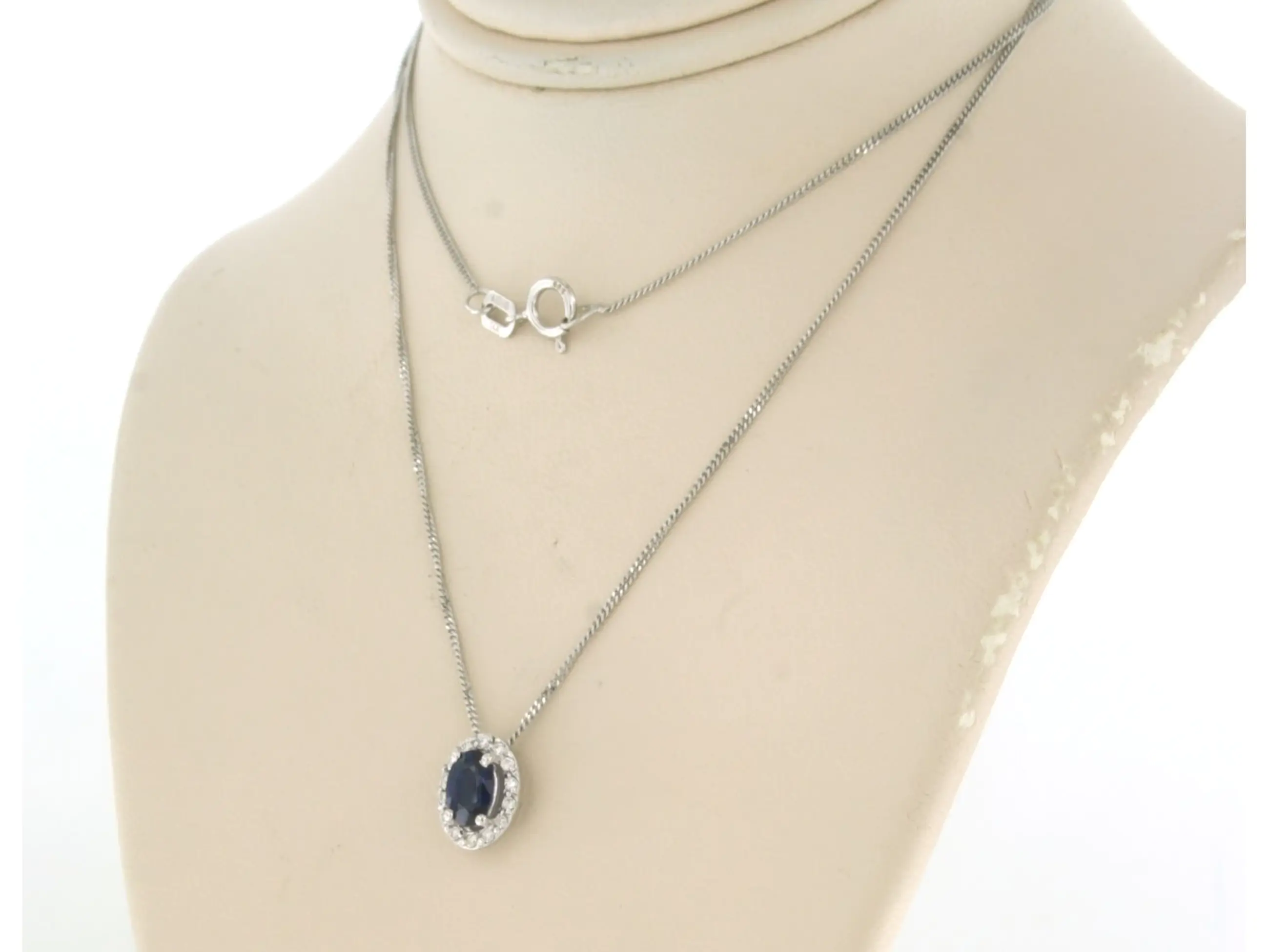 14k witgouden collier met een entourage hanger bezet met saffier tot. 0,46ct en aan entourage briljant geslepen diamanten tot. 0,07ct - F/G - VS/SI - 45 cm lang
