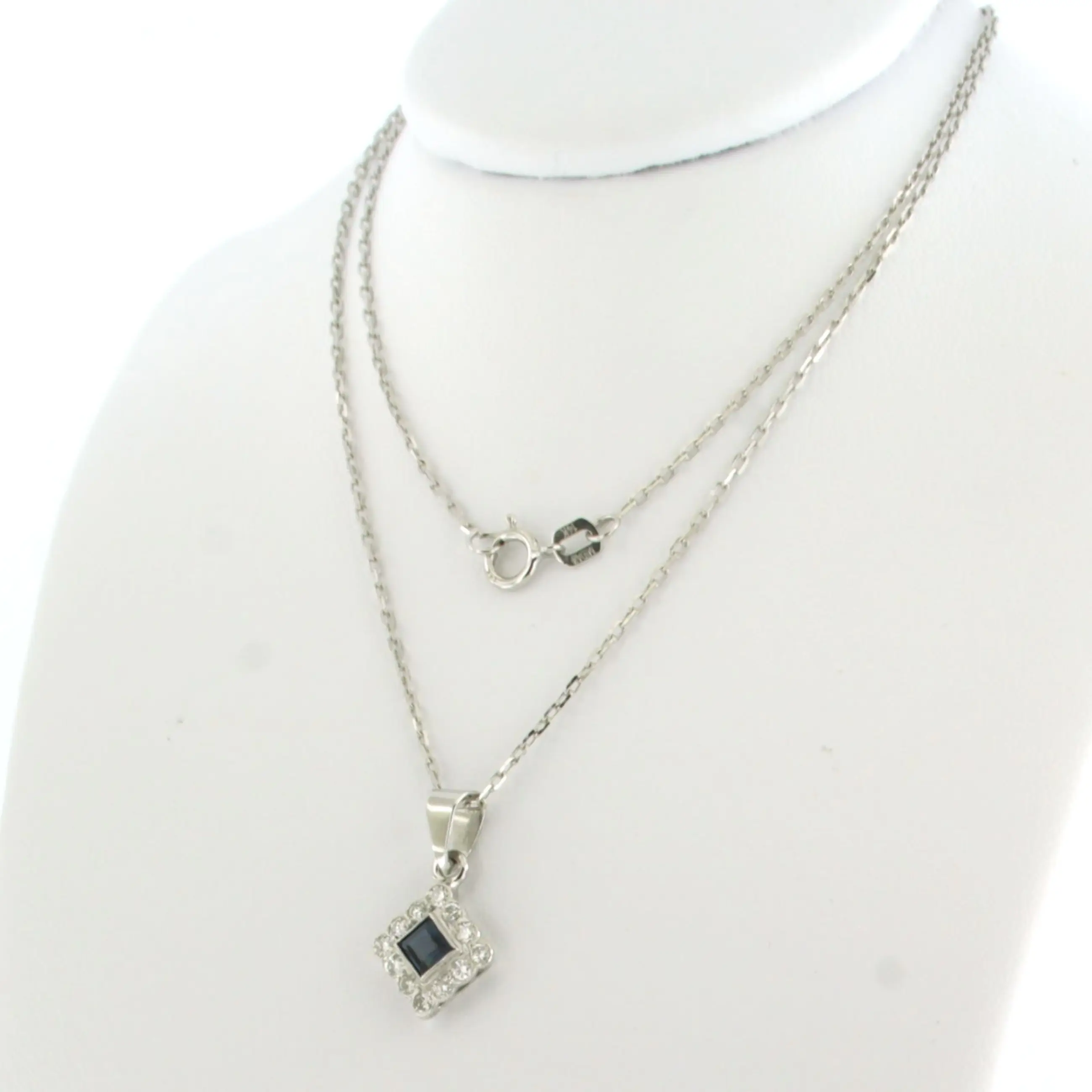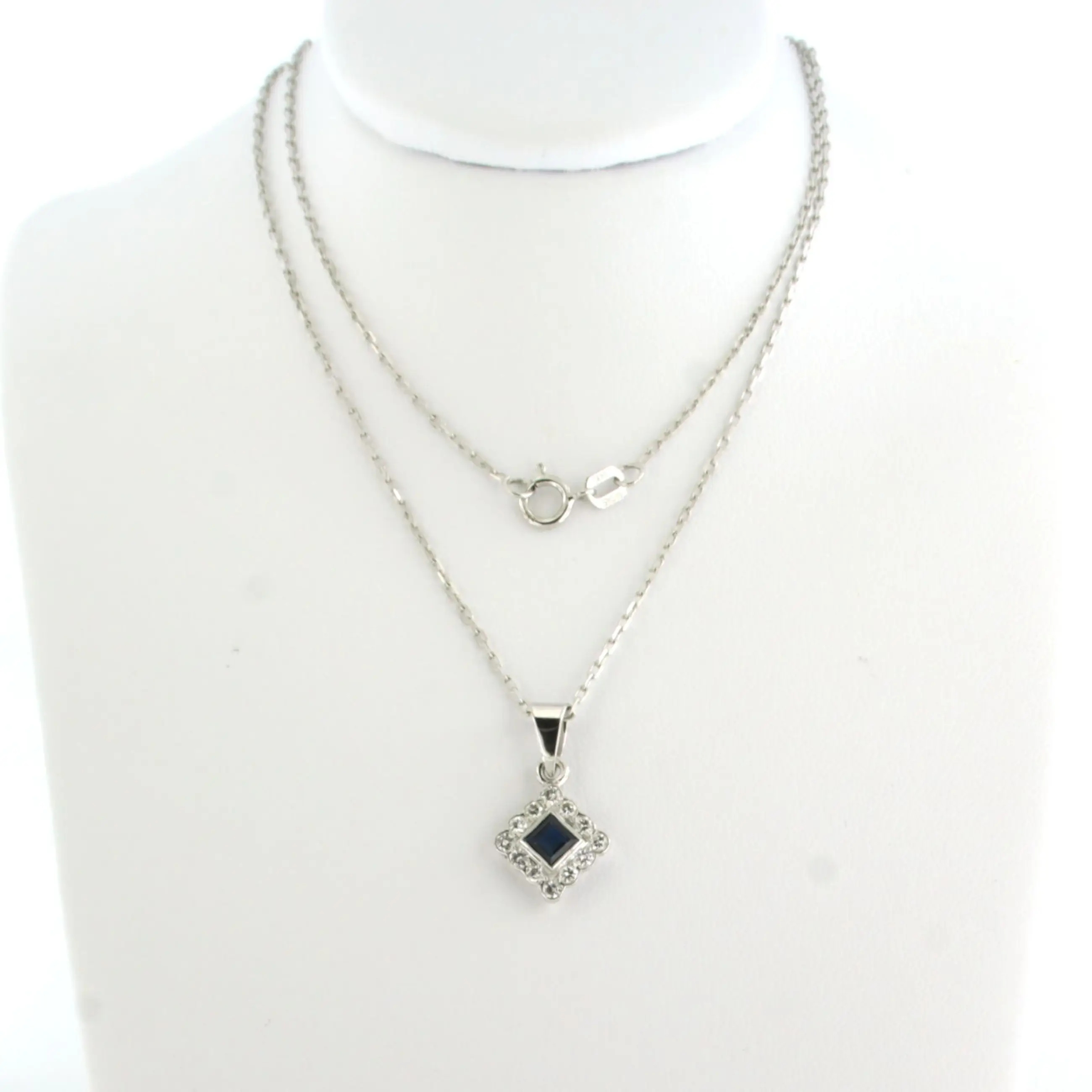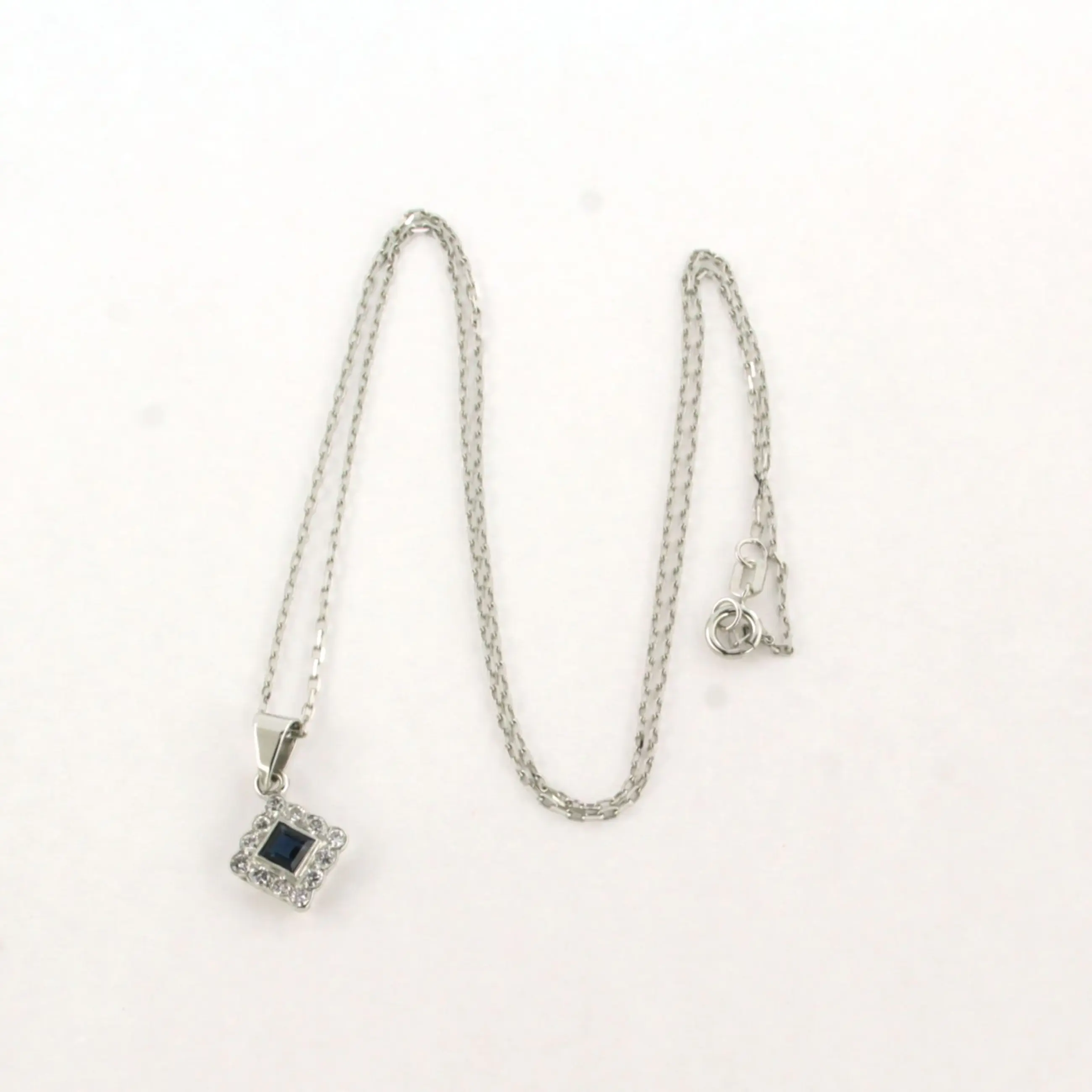 14k wit gouden collier met hanger bezet saffier en briljant geslepen diamanten tot. 0,24ct - F/G - VS/SI - 45 cm lang