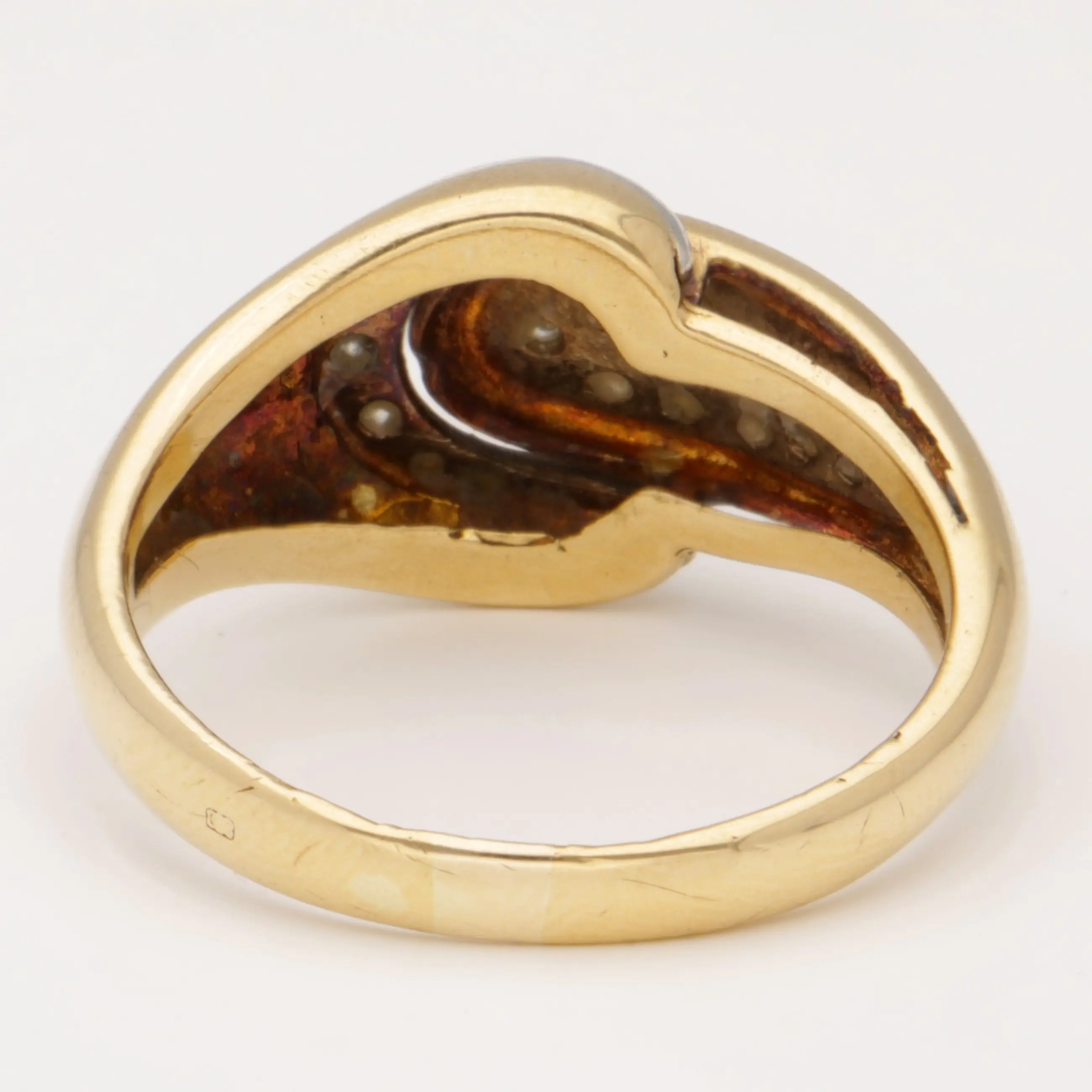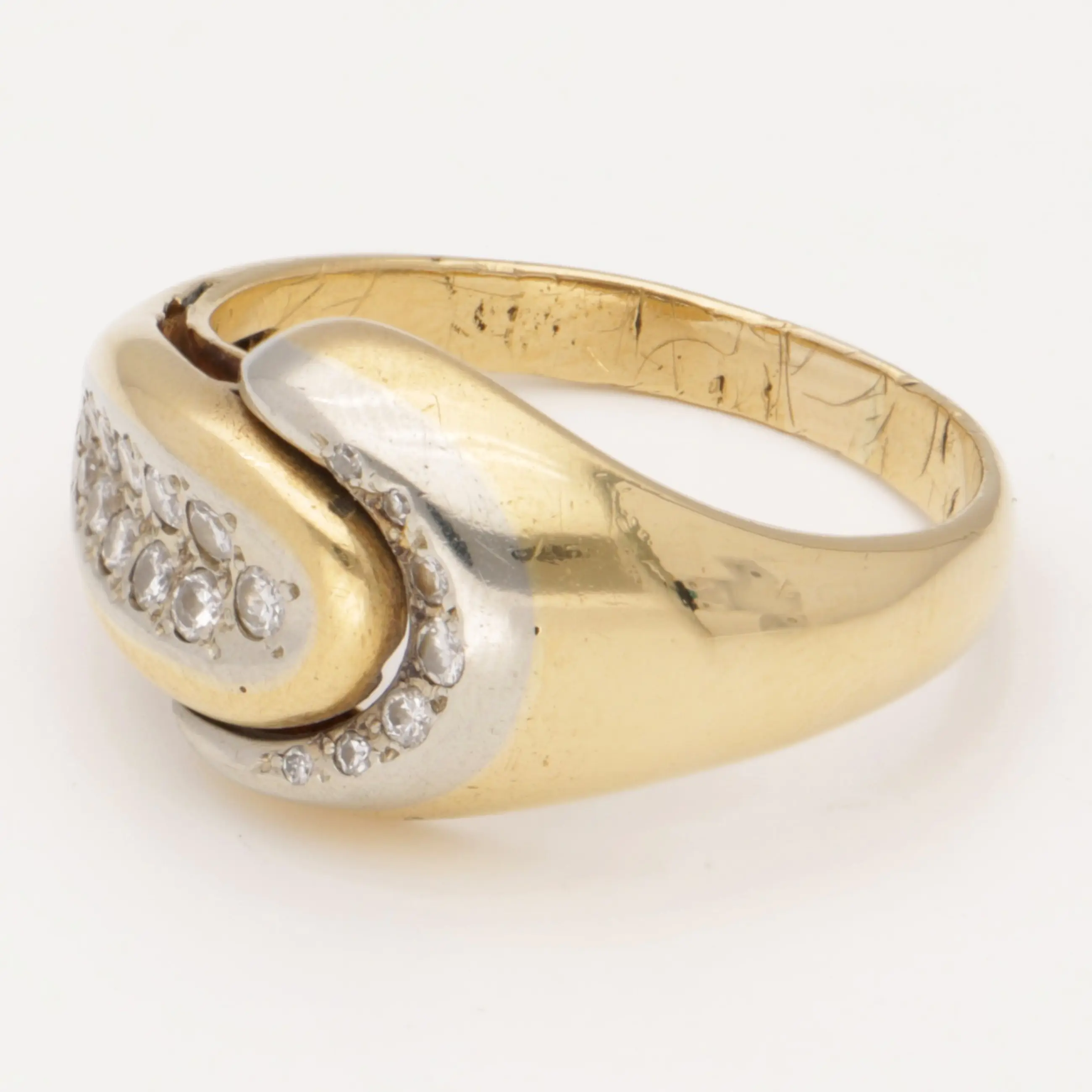 18 karaat bi-color gouden ring bezet met 19 briljant geslepen diamanten van totaal ca. 0.17 ct., welke gezet zijn in een open pavé zetting. De ring is vervaardigd uit geelgoud en het middenstuk is voorzien van een witgoud vervaardigd detail.