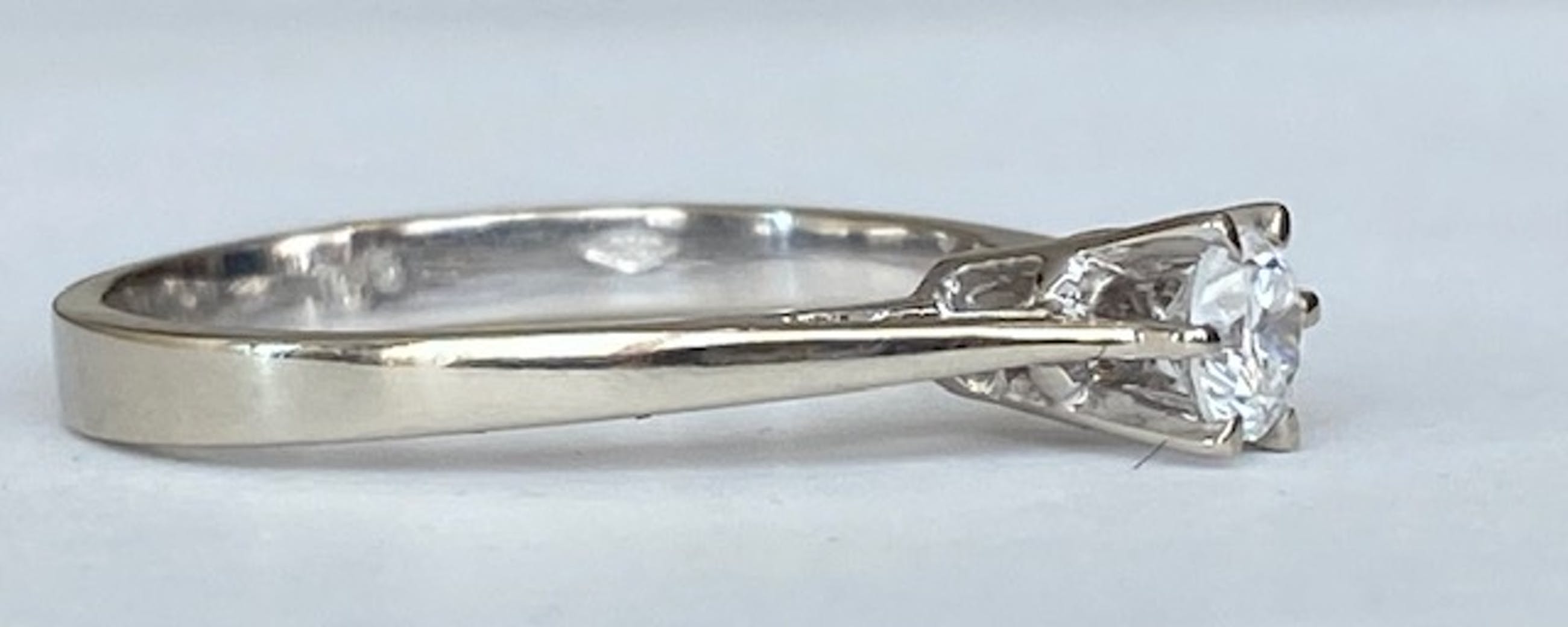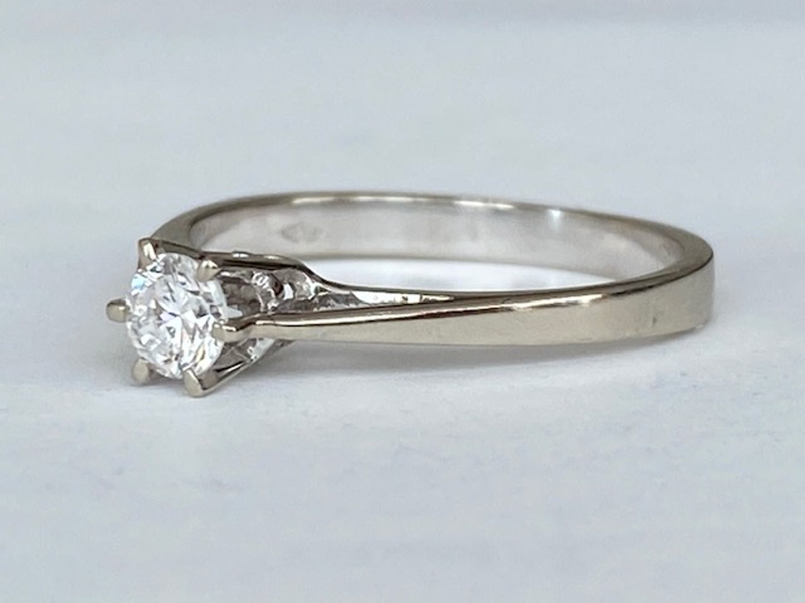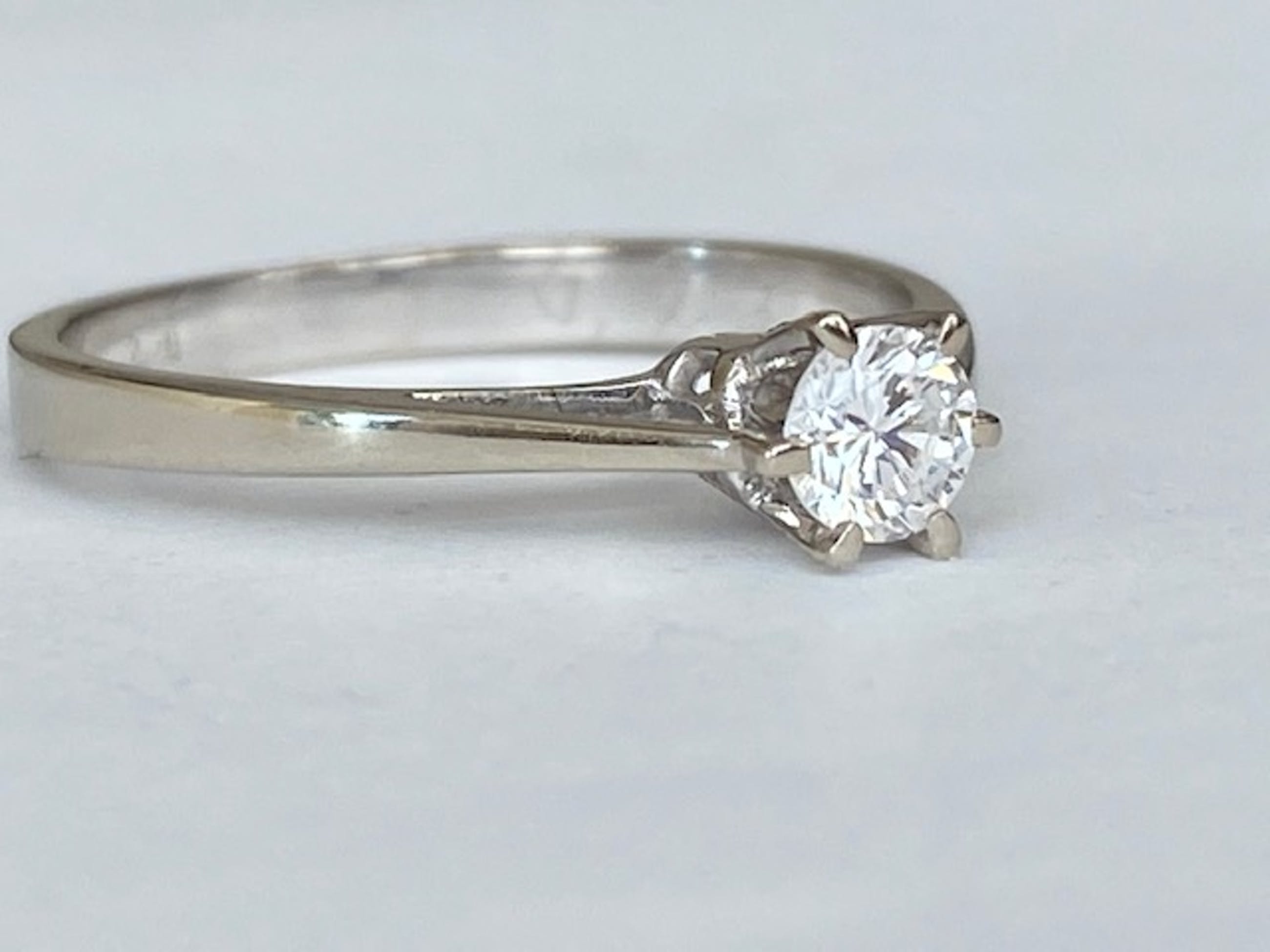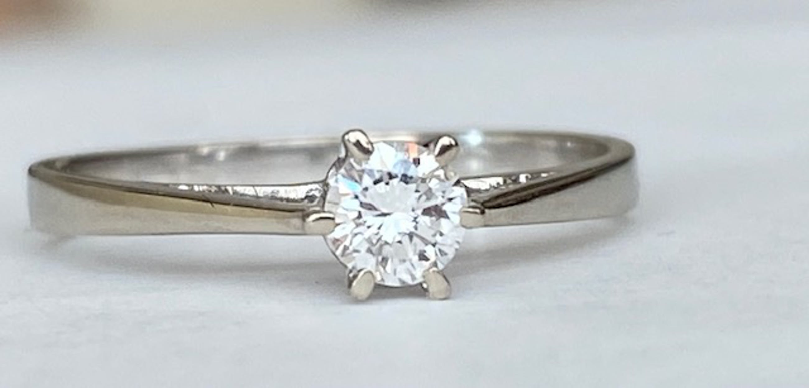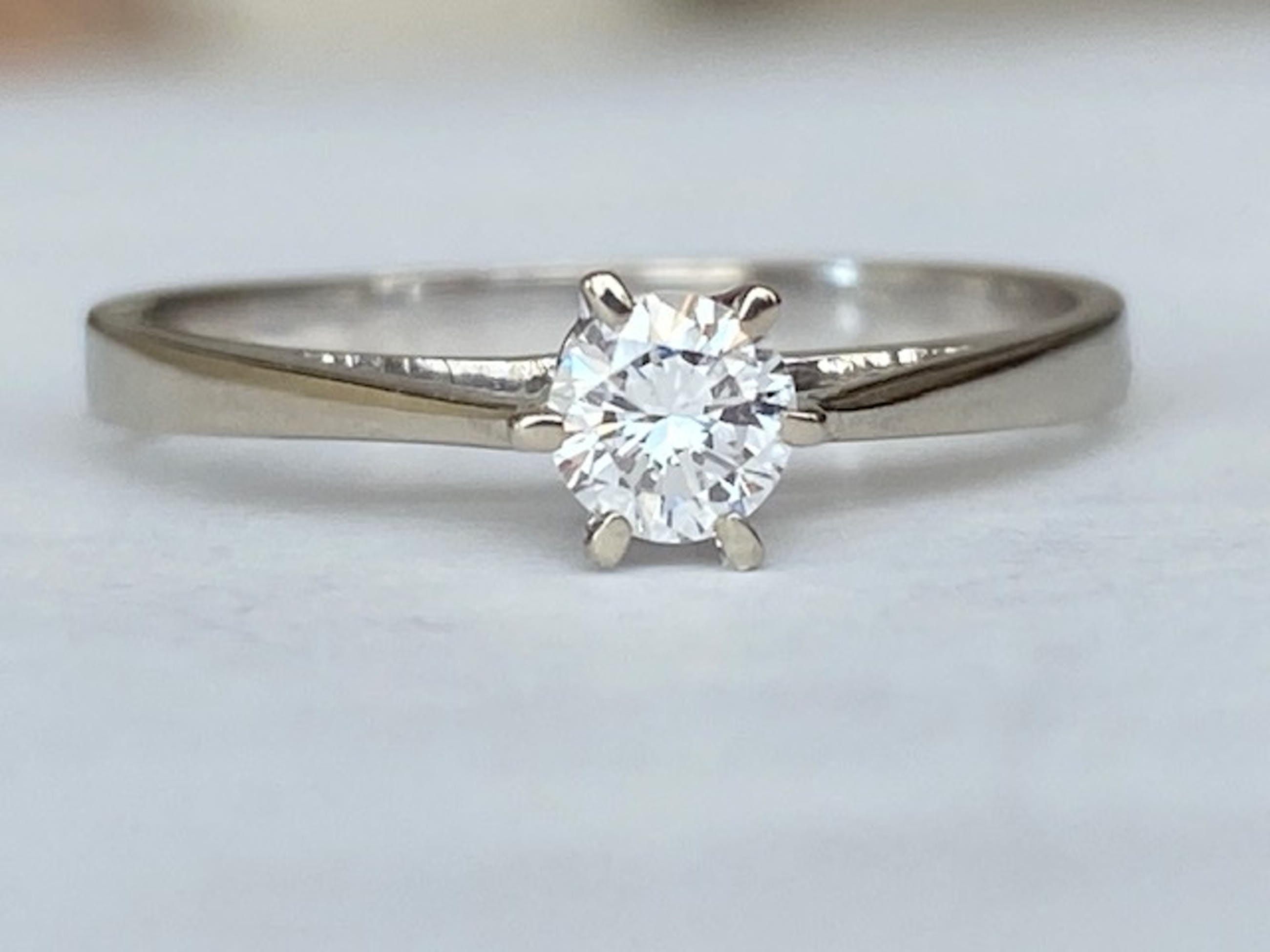 In goede staat aangeboden 18 karaats witgouden solitair ring met 0.23 ct briljant geslepen diamant van kwaliteit E/VS. Gehalte: 18 KT (gekeurd). Gewicht: 2.3 gram. Ringmaat: 17.25 mm