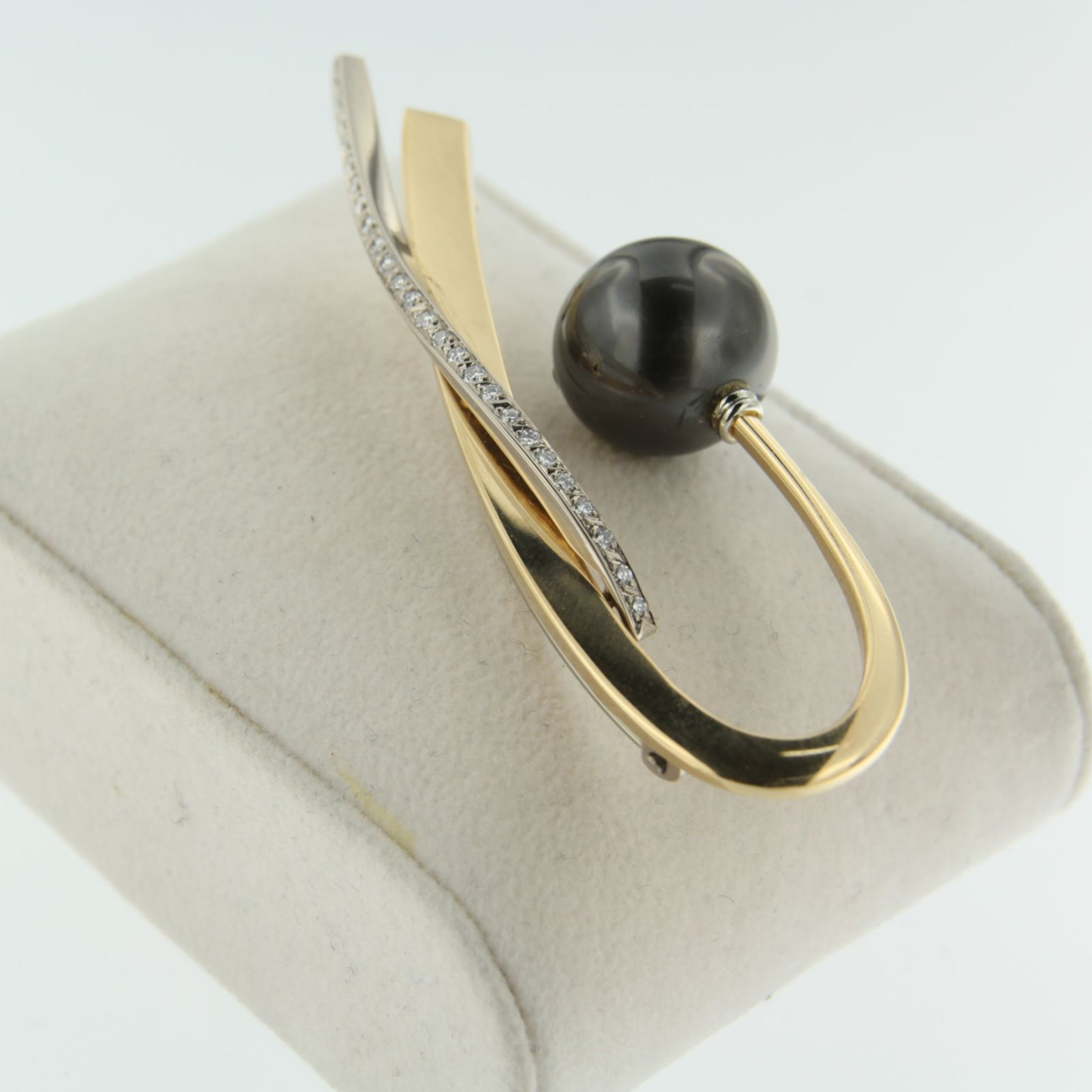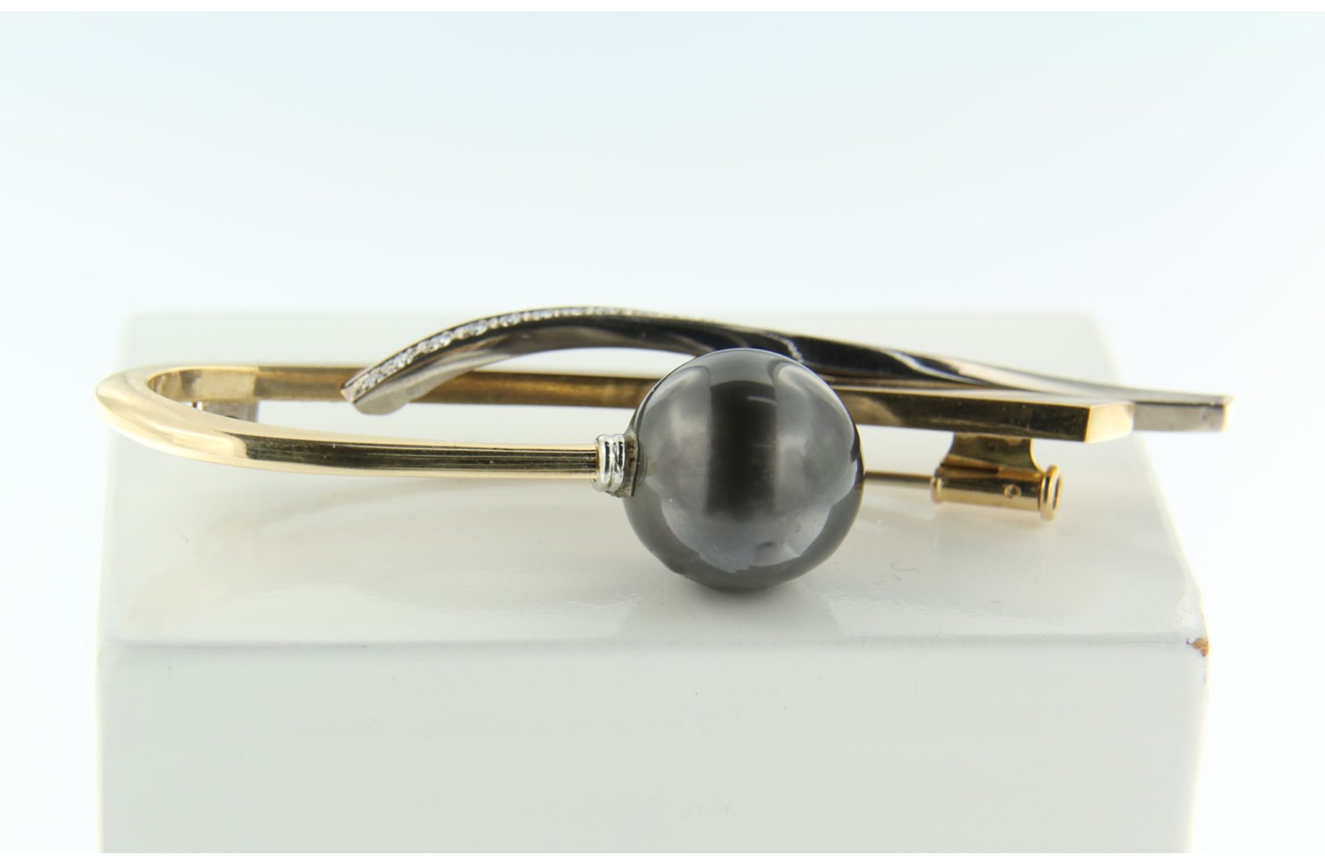en bezet met 1 cultive zoutwater grijze Tahiti Parel met een diameter van circa 14 mm, de parel heeft wat natuurlijke onregelmatigheden zie foto's