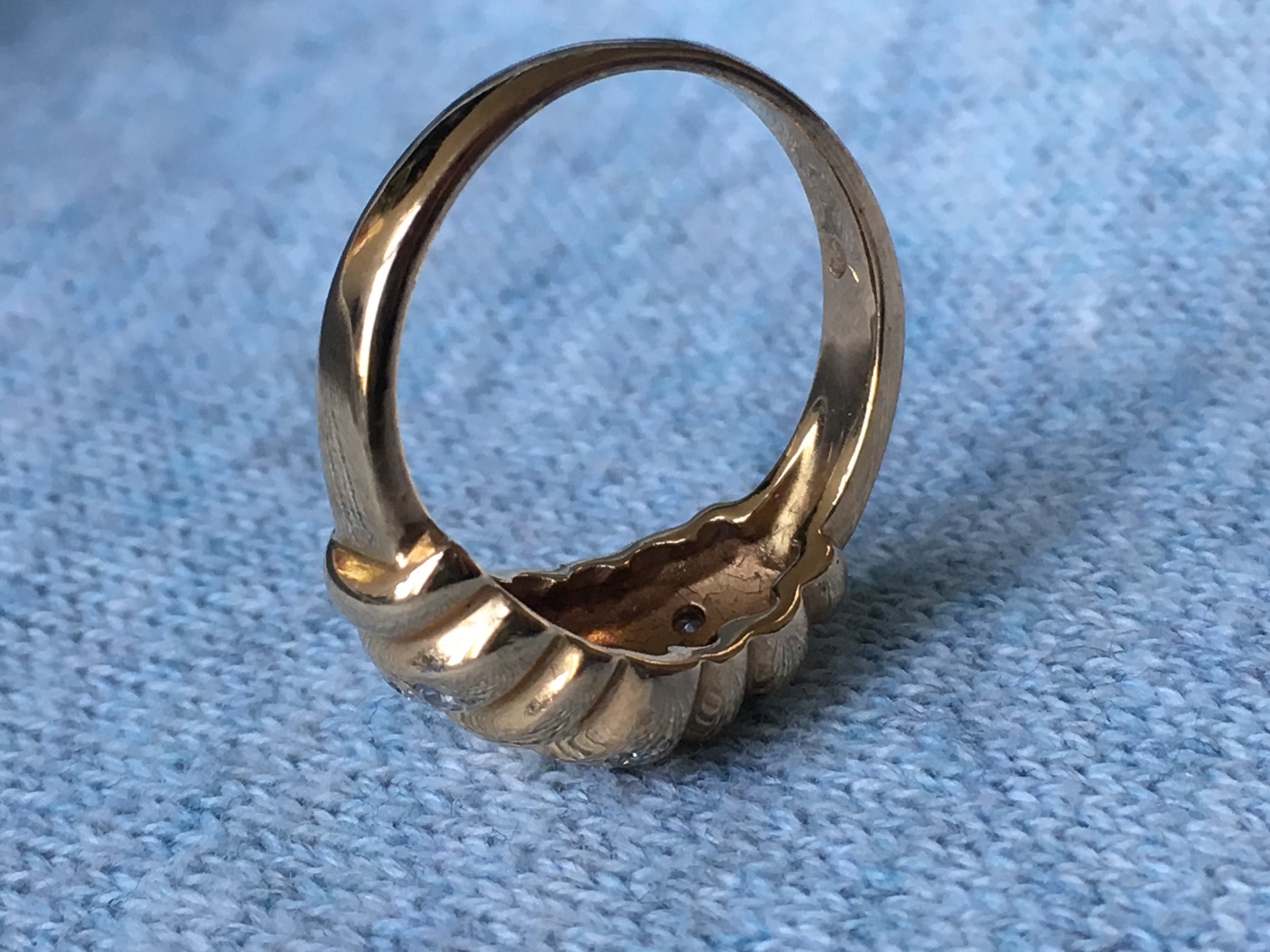 18 karaat roodgouwen ring met briljant geslepen diamant.De ring heeft maat 16.5, is 0.4 hoog vanaf de vinger en voorzijde is 1.8 cm breed.Bezet met 11 briljant geslepen diamantjes, van ca. 0.11 ct. samen VS2, Wesselton.De ring weegt maar liefst 5 gram en is gekeurd aan de binnenkant voor 18 karaat goud.