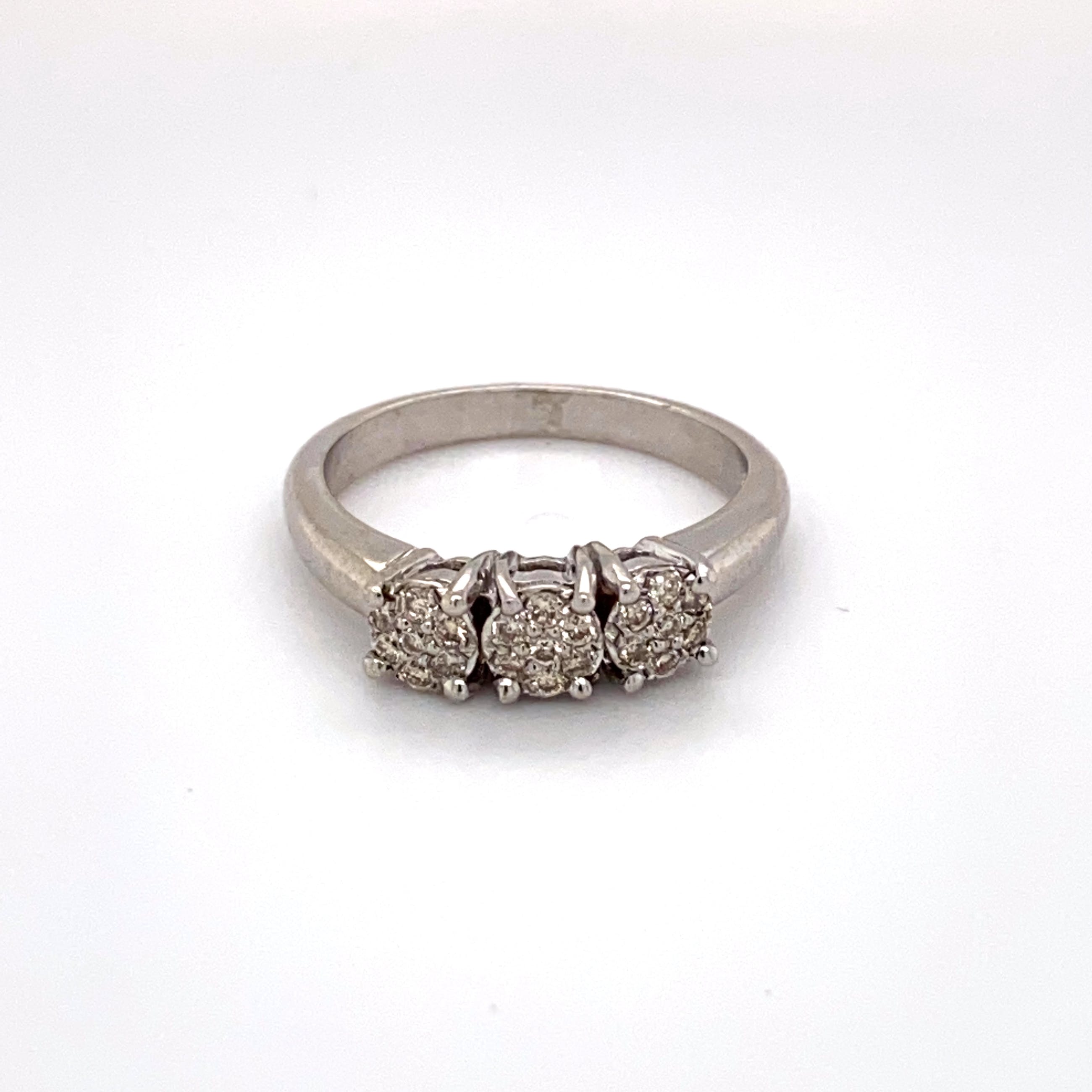 bezet met 3 clusters van 7 x 1,3 mm briljantgeslepen diamant met een totaal van circa 0,21 caraat