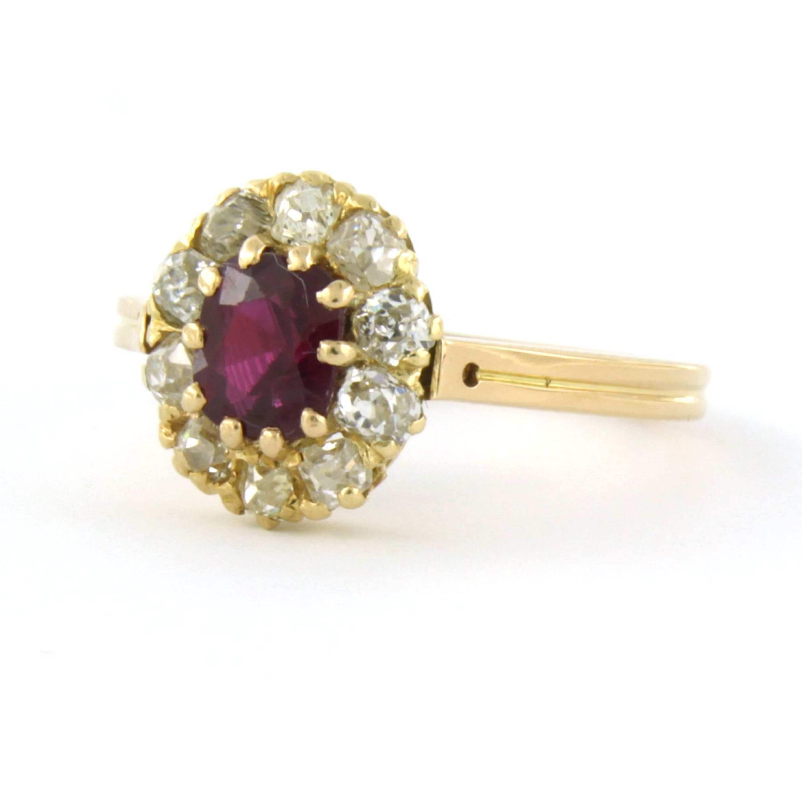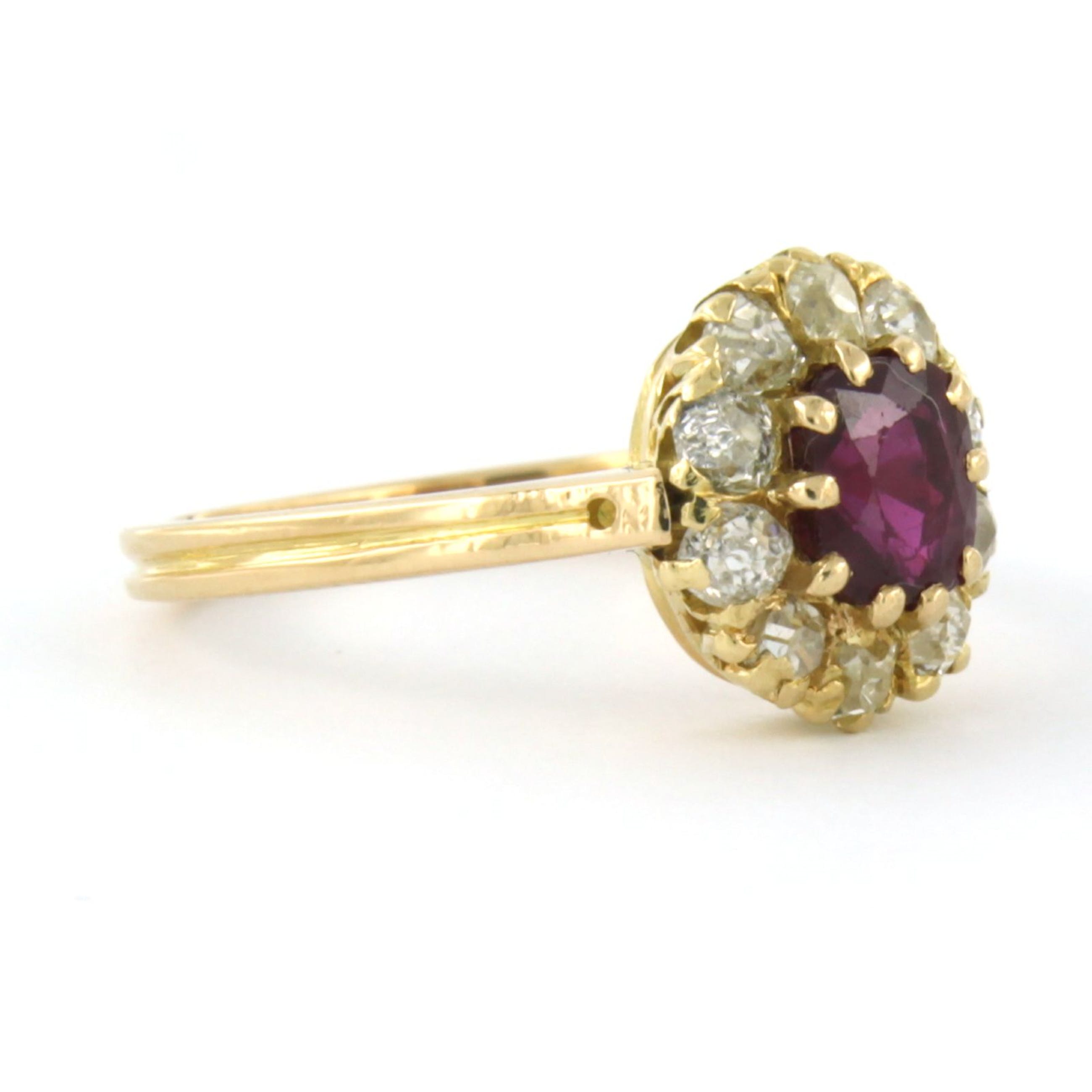 18k geel gouden entourage ring bezet met robijn en aan entourage Bolsjewiek geslepen diamant tot. 0,50ct - G/H - SI/P1 - ringmaat 17,5(55)