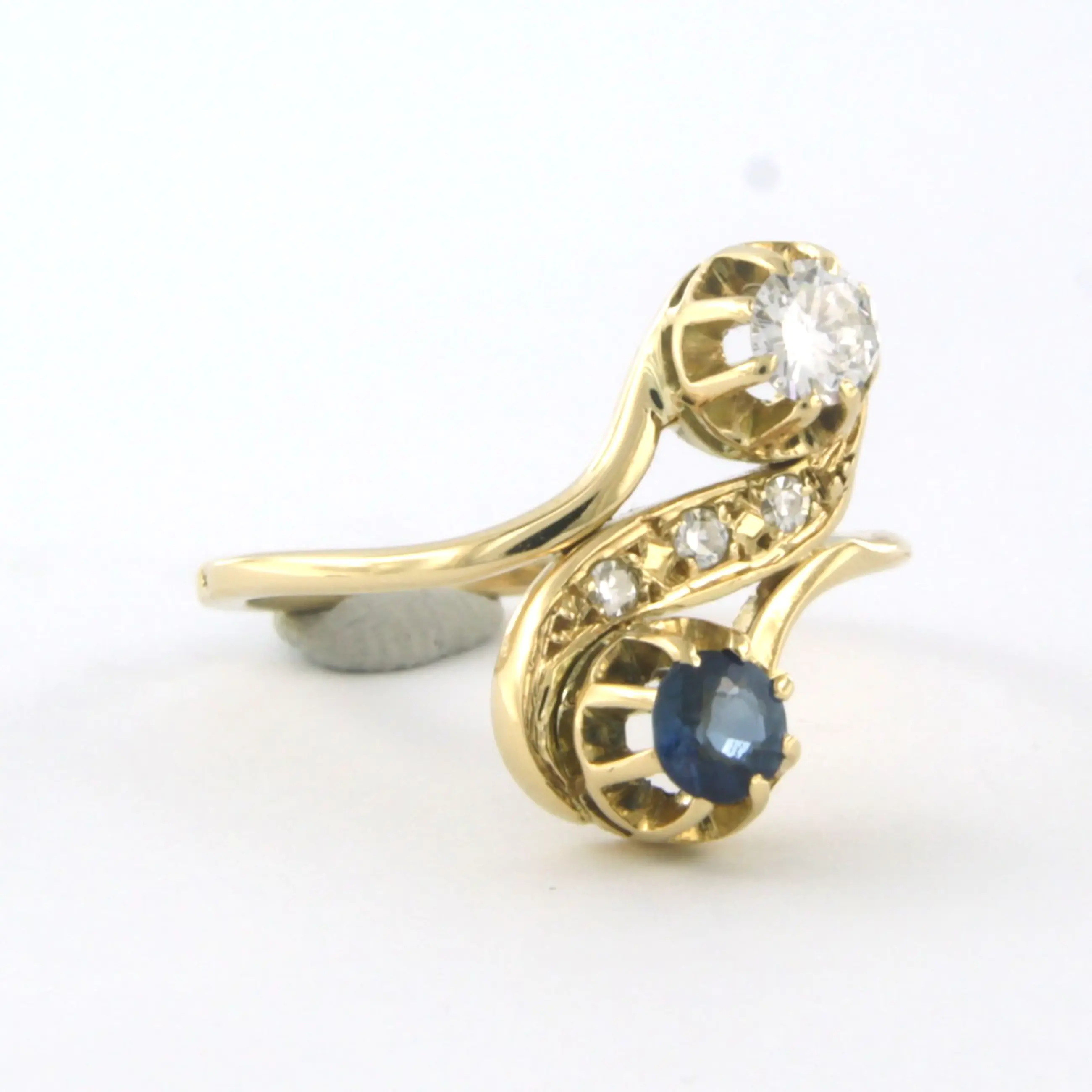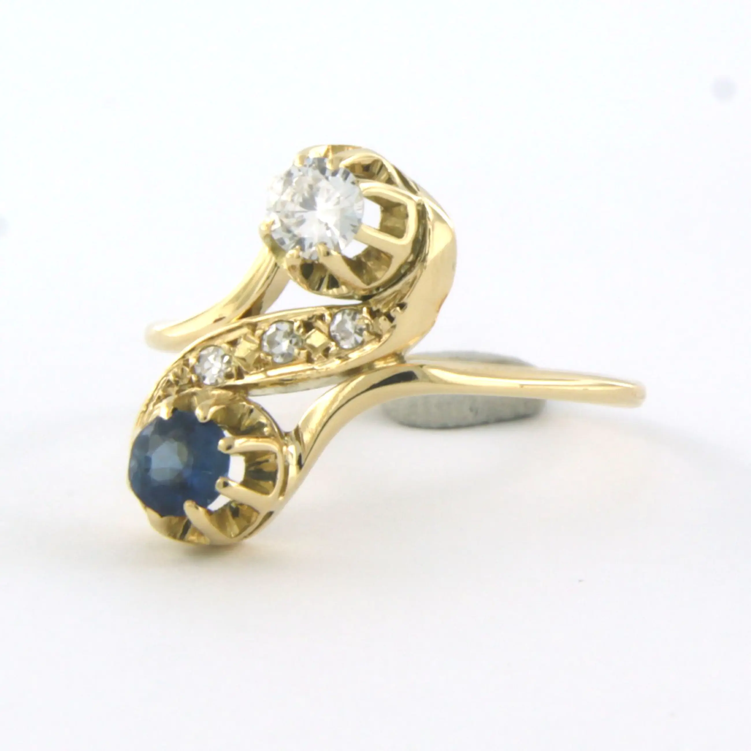 18k geel gouden slagring bezet met saffier en briljant en single cut geslepen diamanten tot. 0,20ct - F/G - VS/SI - ringmaat 15,5(49)