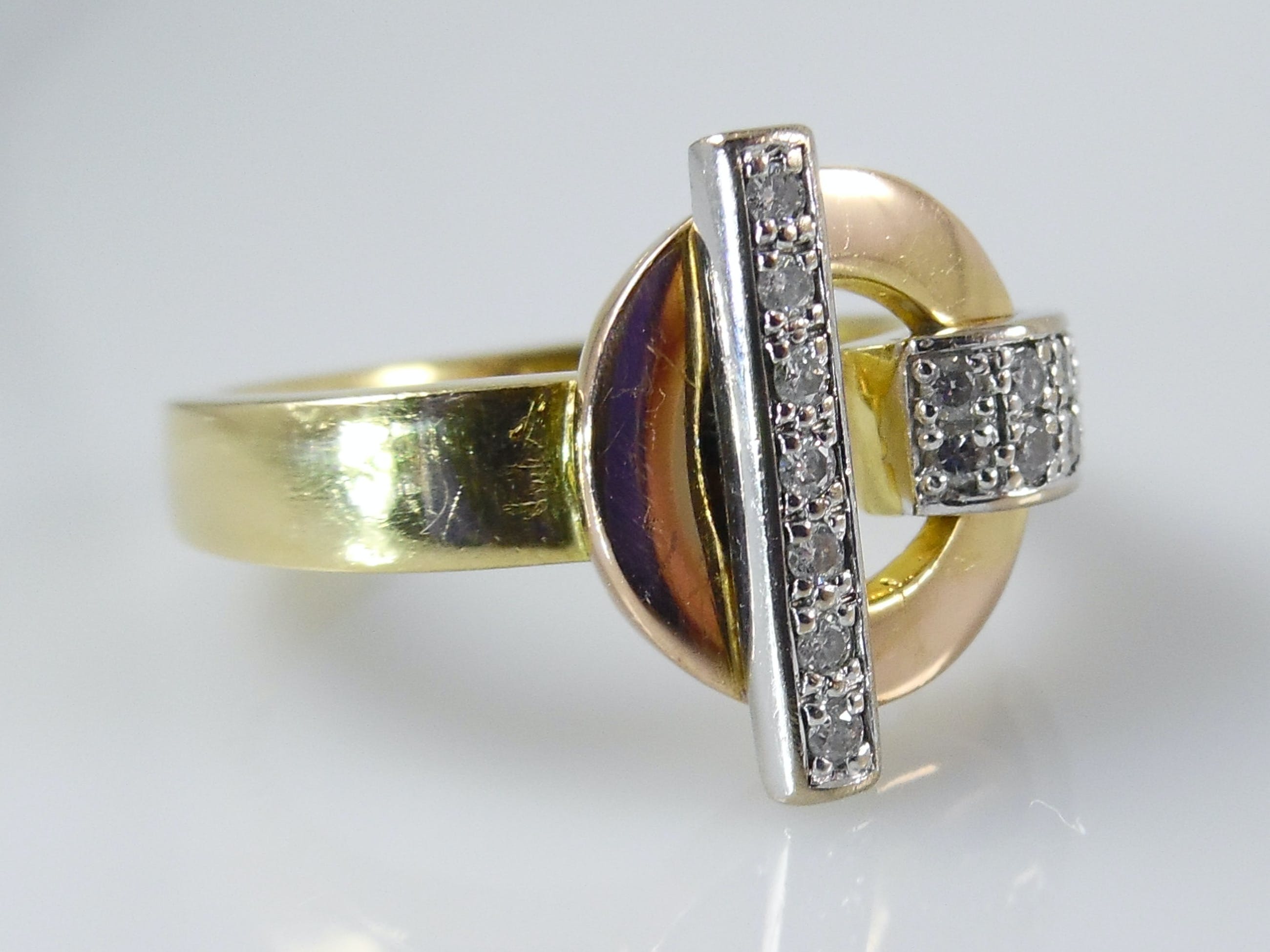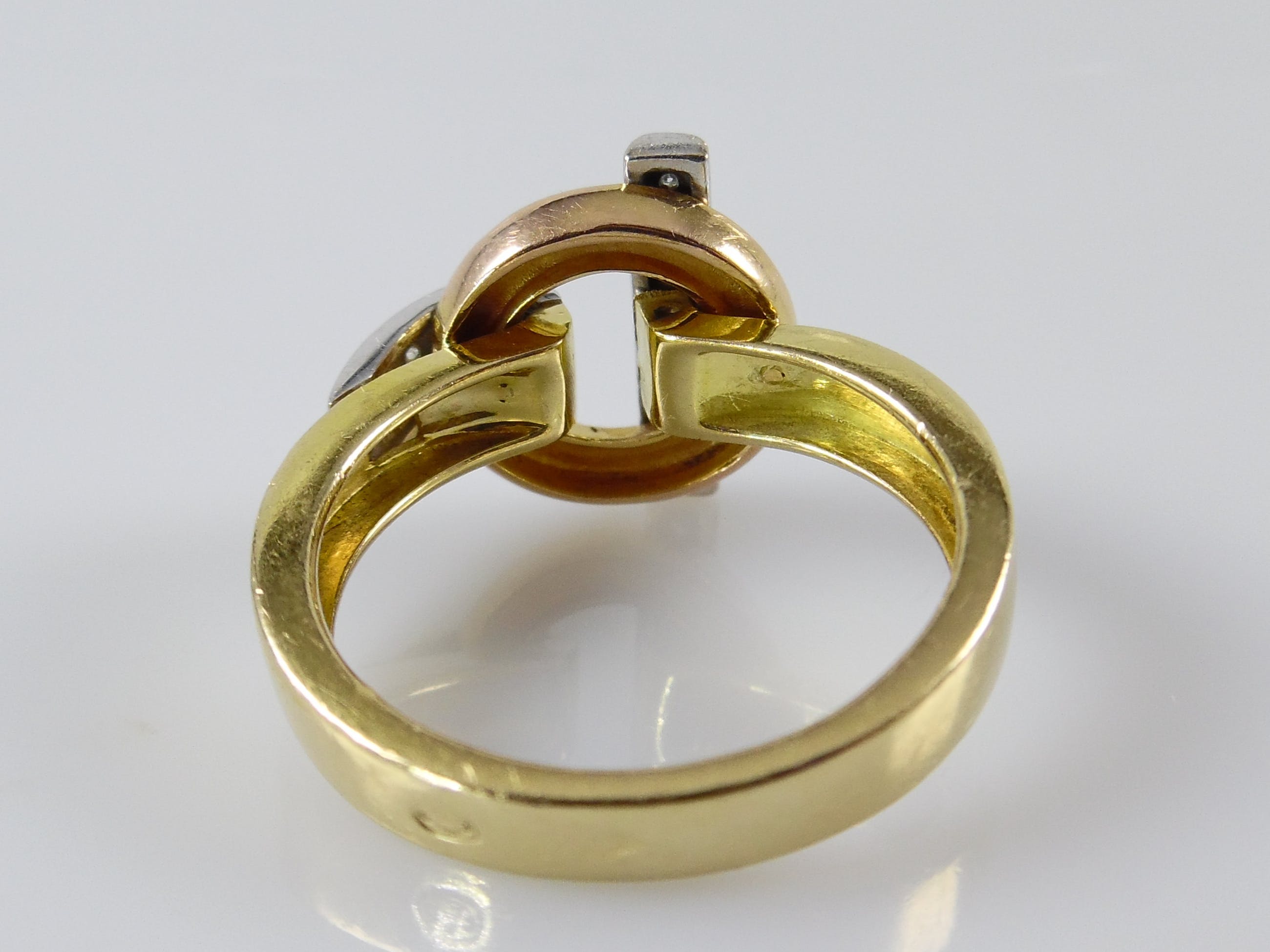 De ring zelf is geelgoud, de ronde "gesp" is roségoud en de diamanten zijn gezet in witgoud. De breedte is 14,1 mm, de hoogte 4,6 mm.