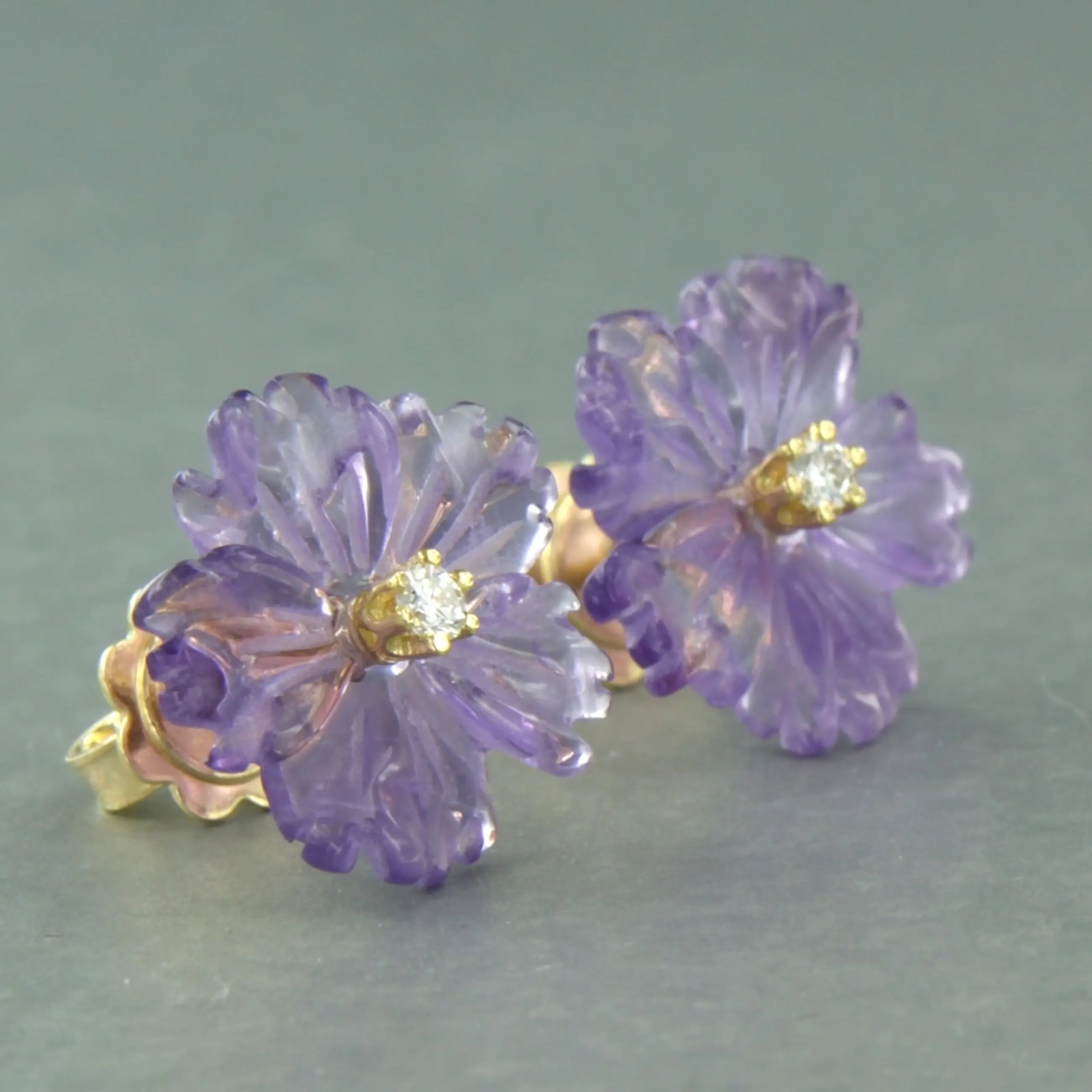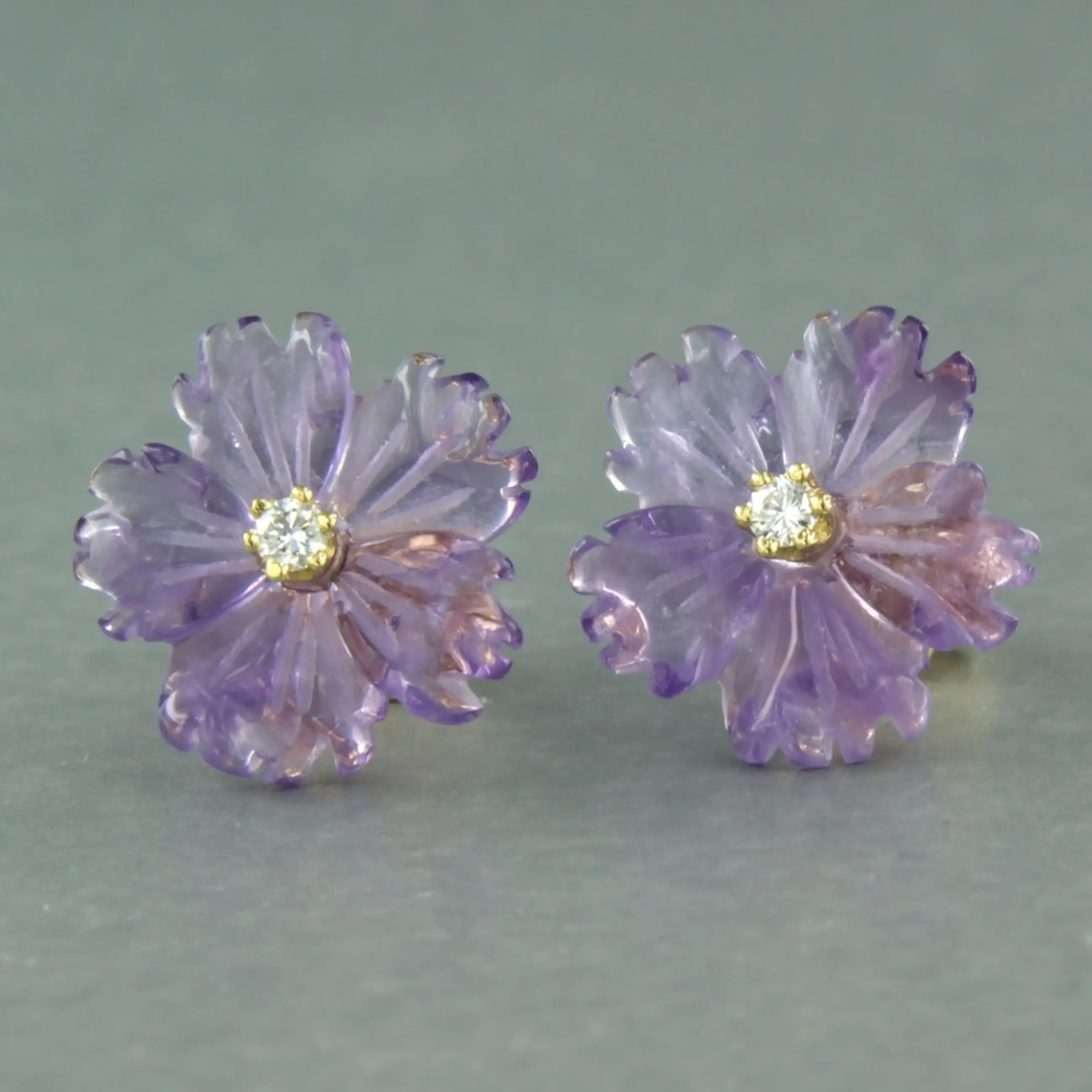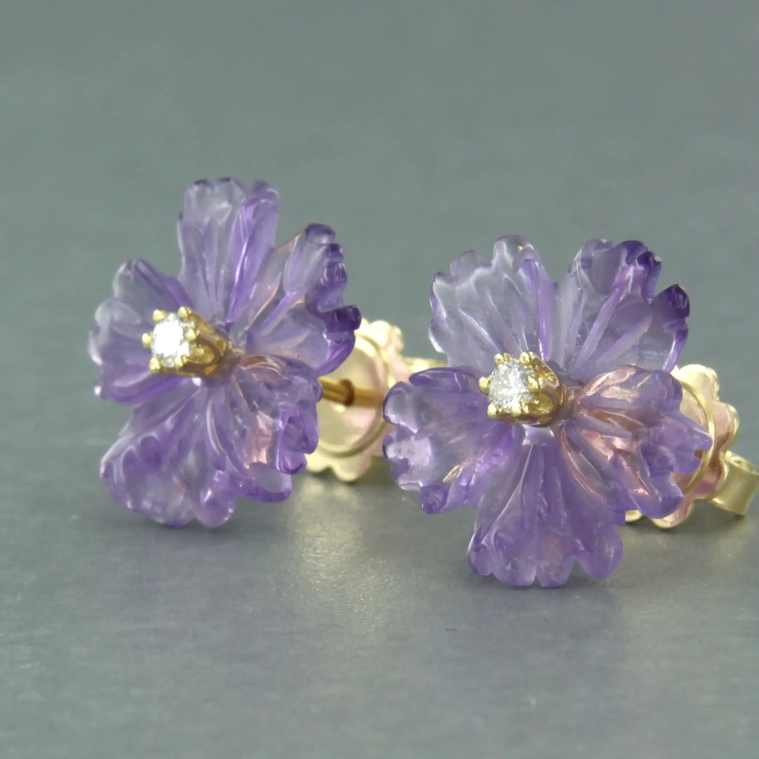 18k geel gouden oorknoppen met in bloem vorm geslepen amethist en briljant geslepen diamant 0.08 ct - G/H - VS/SI