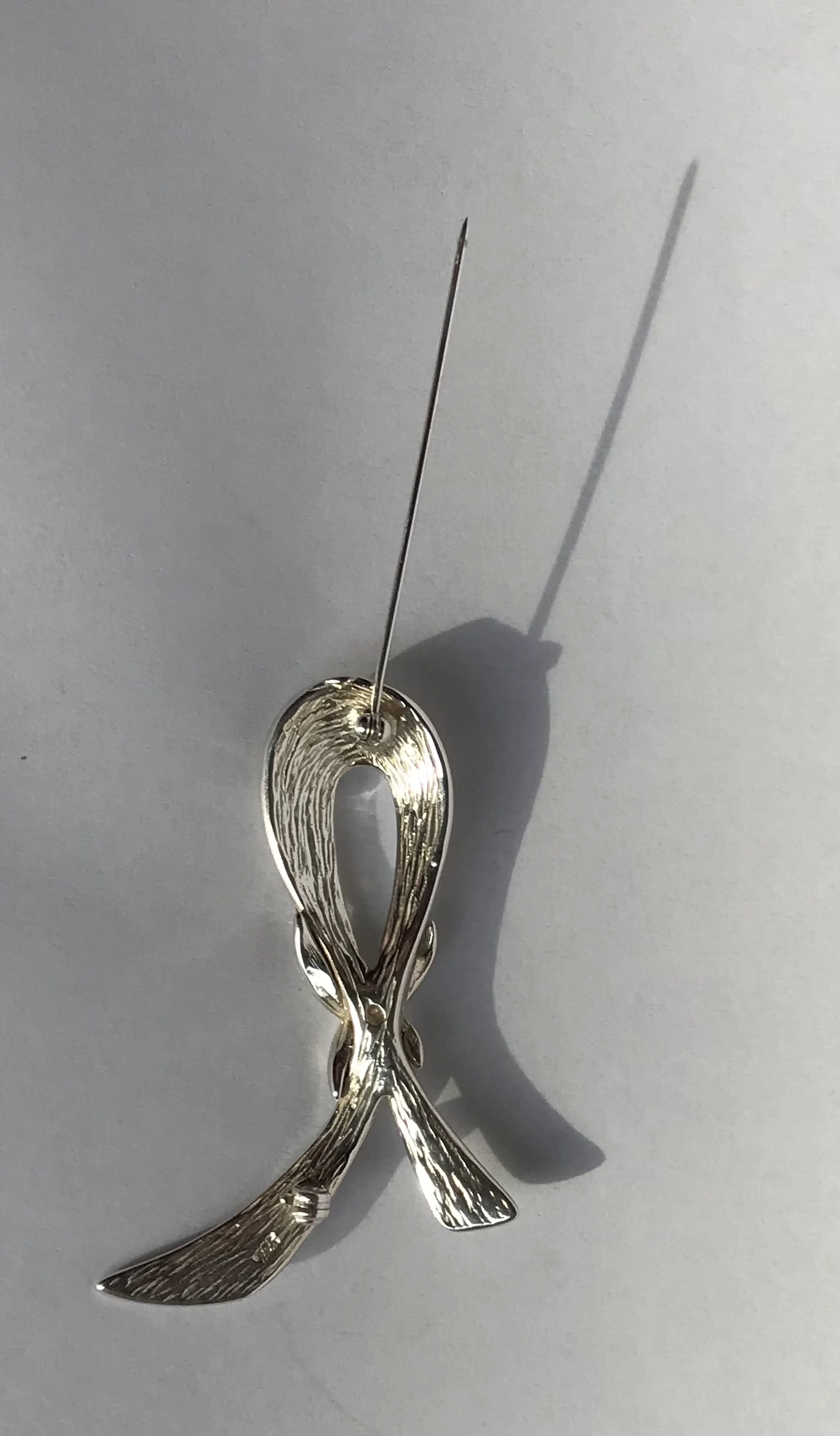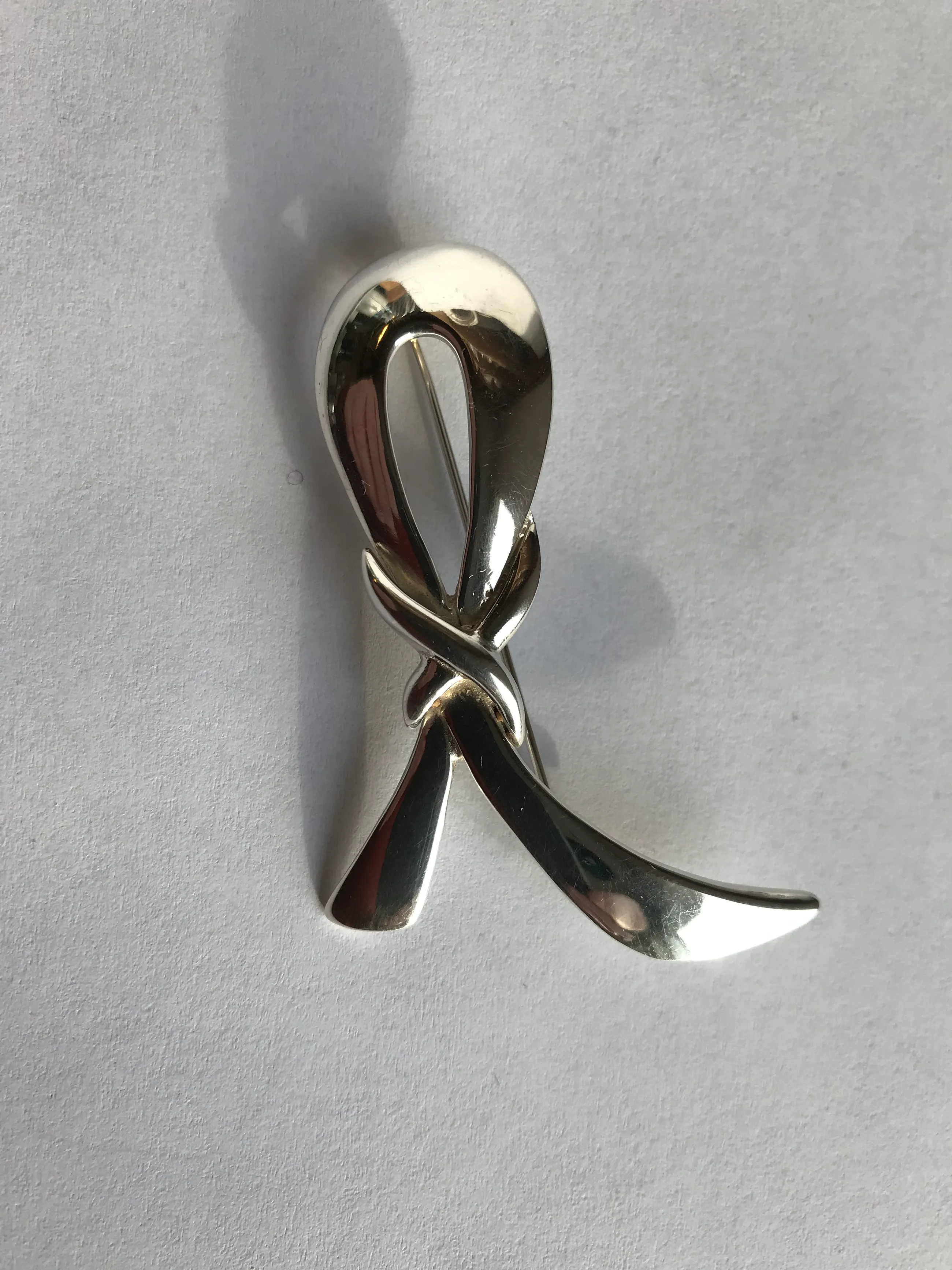 Zilveren broche in de vorm van een strik. Glad aan de buitenzijde en binnenzijde lijkt op houtnerf. Grote speld. Broche is 6,5 cm en 4 cm op breedste punt. Gemerkt met 925 en gewicht 17,2 gram.