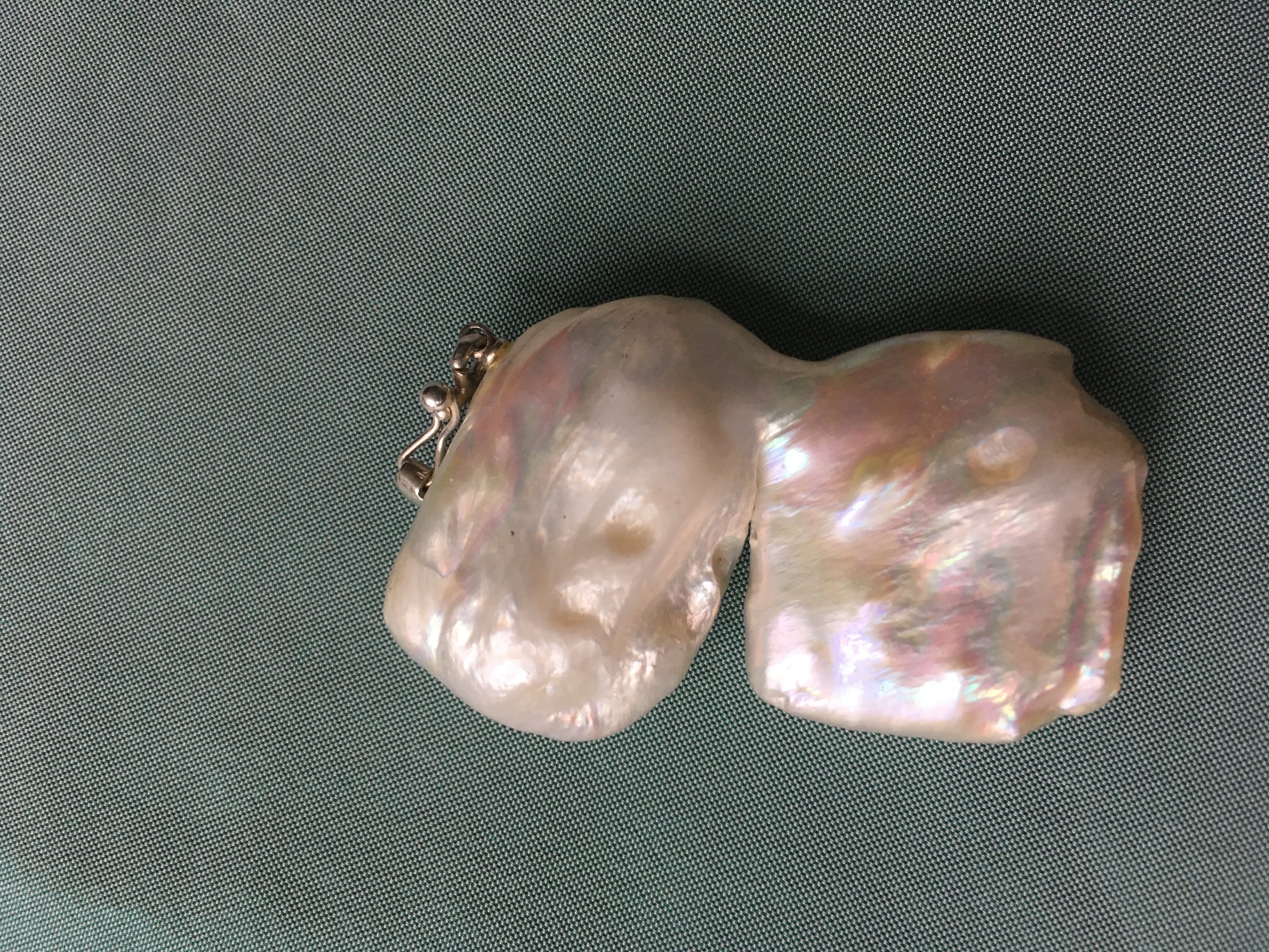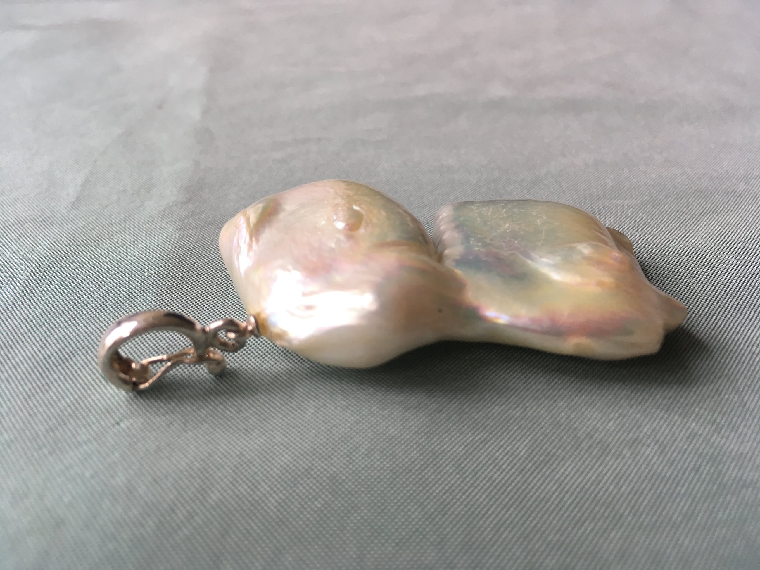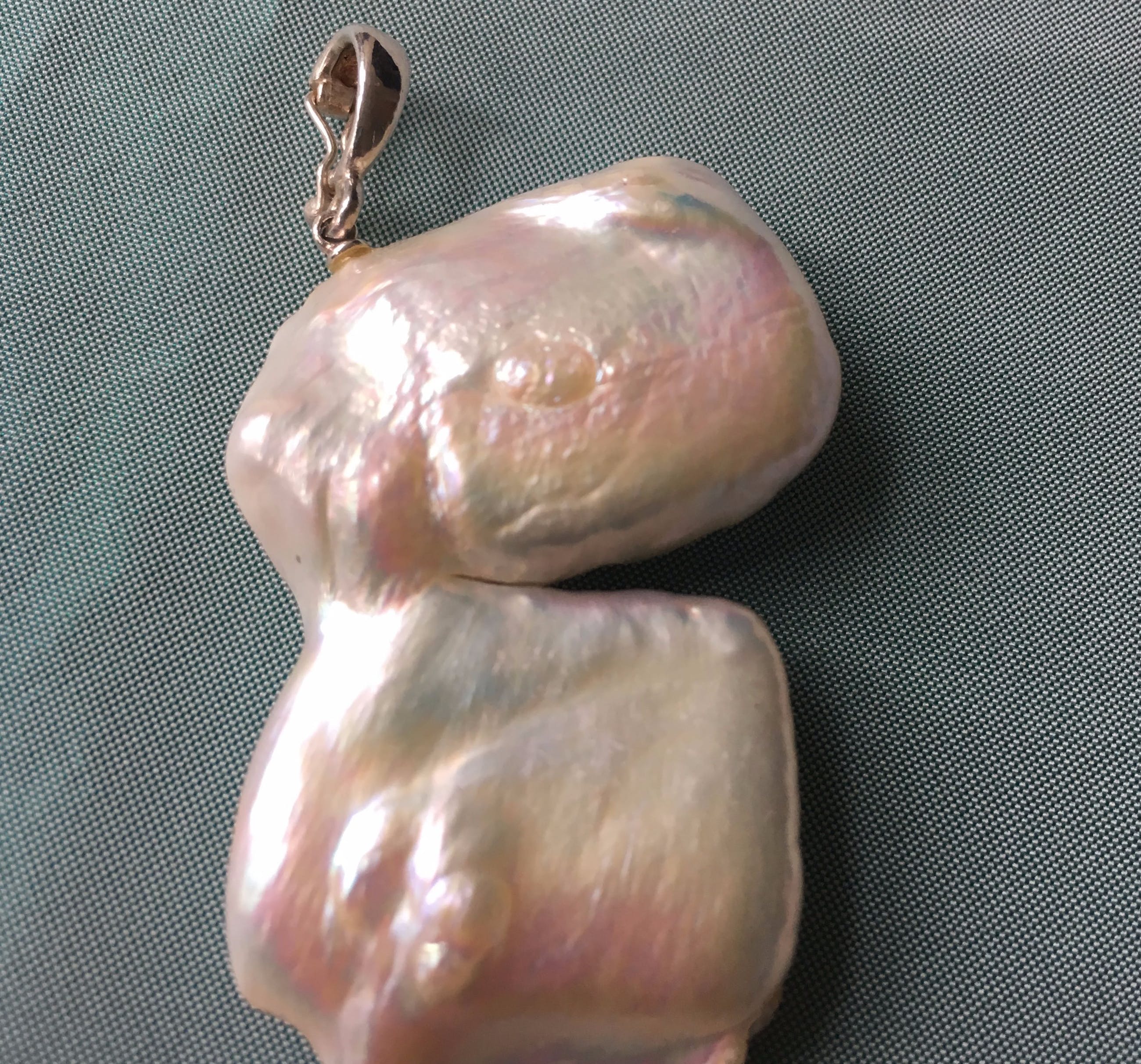 Grote parelhanger, de parel is grillig van vorm en heeft een mooi luster.