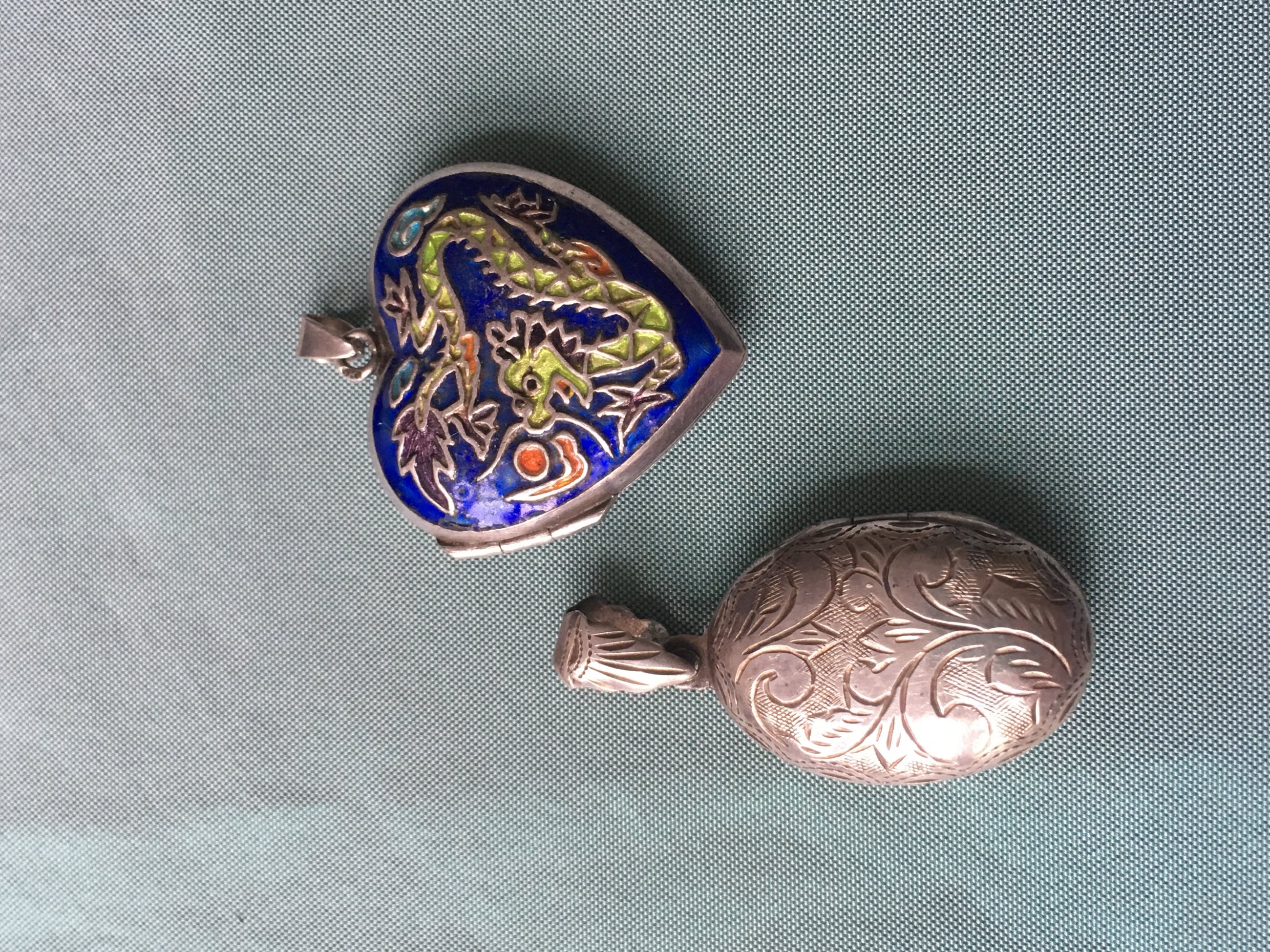 Lot van 2 medaillons: ovaal gegraveerd medaillon is gestempeld: 'sterling silver' in de binnenzijde en meet ca. 3.5 cm (incl. hangoog) bij 1.7 cm breed.