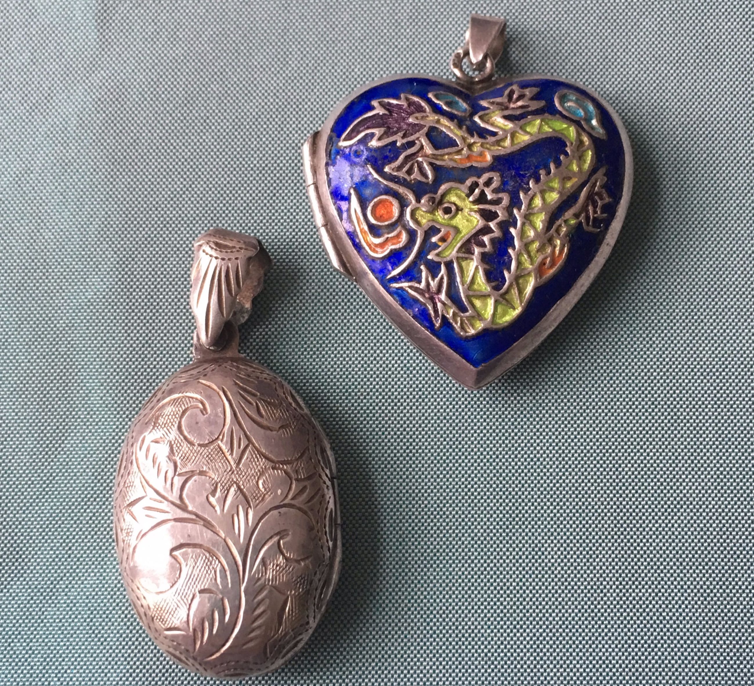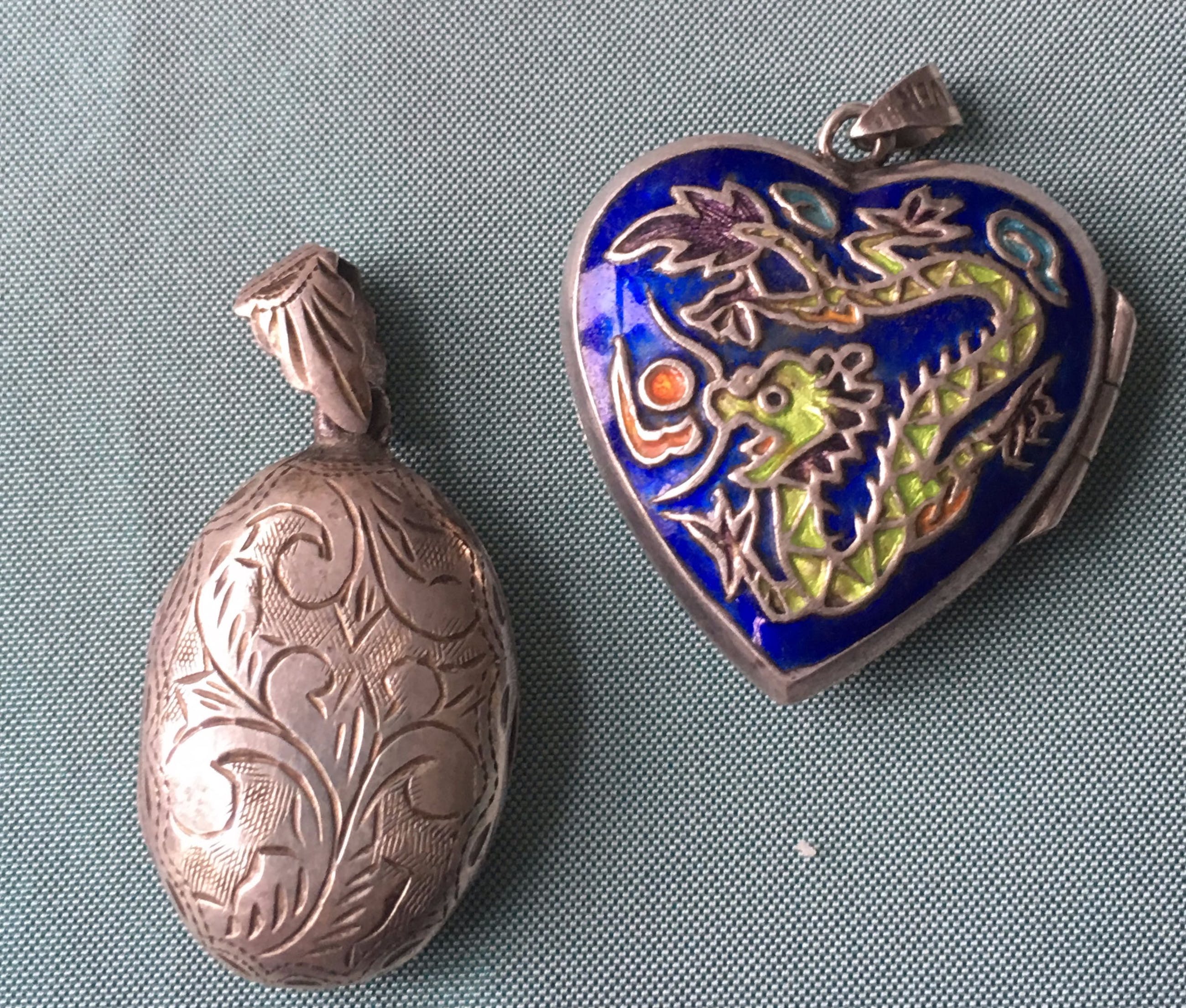 het hart vorige blauwe medaillon met een draak is gestempeld met 'silver' op het hangoog, gehalte onbekend. Formaat: ca. 3.2 x 2.6 cm.
