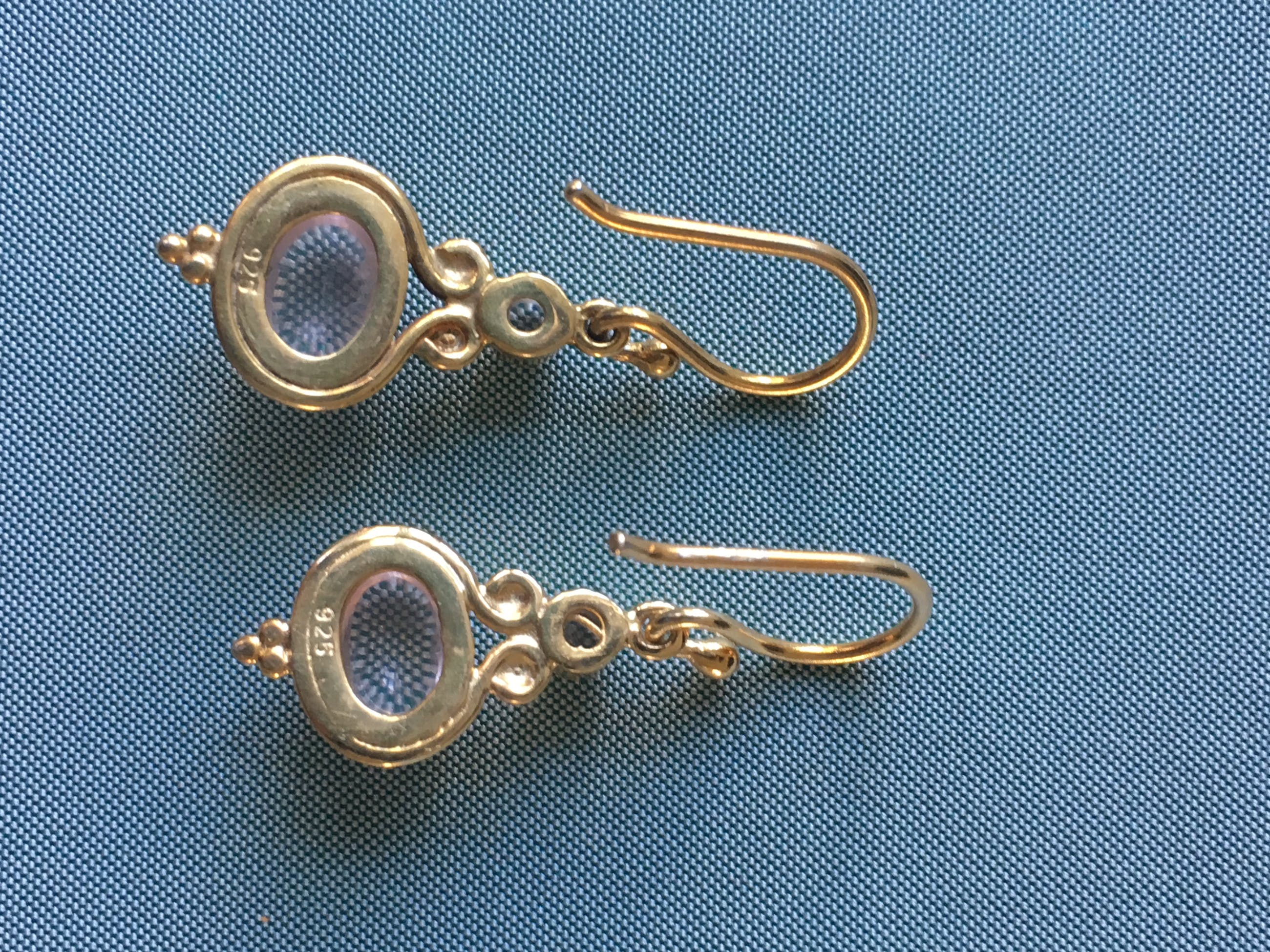 Sierlijke oorhangers met cabochon geslepen rozenkwarts, gezet in eerste gehalte zilver en op de achterzijde gekeurd: 925. Lengte incl de haak: ca. 3 cm. Oorhanger element ca. 2 cm lang, totaal gewicht: 3.48 gram. N.B. Voor slechts € 5,- kunt u dit kavel per brievenbuspakketje (met trackingcode, zonder verzekering) laten opsturen. Verder kan de verkoper meerdere aankopen combineren bij de verzending. Dit kavel is in nieuwstaat en wordt als geschenk opgestuurd.