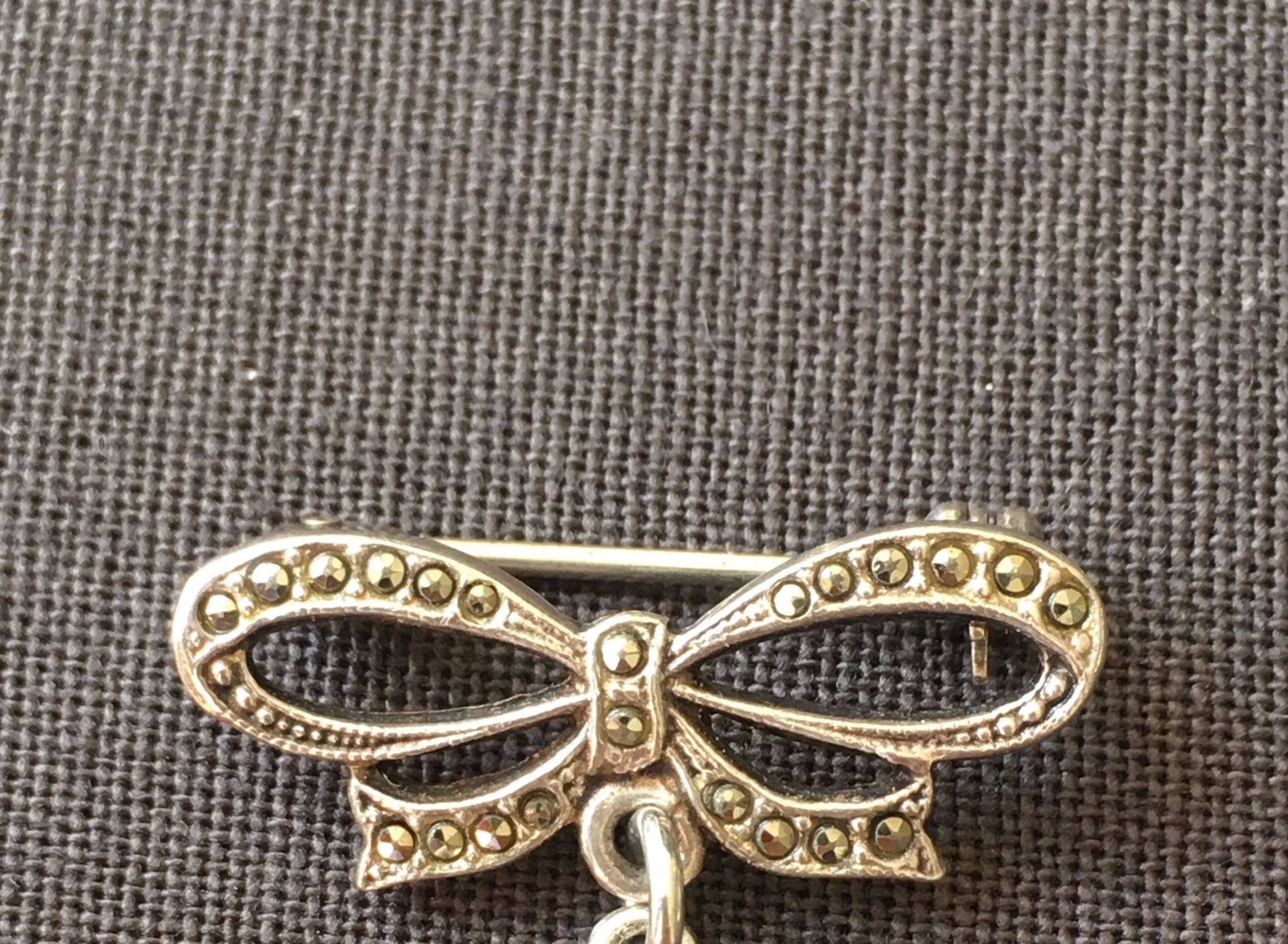 Een zilveren broche in de vorm van een strikje bezet met markasiet. De hanger is ovaal en is bezet met een groene steen (waarschijnlijk nefriet jade). Formaat ca. 3.2 x 2.5 cm, gewicht: 4.27 gram. De broche is niet gekeurd, wel getest op zilver. Geschatte winkelwaarde van deze gesp volgens onze veilingmeester: € 125,- Op eigen risico kunnen we dit item ook verzenden voor € 3.90 als brievenbuspakje (met trackingcode, onverzekerd). Bij meerdere aankopen van deze verkoper kunnen we de verzending combineren.