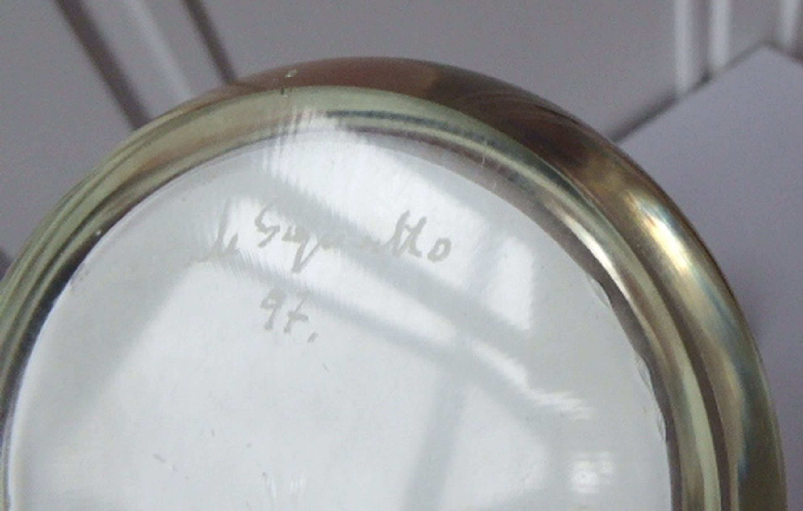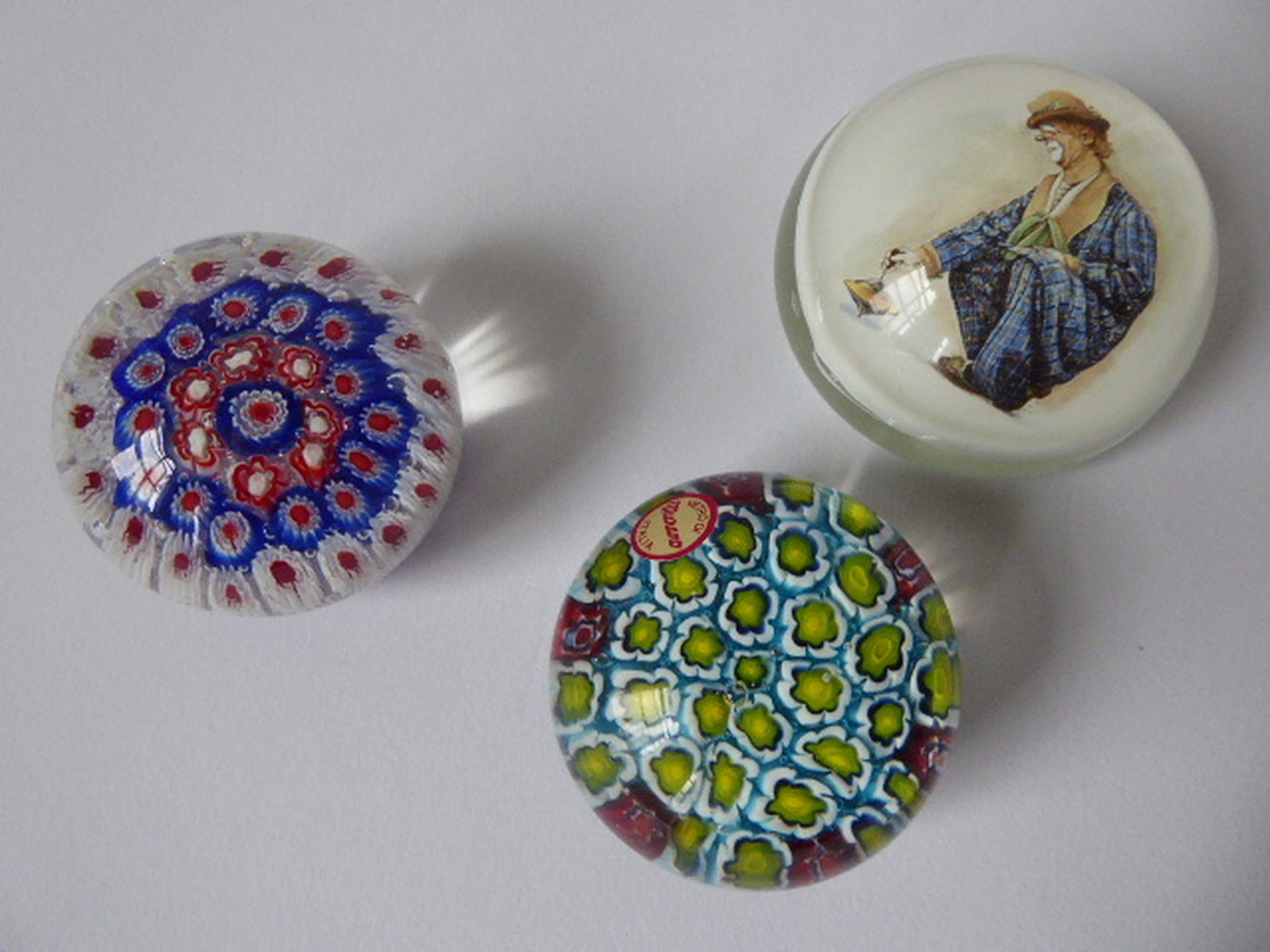 - Geel/wit/turquoise/rood: niet getekend, enkel stkker Murano. Doorsnede 6 cm
