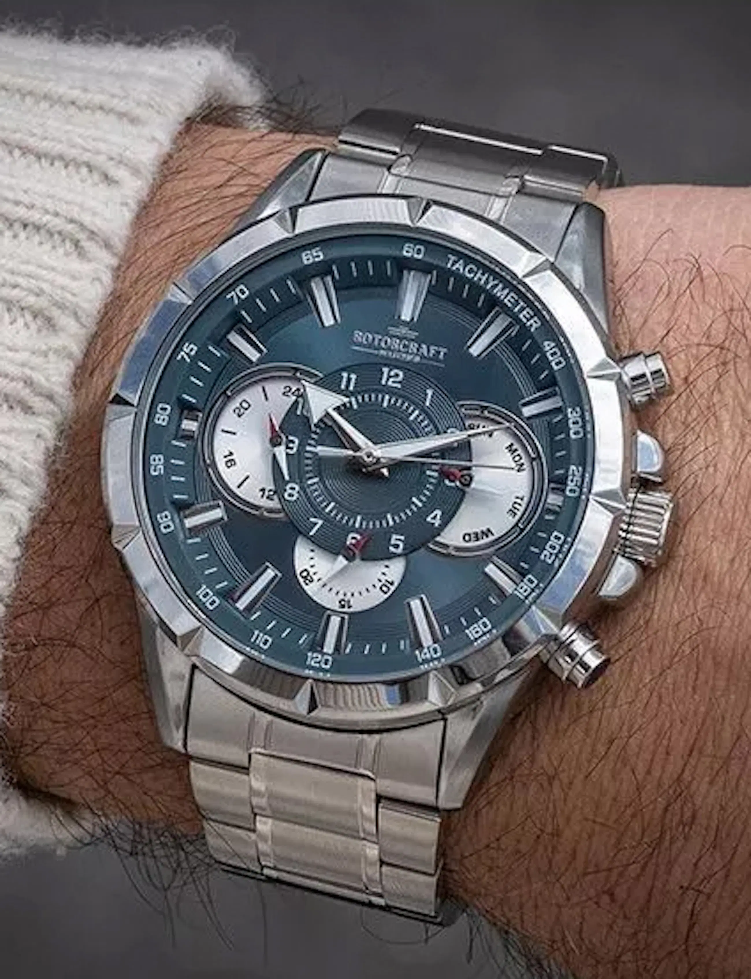 • Met chronograaf en dag-, datum- en 24-uursaanduiding