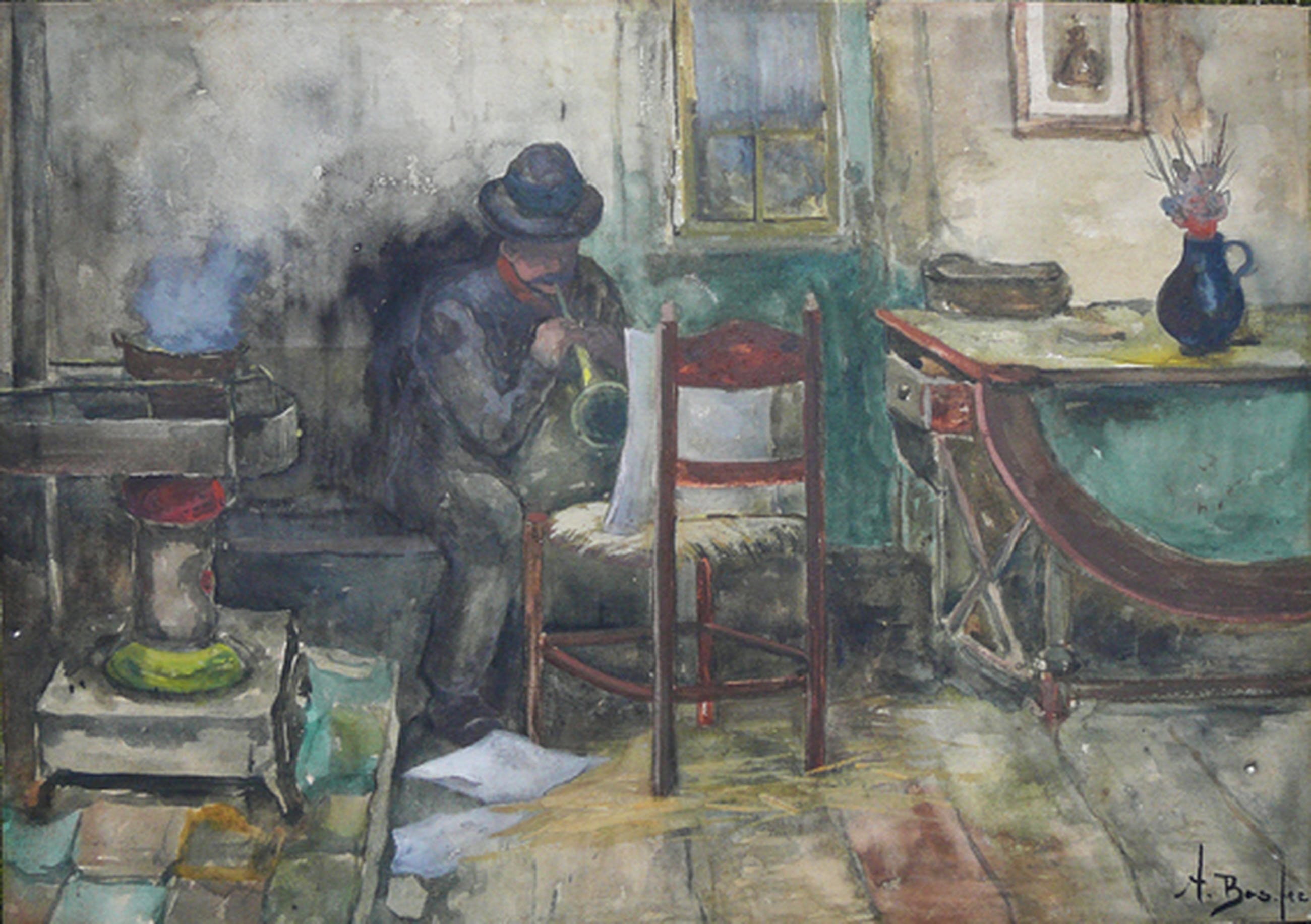 Bijzondere aquarel in originele lijst door A. Bos, voorstellende een eenzame muzikant in een armoedige woning. Schilderij dateert van voor 1930 en is professioneel gelijst achter glas door voorheen kunsthandel G.Eijs te Amersfoort.