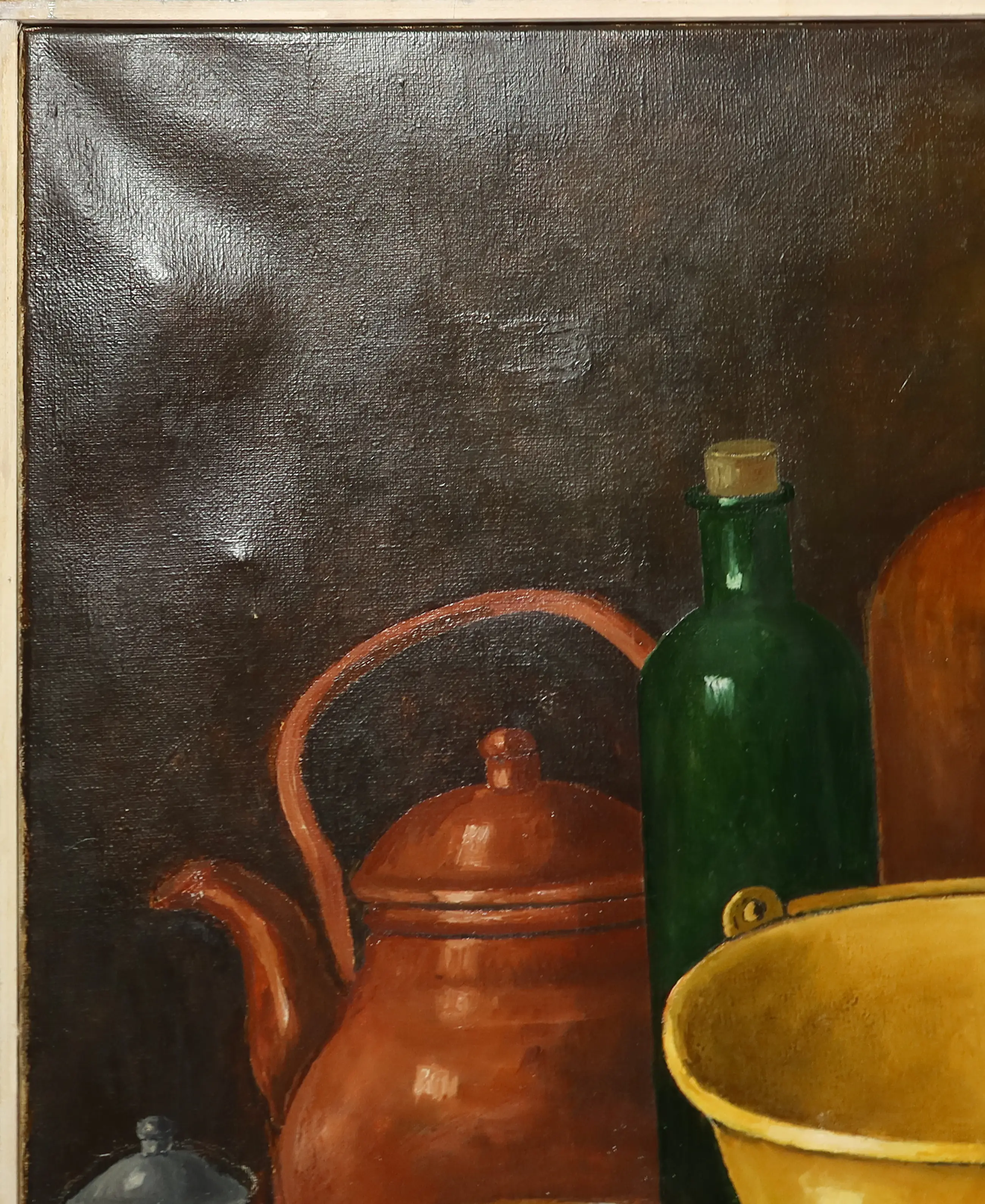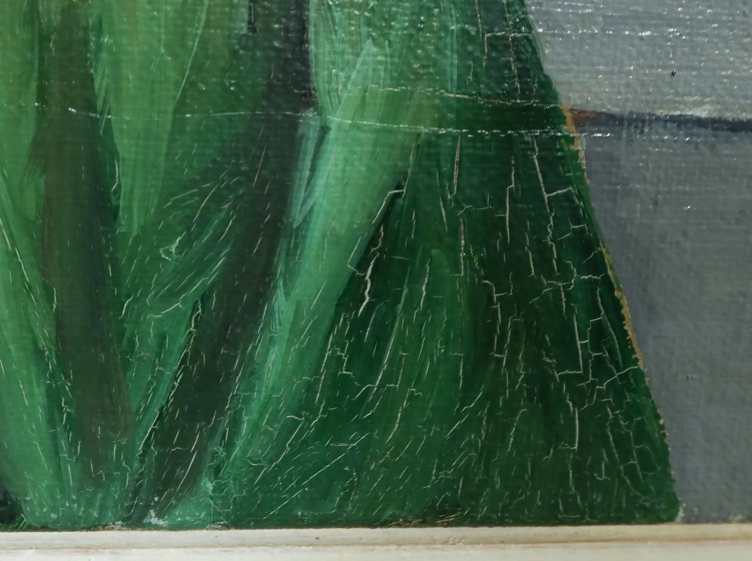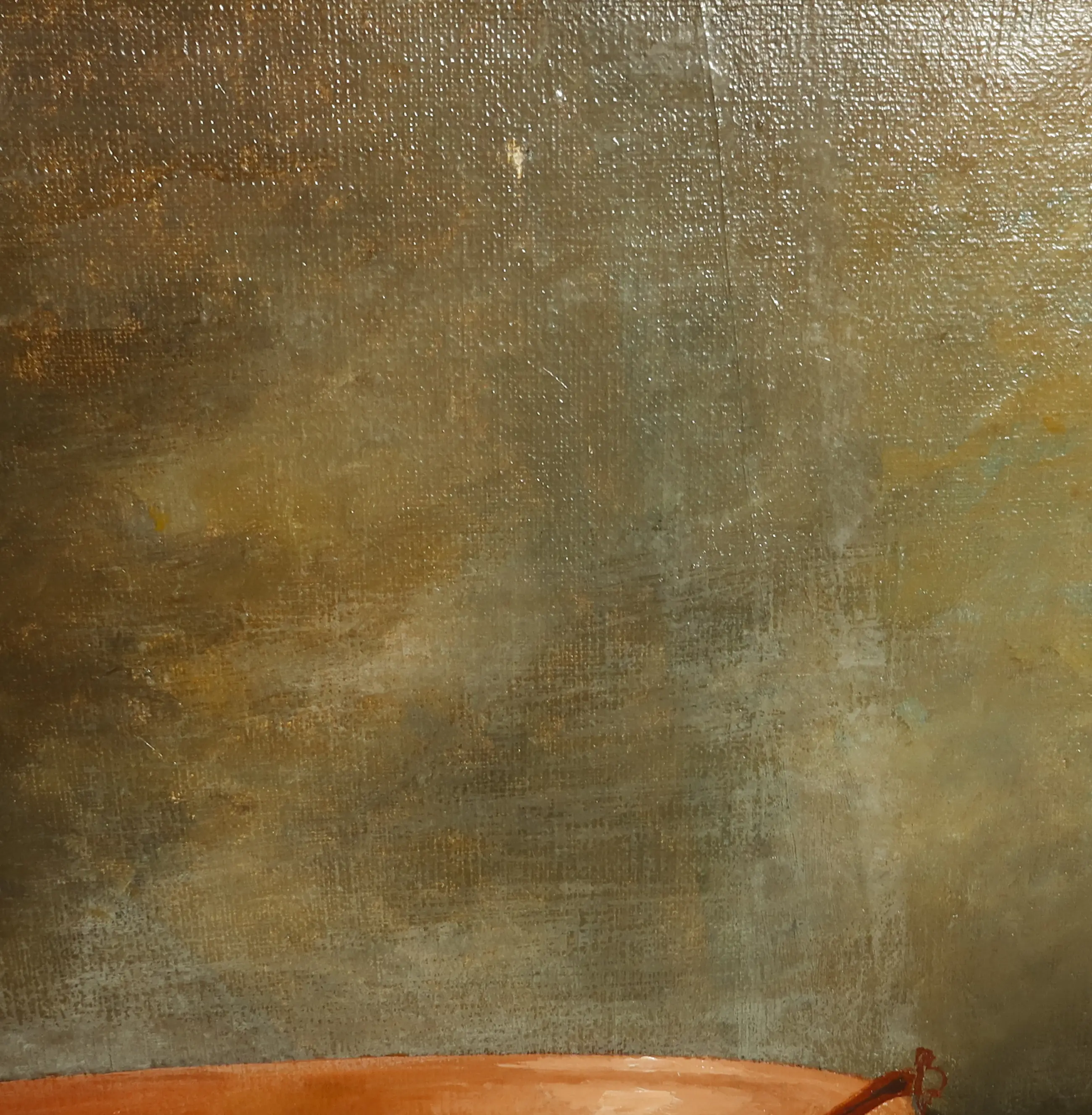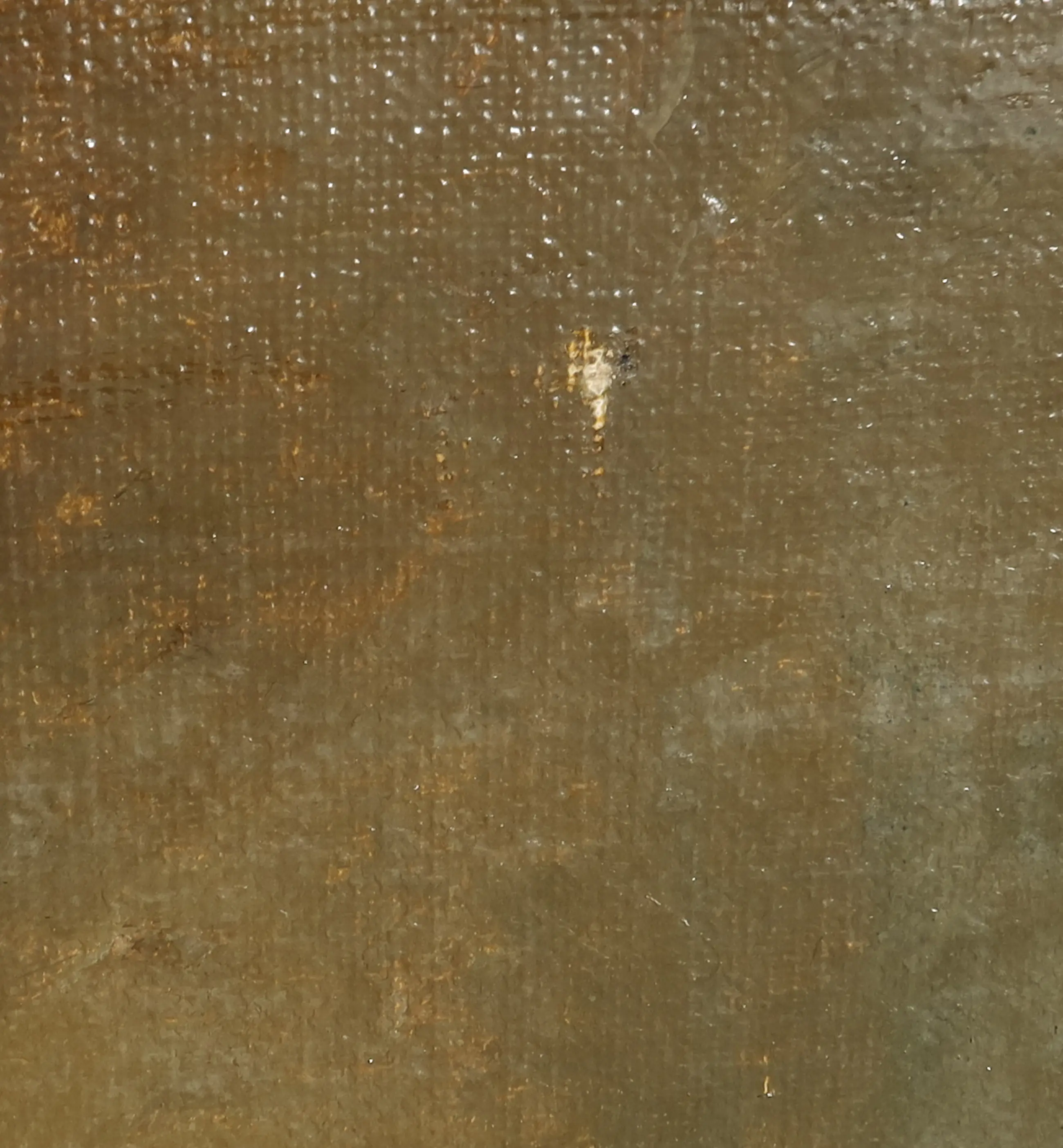 | Het werk is beschadigd. Er zitten deuken en golving in het doek en op enkele plekken is er oppervlakteschade te zien. De detailfoto's proberen een zo'n compleet mogelijk beeld te geven van de huidige staat van het werk. | |
