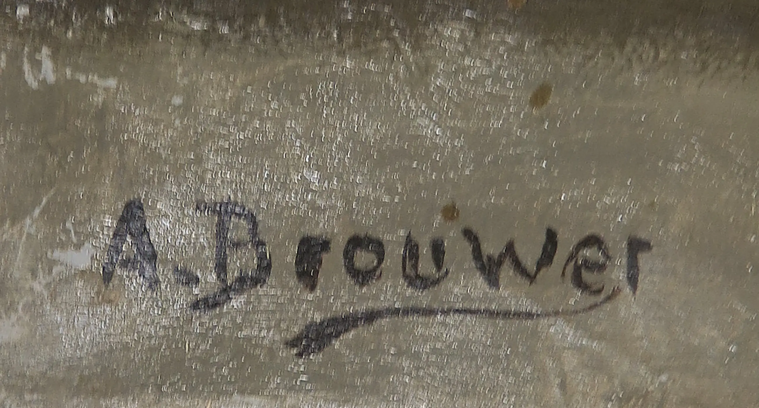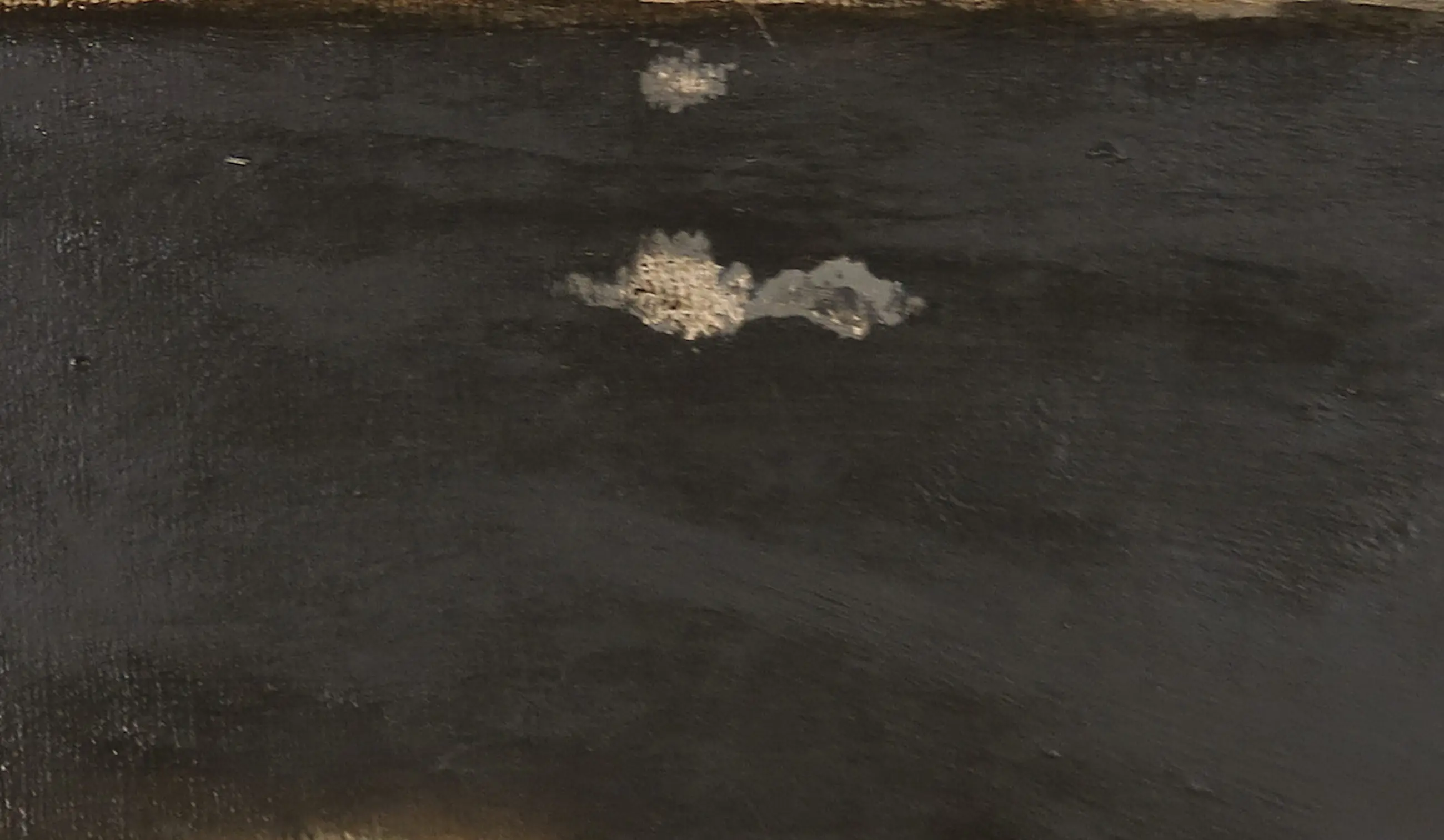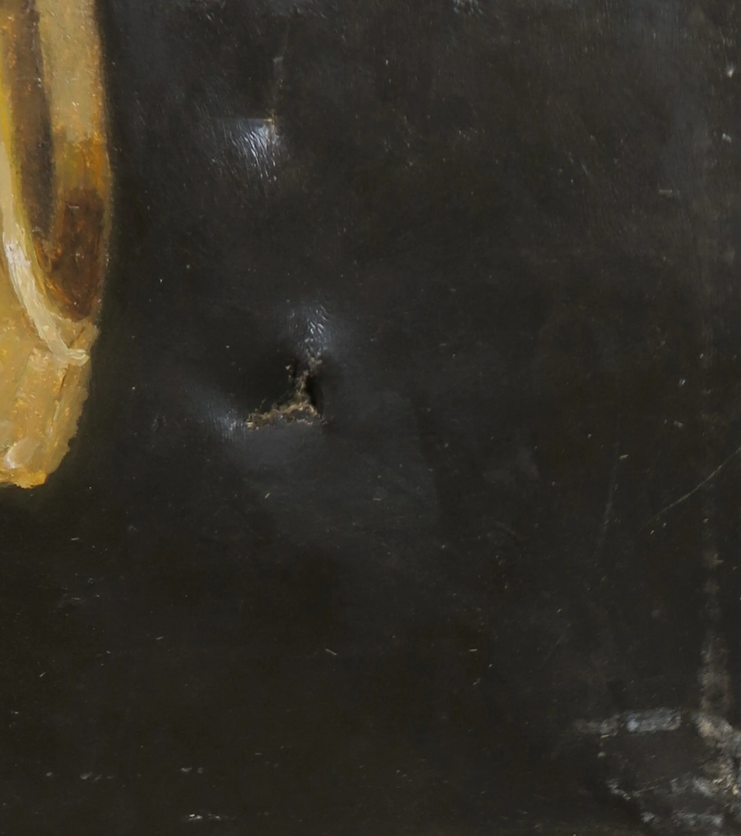 | Het werk is flink beschadigd, over de gehele voorstelling zijn butsen, gaten en verfverlies zichtbaar. Voorbeelden zijn te zien op de detailfoto's. | |