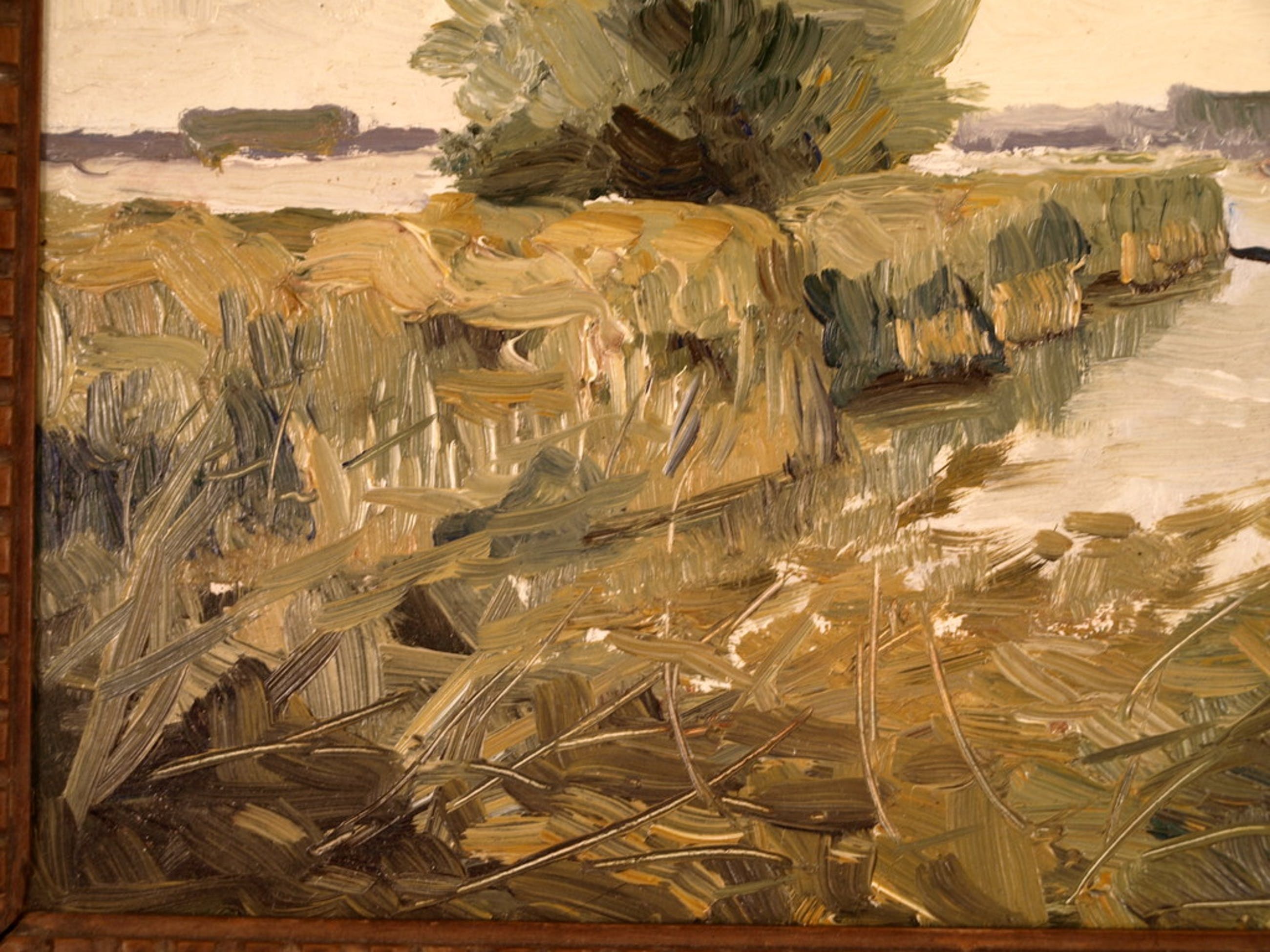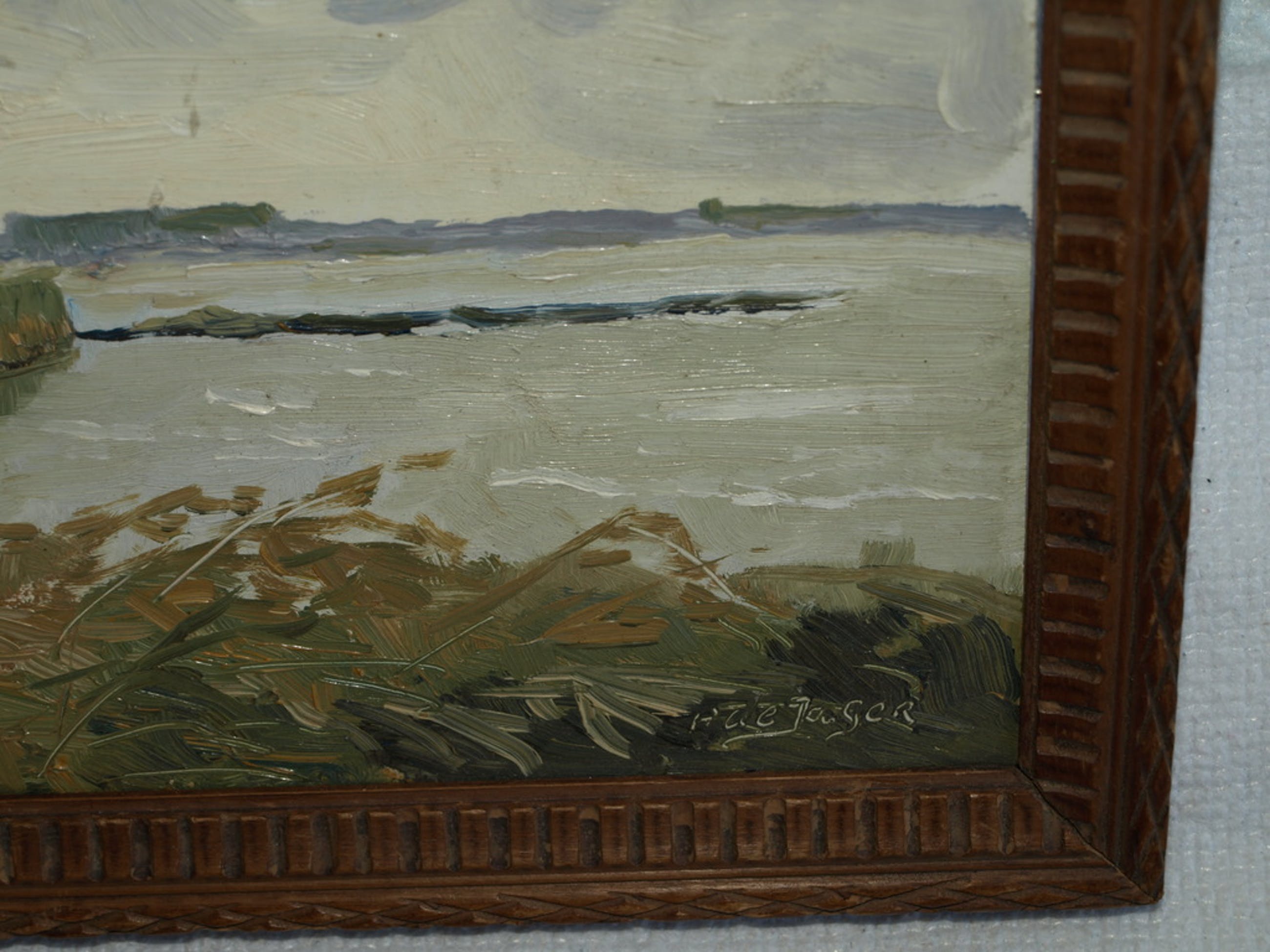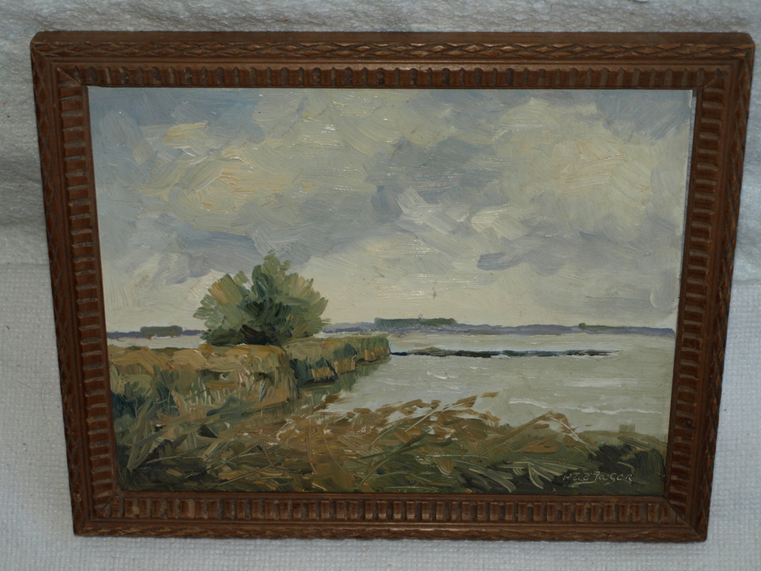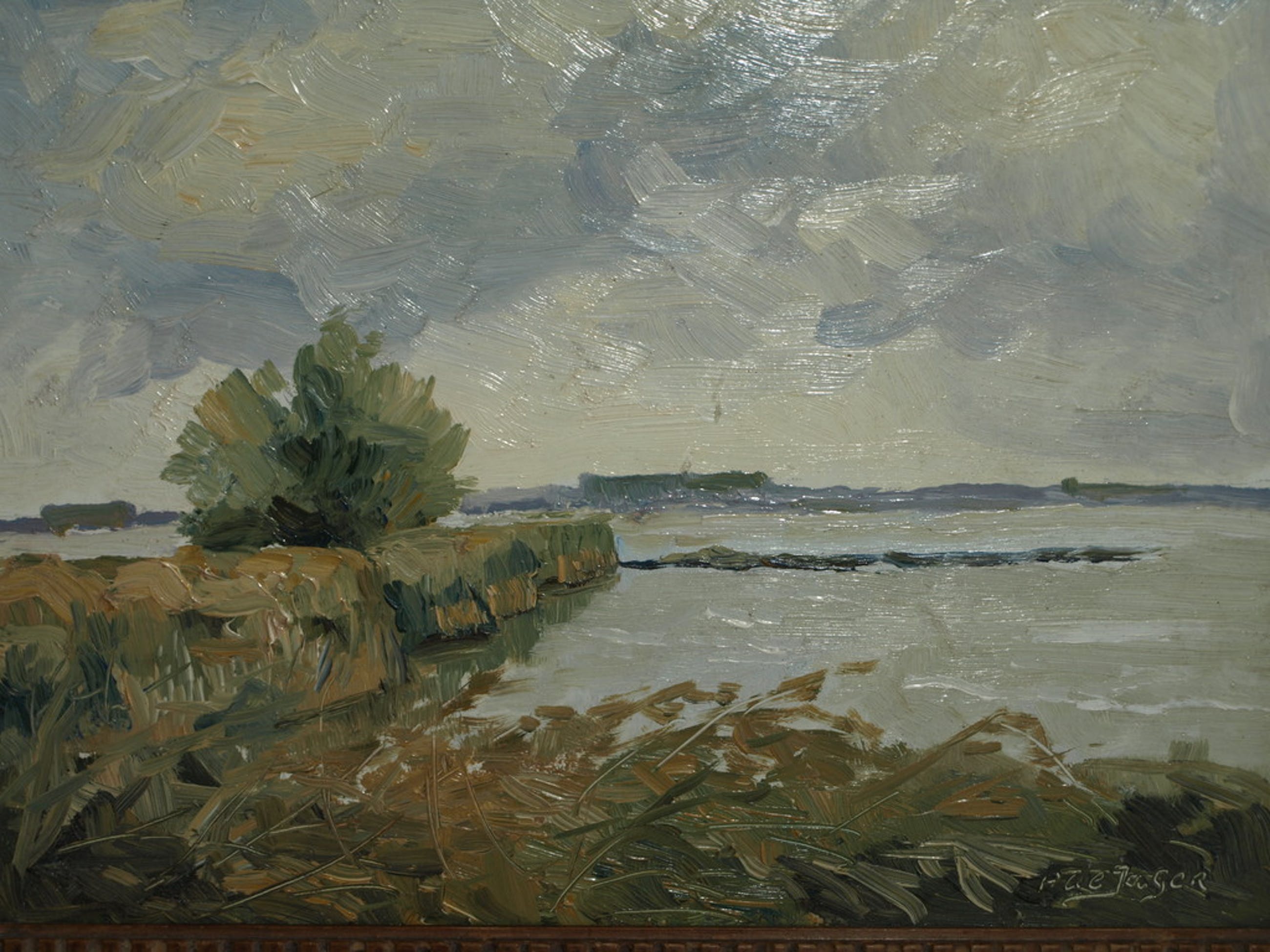 Een olieverfschilderij van een ‘verstild’ landschap met water. Gesigneerd “A. de Jager”.