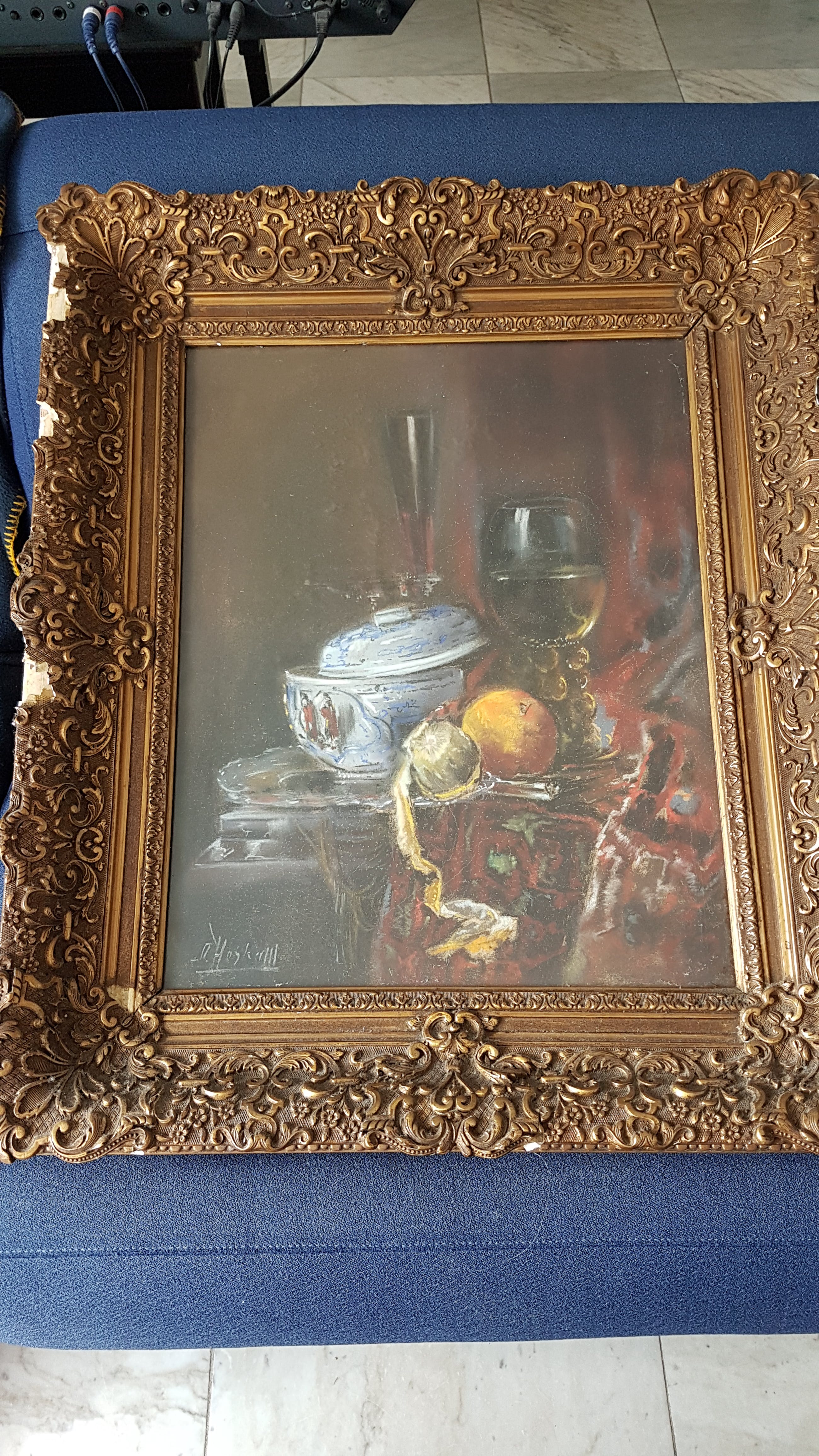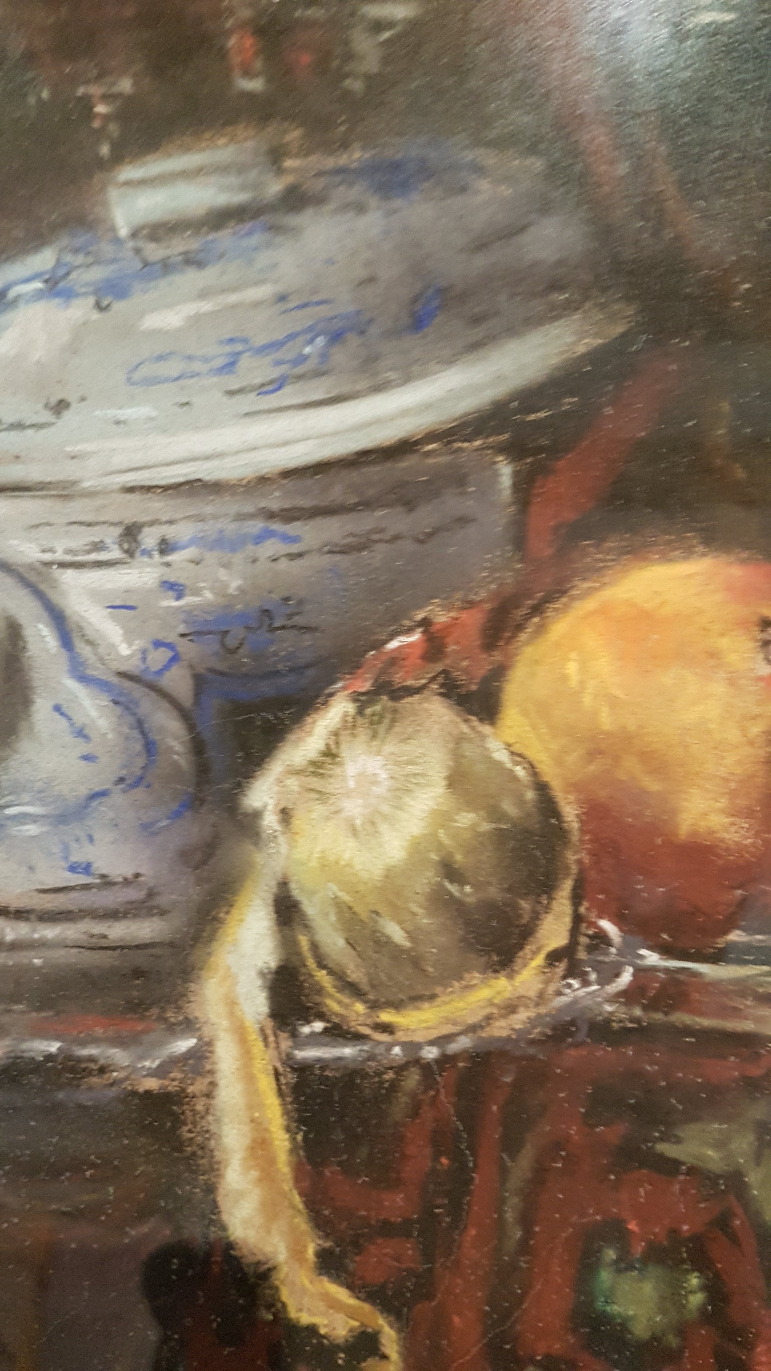Klassieke voorstelling met fruit en keukengerei. Achter glas. Lijst fraai maar beschadigd, zie foto's.