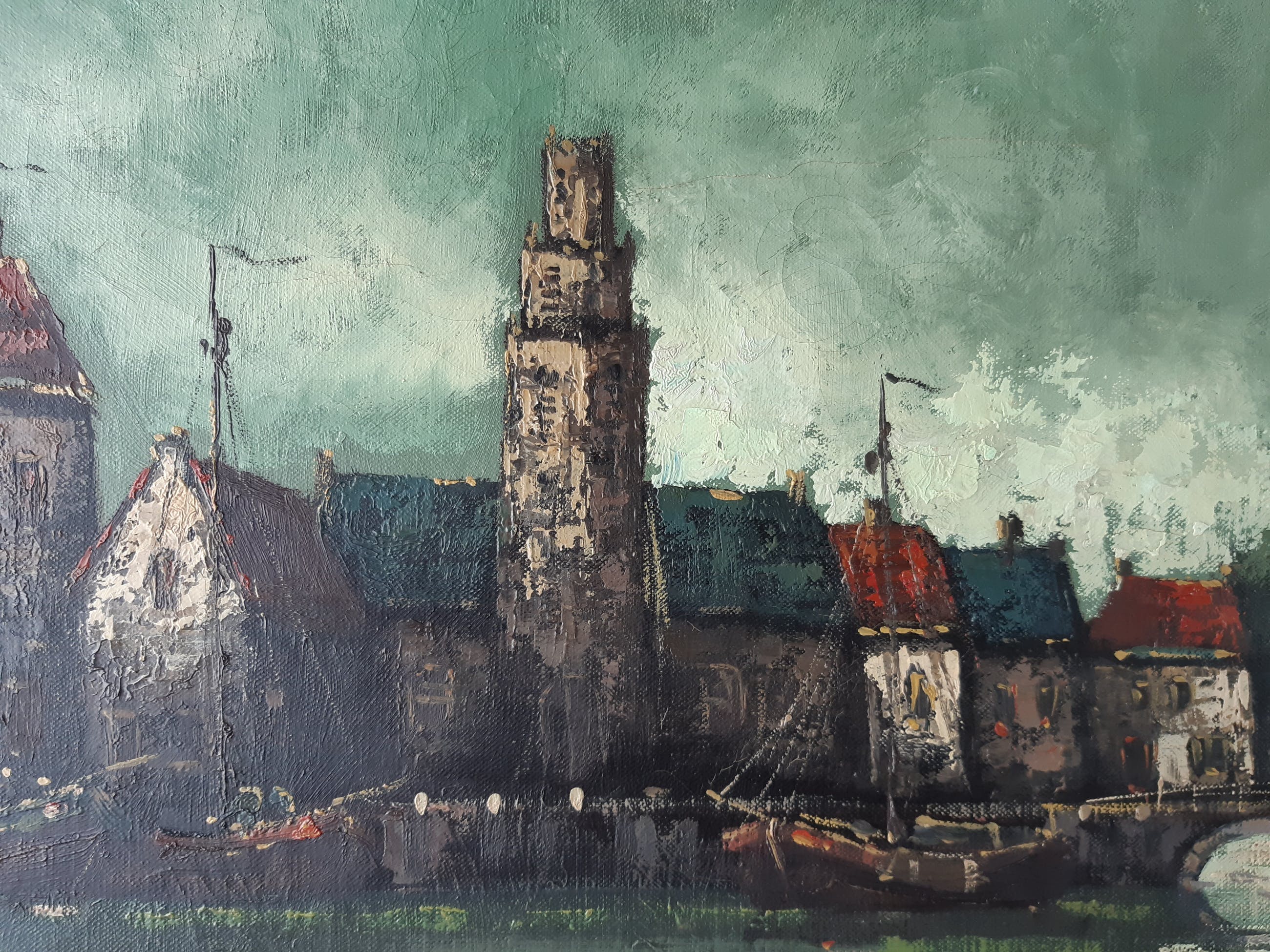 Een fraai stadsgezicht vanaf het water van Van der Heijden. Vermoedelijk gaat het om Dordrecht, maar Zutphen wordt ook genoemd.