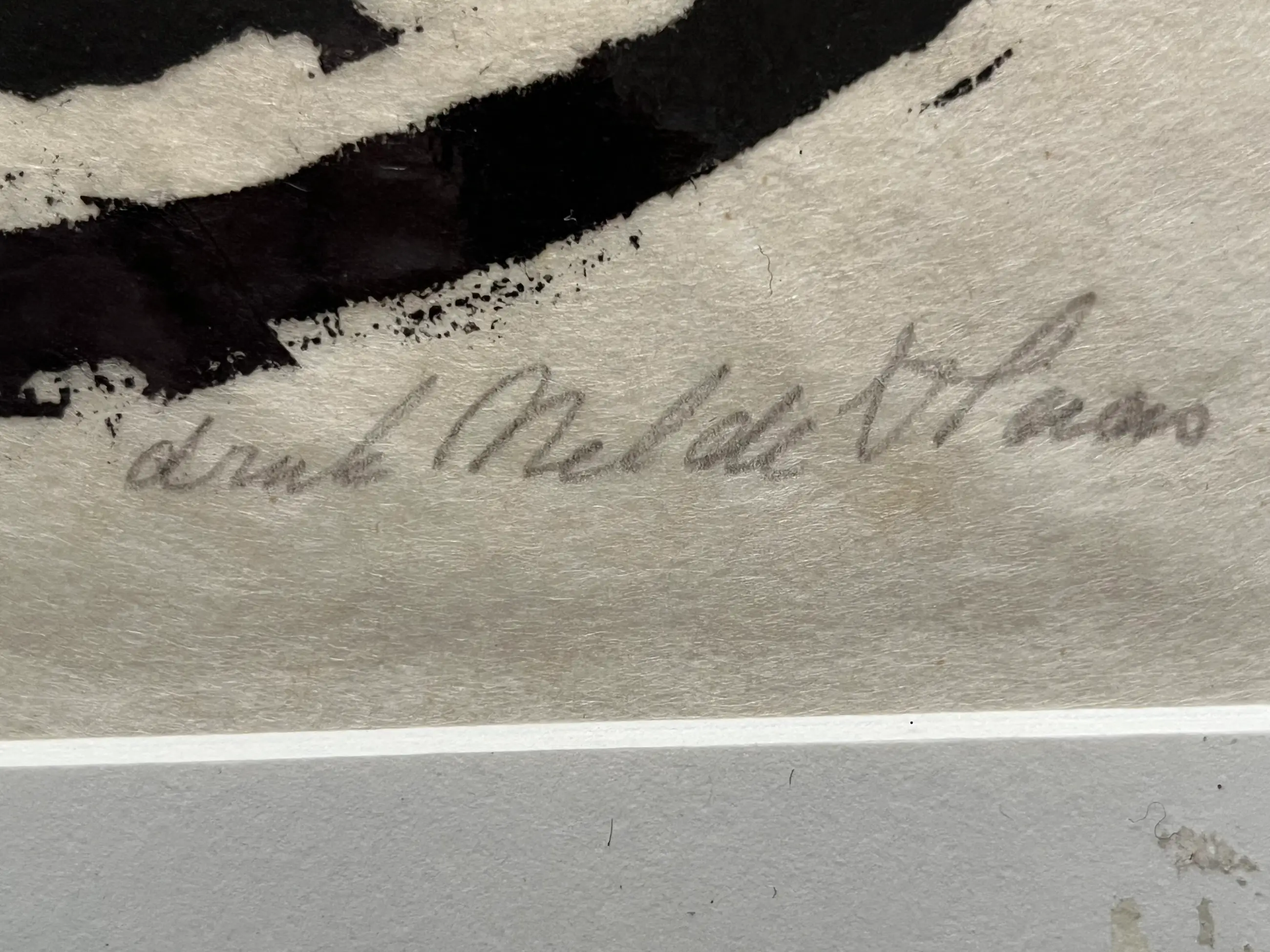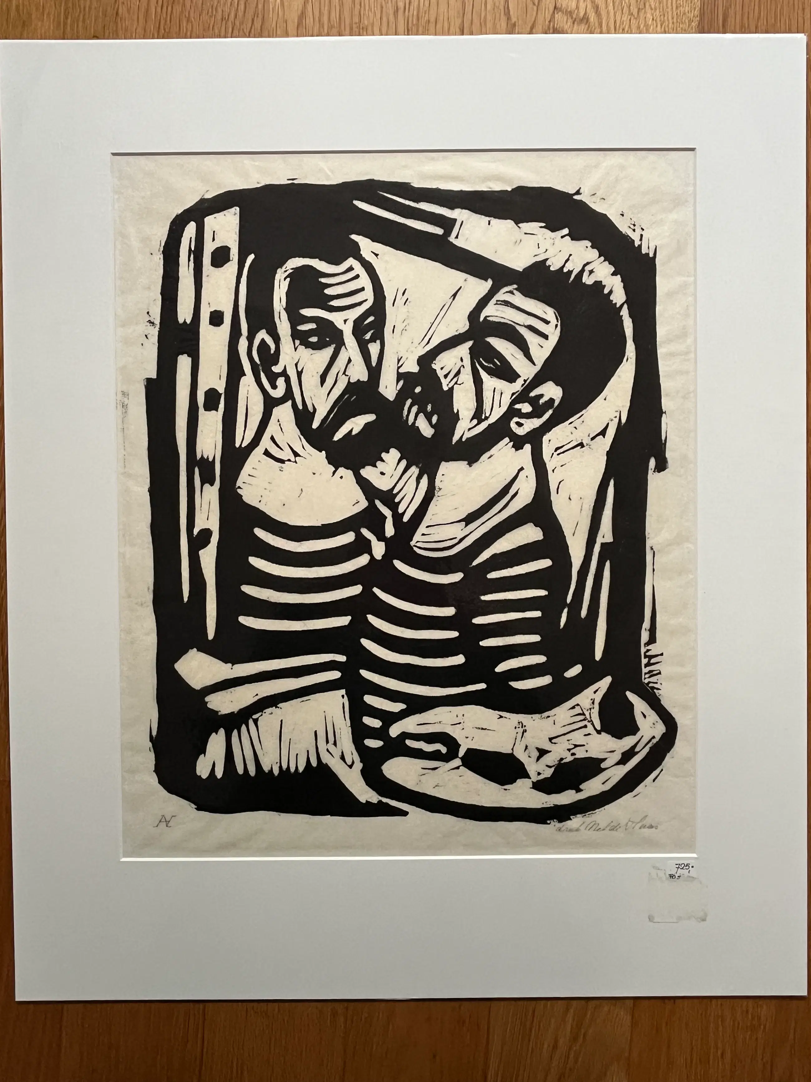 Fraaie linosnede waar de kunstenaar zichzelf heeft afgebeeld voor een spiegel. Oplage onbekend. Gedrukt door Nel de Haas. Voorzien van atelierstempel. Linodruk zit in passe-partout, waar omheen doorzichtige folie is gewikkeld.