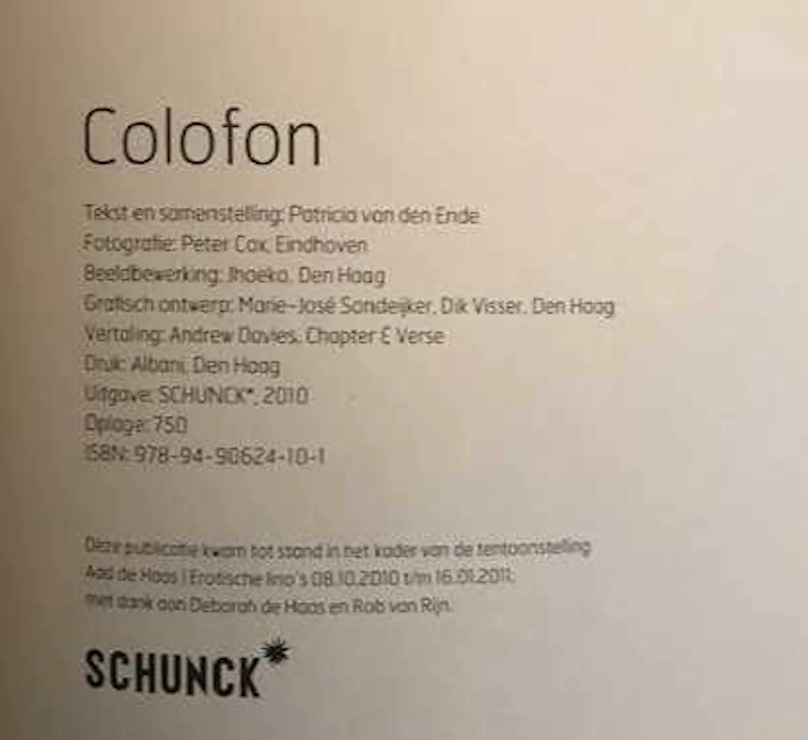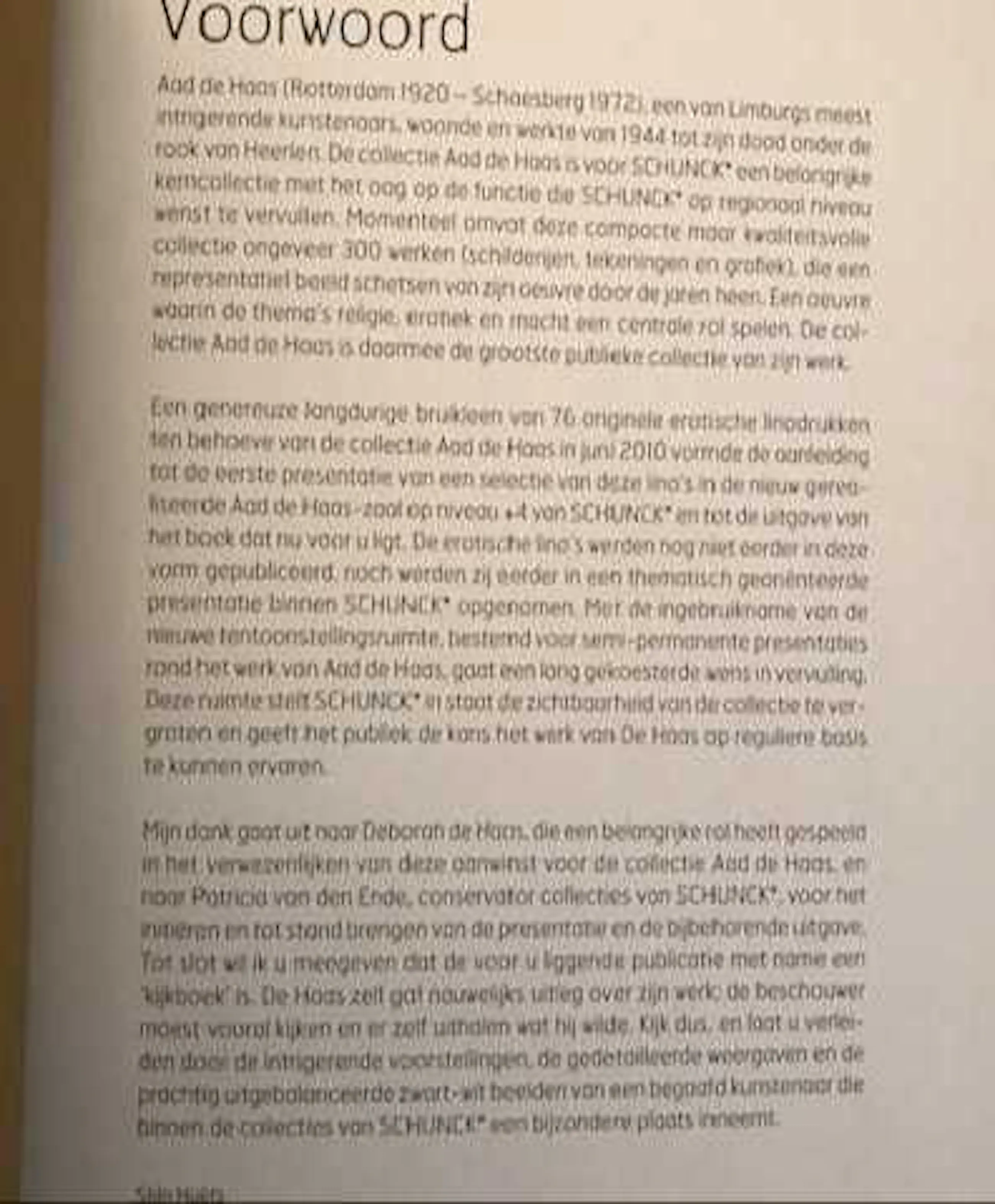 Een speciale uitgave (2010) van 76 erotische lino's van Aad de Haas, met voorwoord in het boek van Stijn Huijts. Ze geven een uitgesproken erotische voorstelling weer en zijn als gevolg van de intentie van de kunstenaar ooit bij elkaar gevoegd in een map. De lino's zijn door Aad de Haas zelf gedrukt en gesigneerd, soms met datum. Een mooi verzamelobject voor de liefhebber van de werken van Aad de Haas!