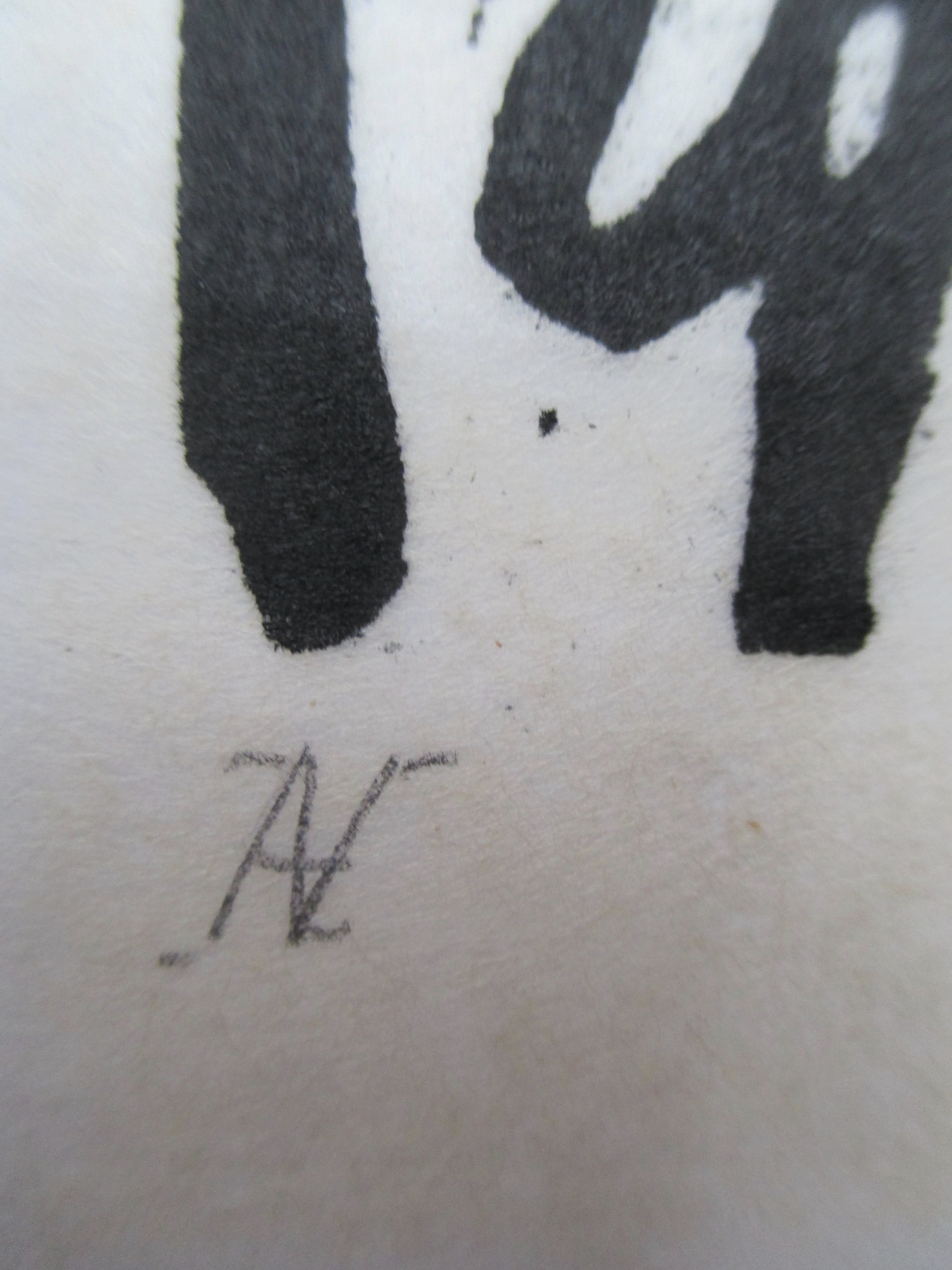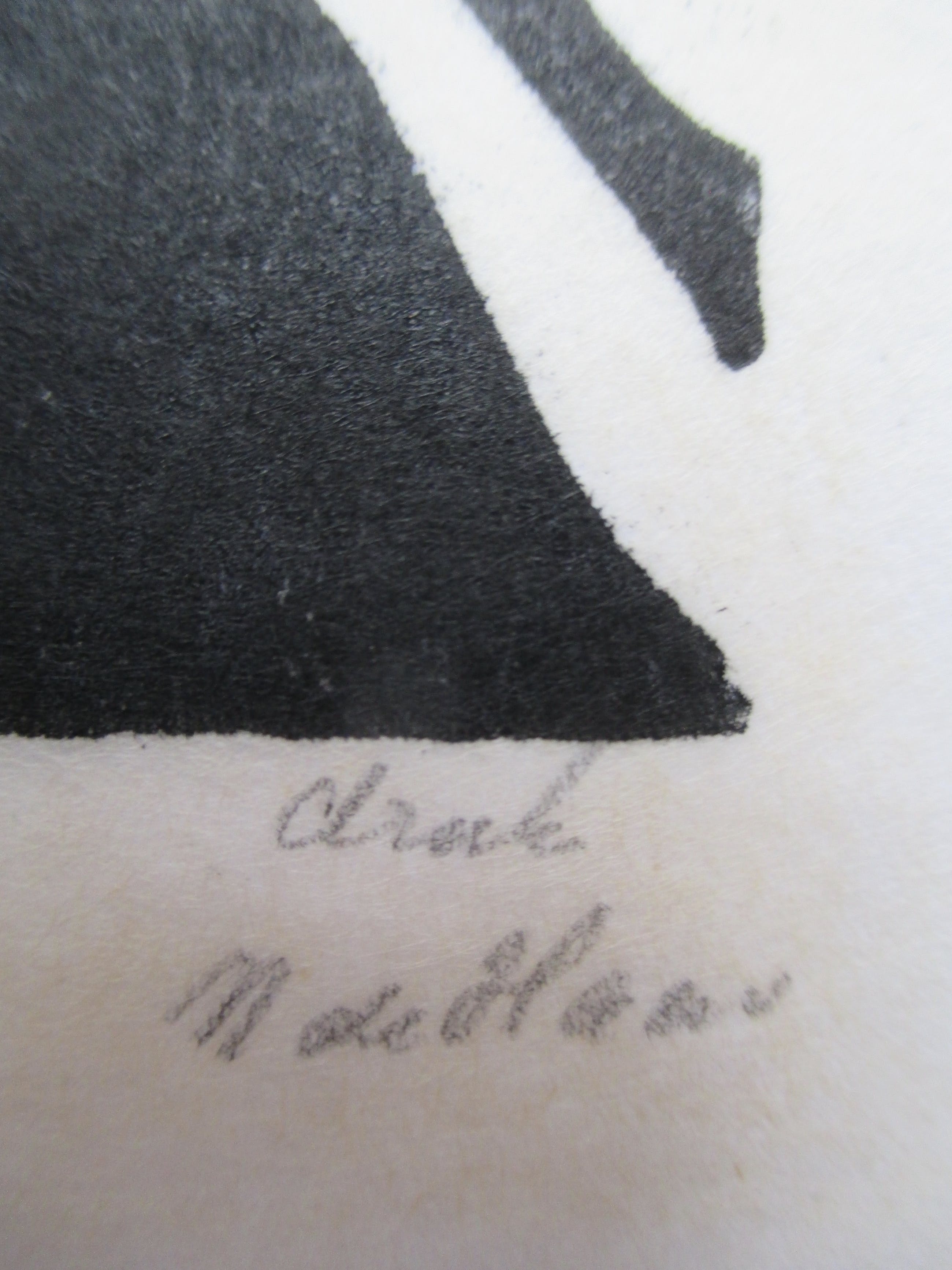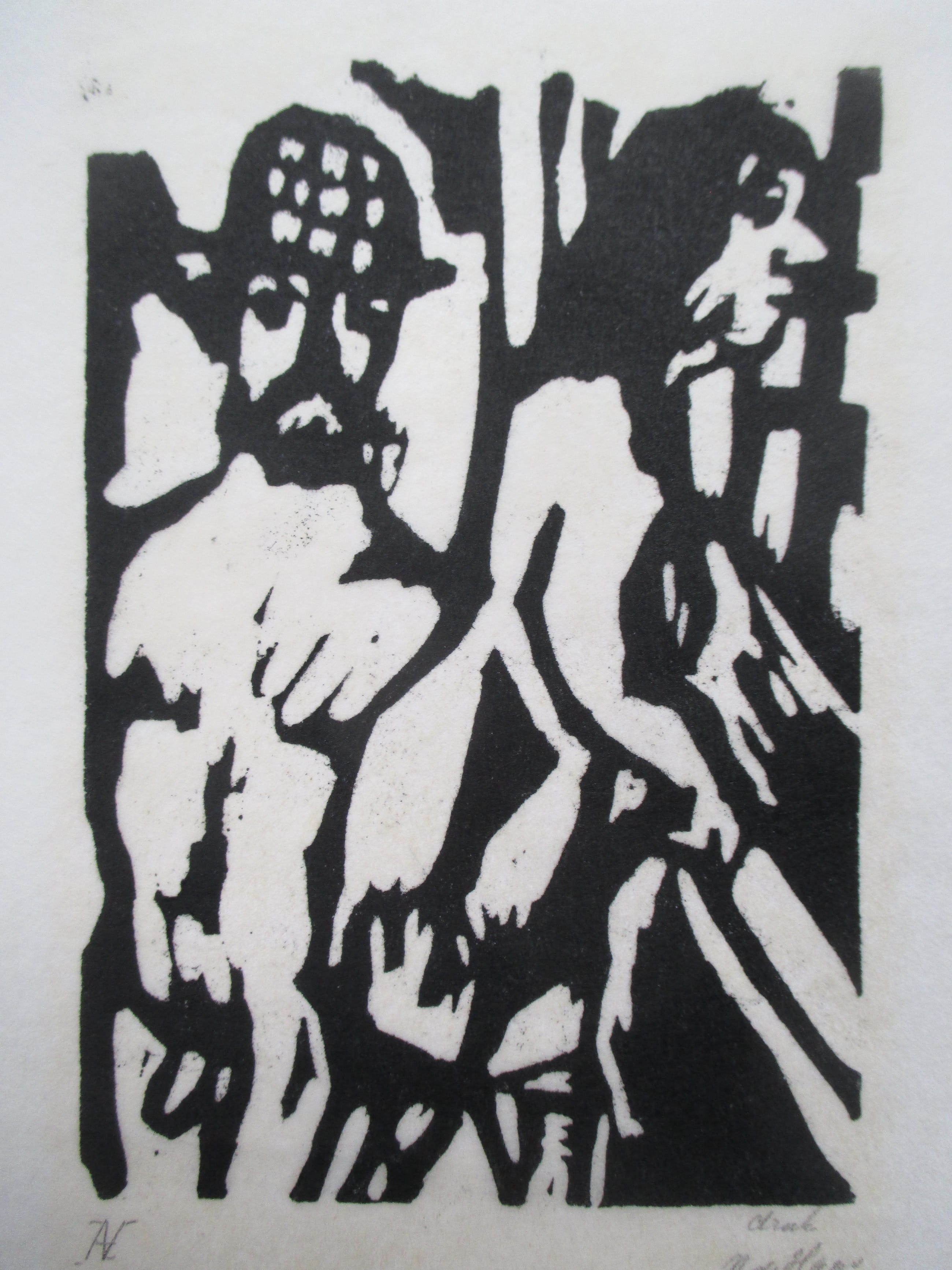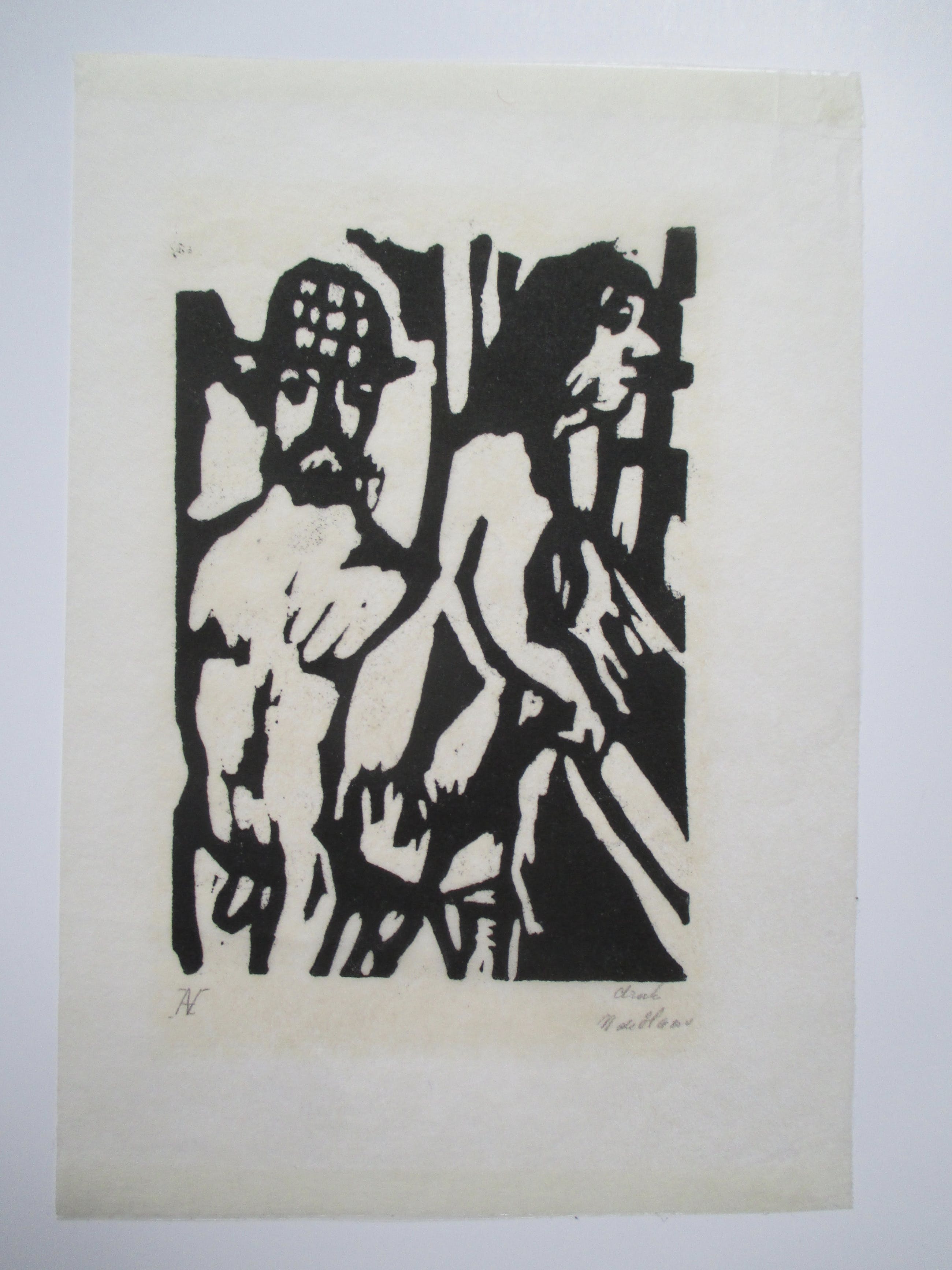 Houtsnede op zeer dun geschept papier van Aad de Haas, druk Nel de Haas. G esigneerd en monogram in potlood.