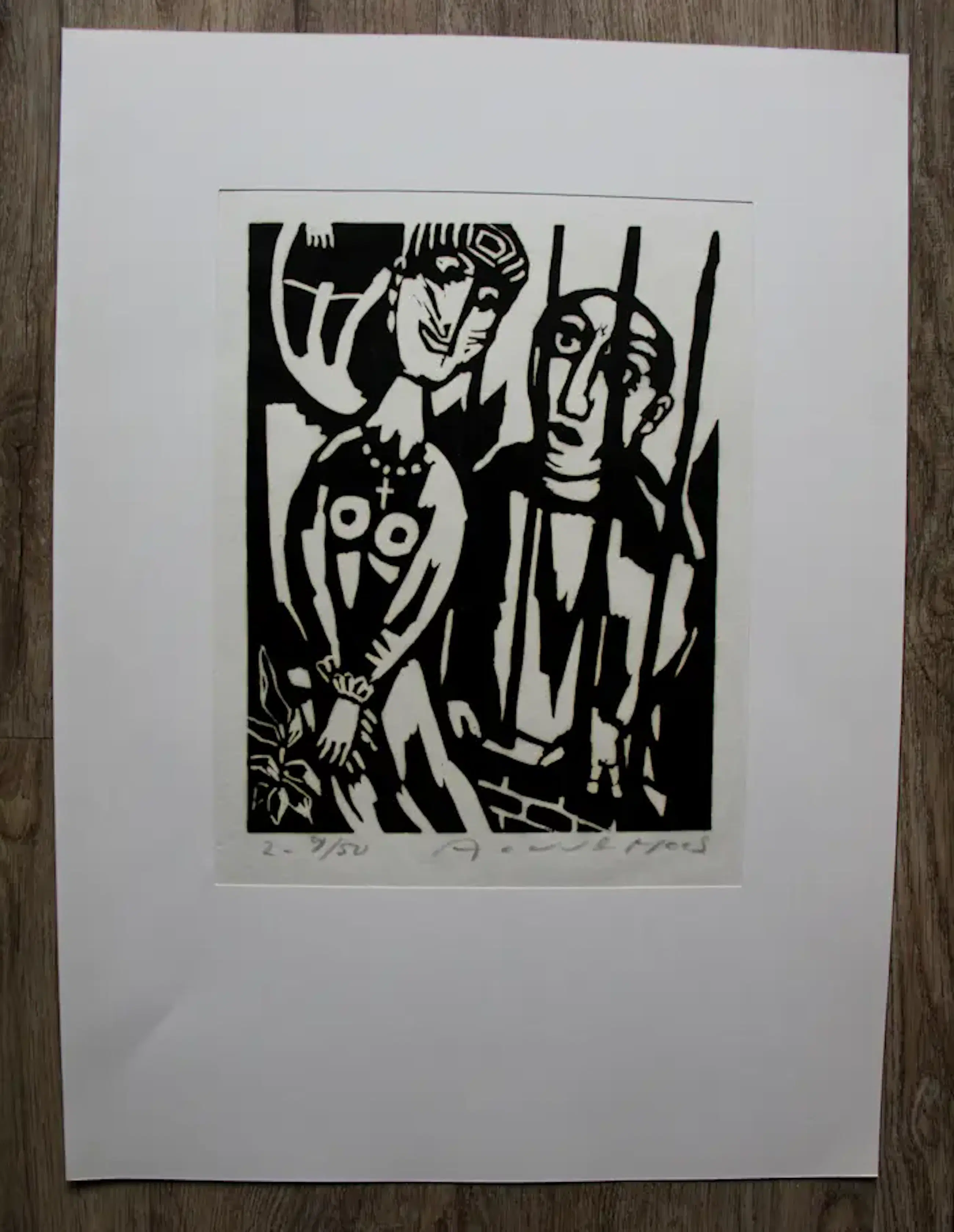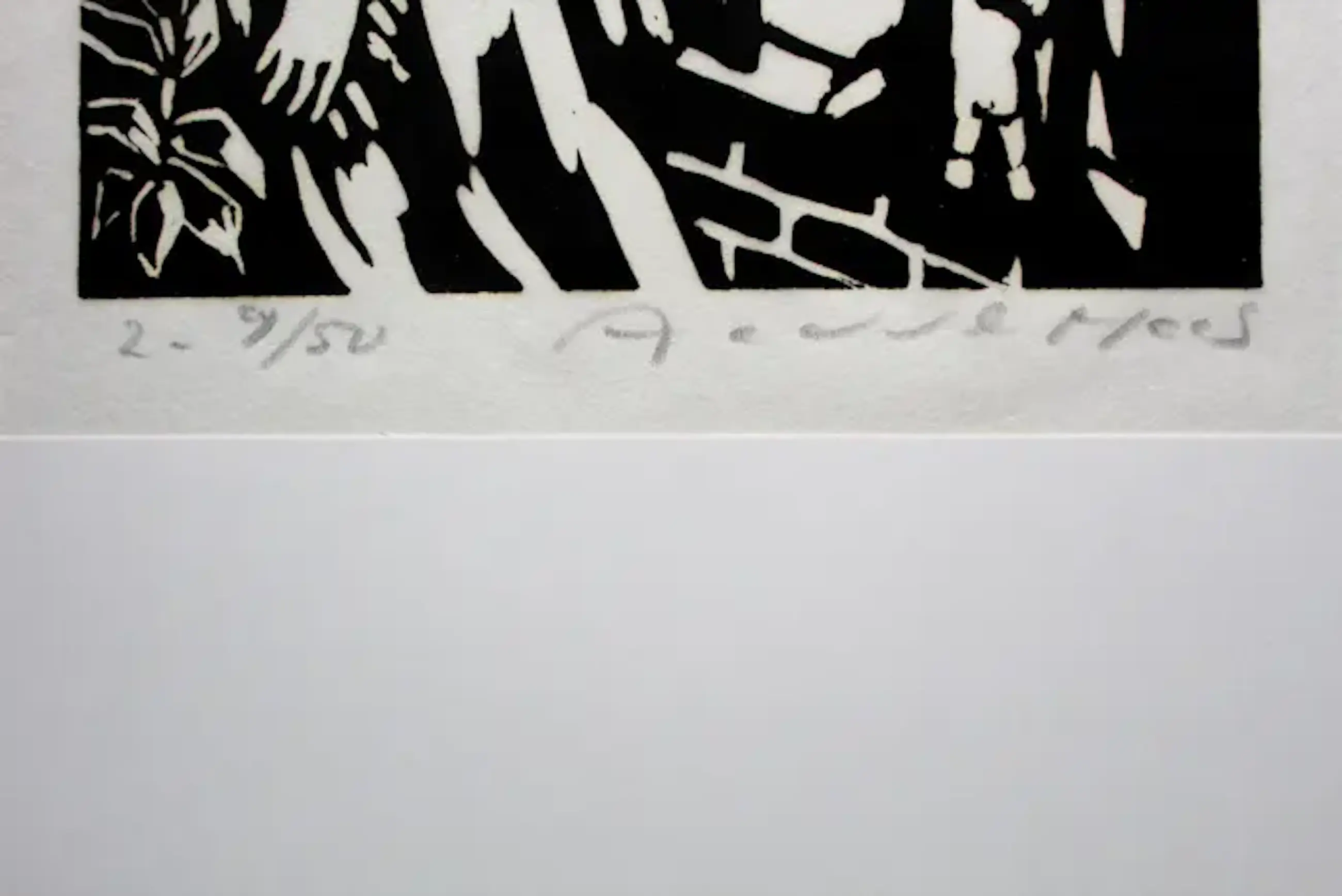 Linosnede van Aad de Haas. Jaar: 1966. Oplage: 9/50. Nummer: 3. Afmetingen incl passe-partout: H55 x b40cm. Afmetingen voorstelling: H28.5 x b22cm. Het werk is rechtsonder gesigneerd door de kunstenaar. De authenticiteit van het aangeboden werk wordt volledig gegarandeerd. Een certificaat van echtheid kan, op aanvraag, worden gemaild.