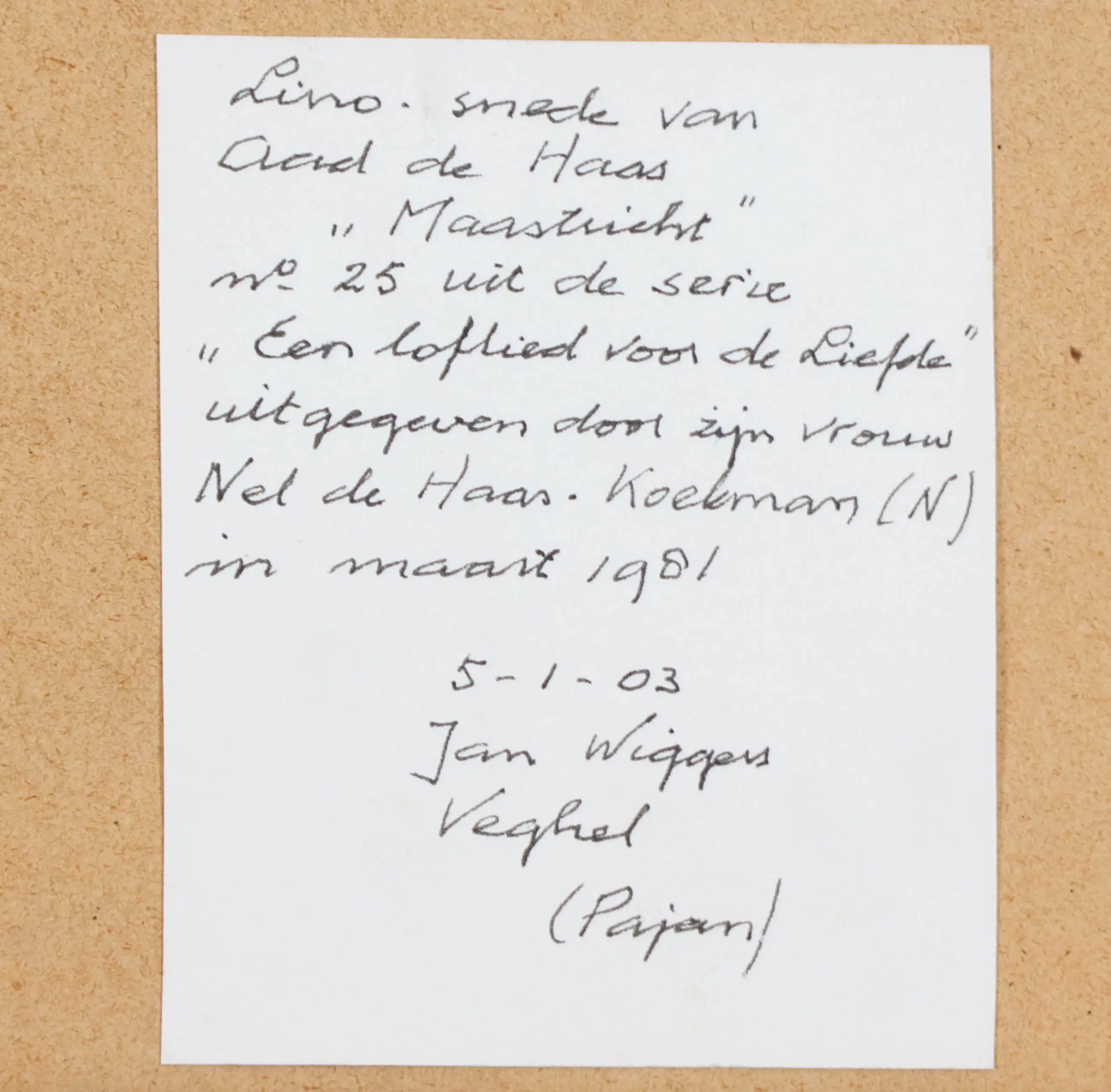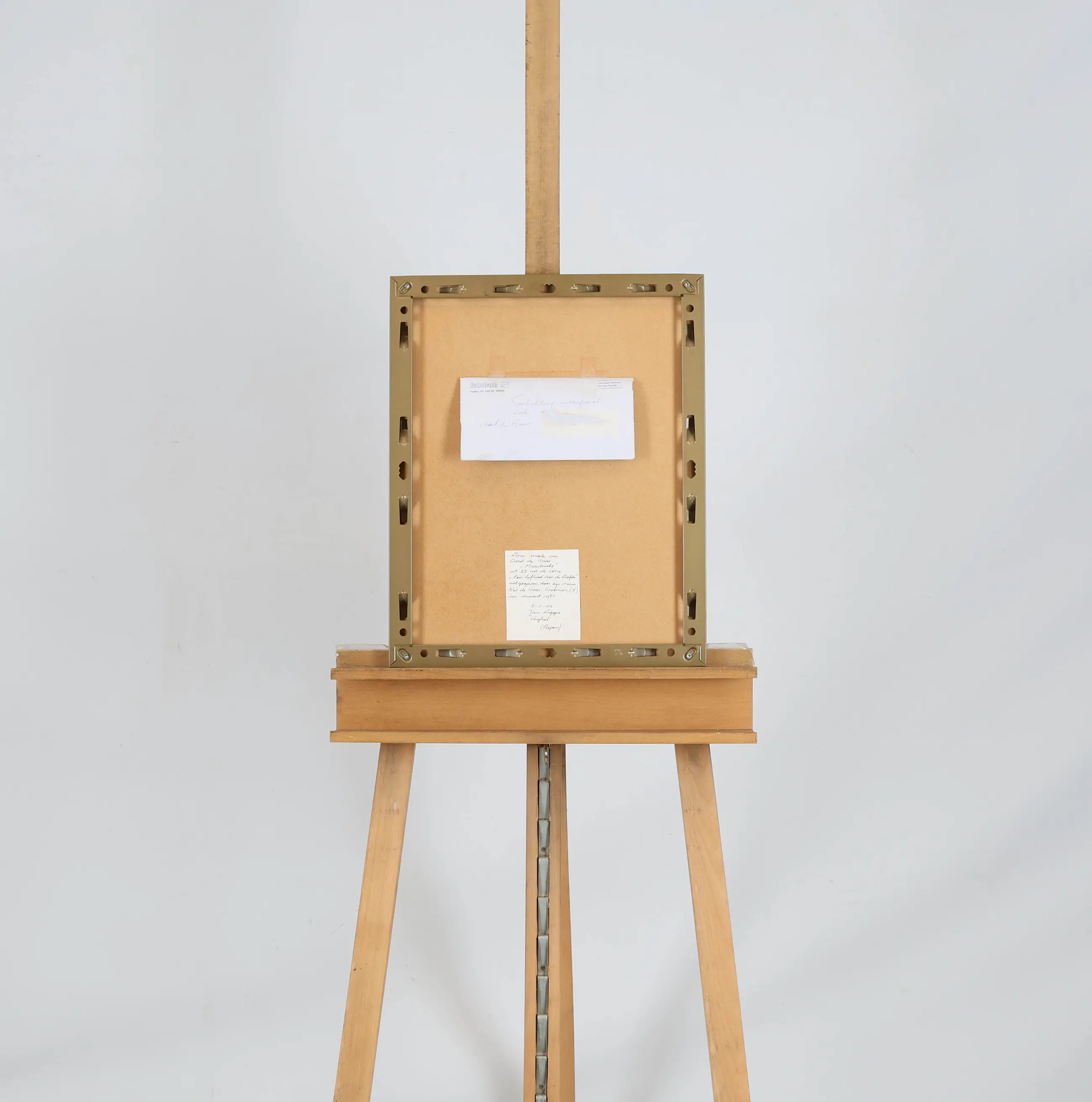 Op de achterzijde van de lijst bevindt zich een envelop met documentatie en artikelen betreffende de kunstenaar.