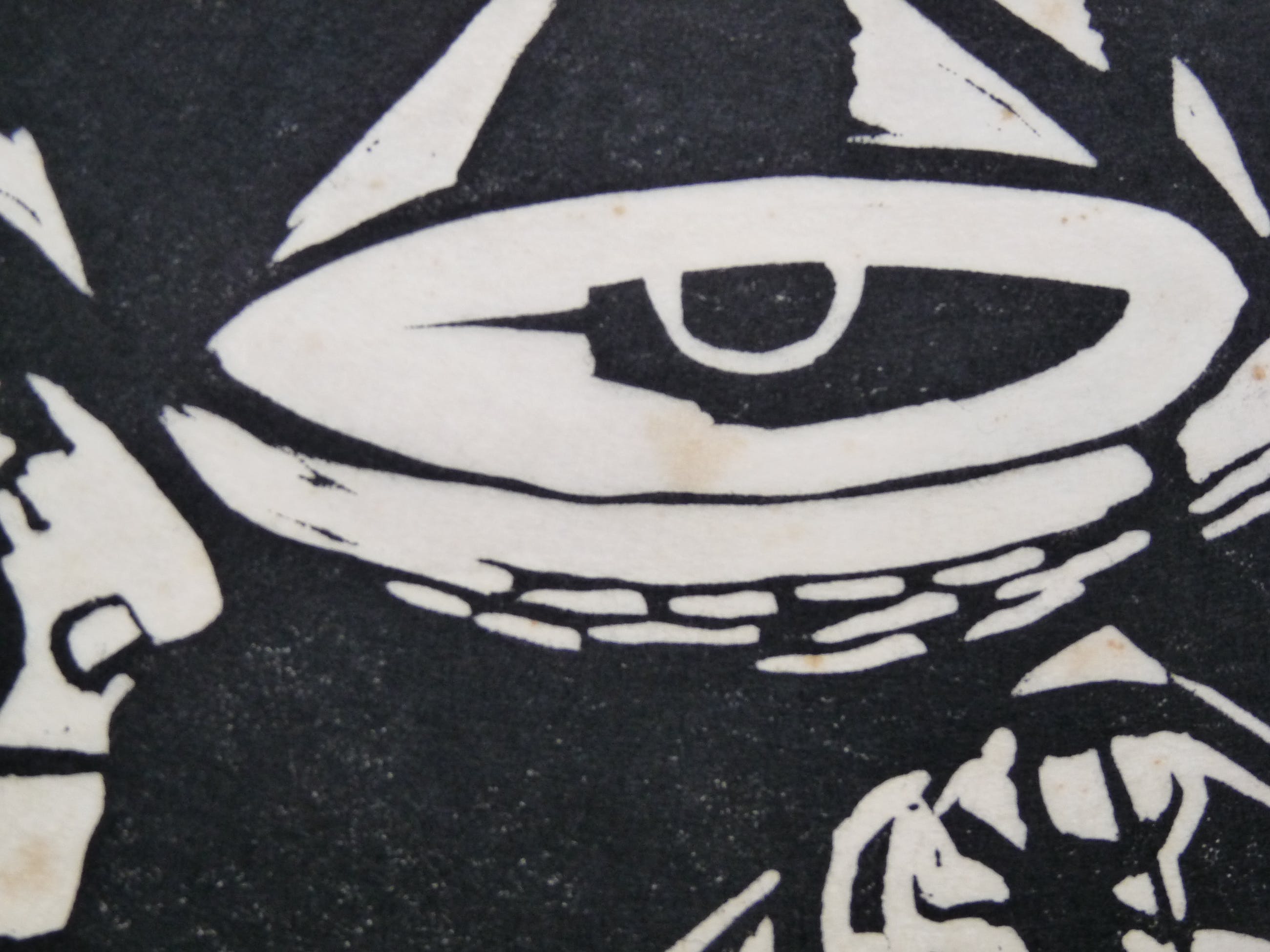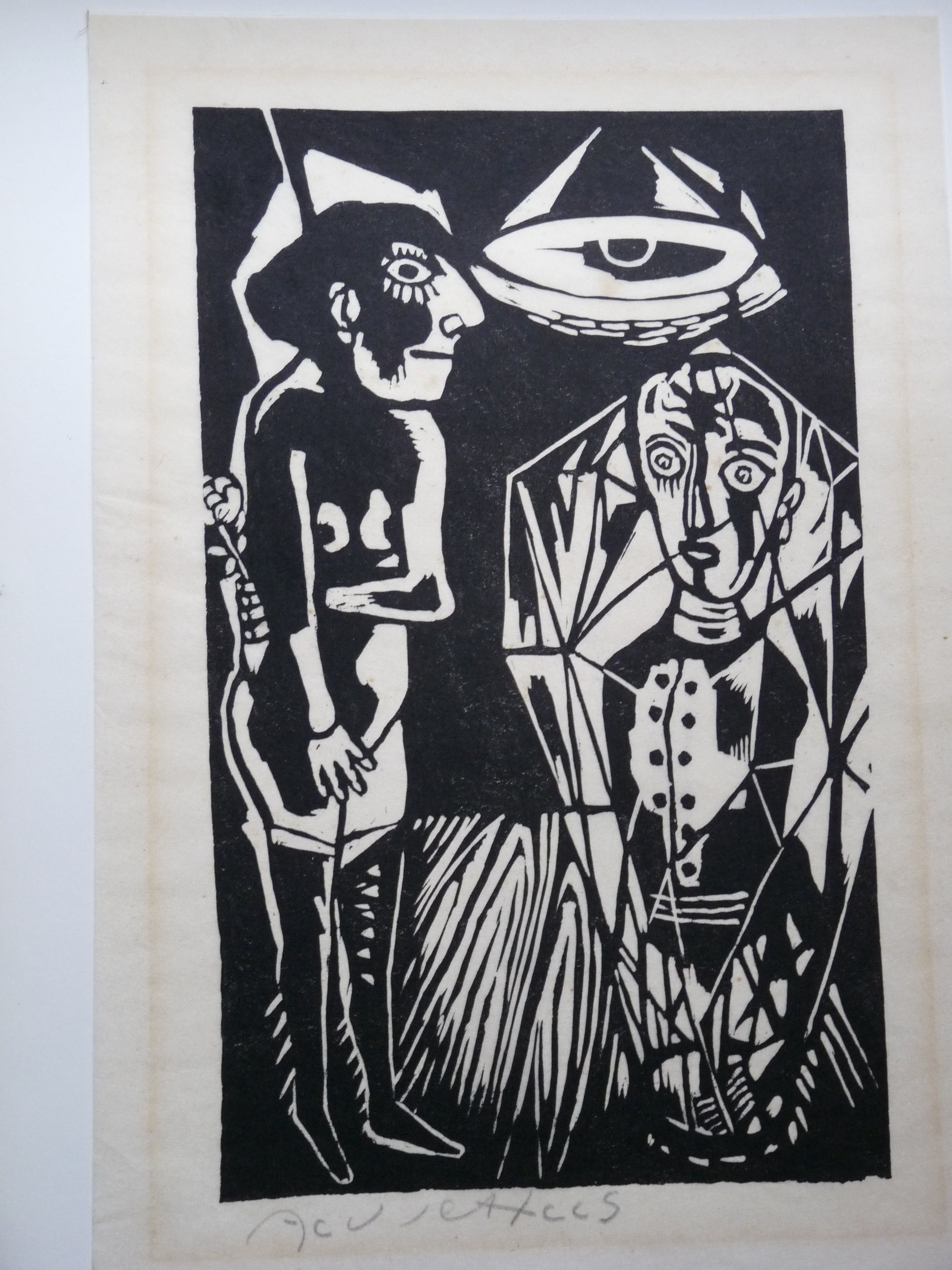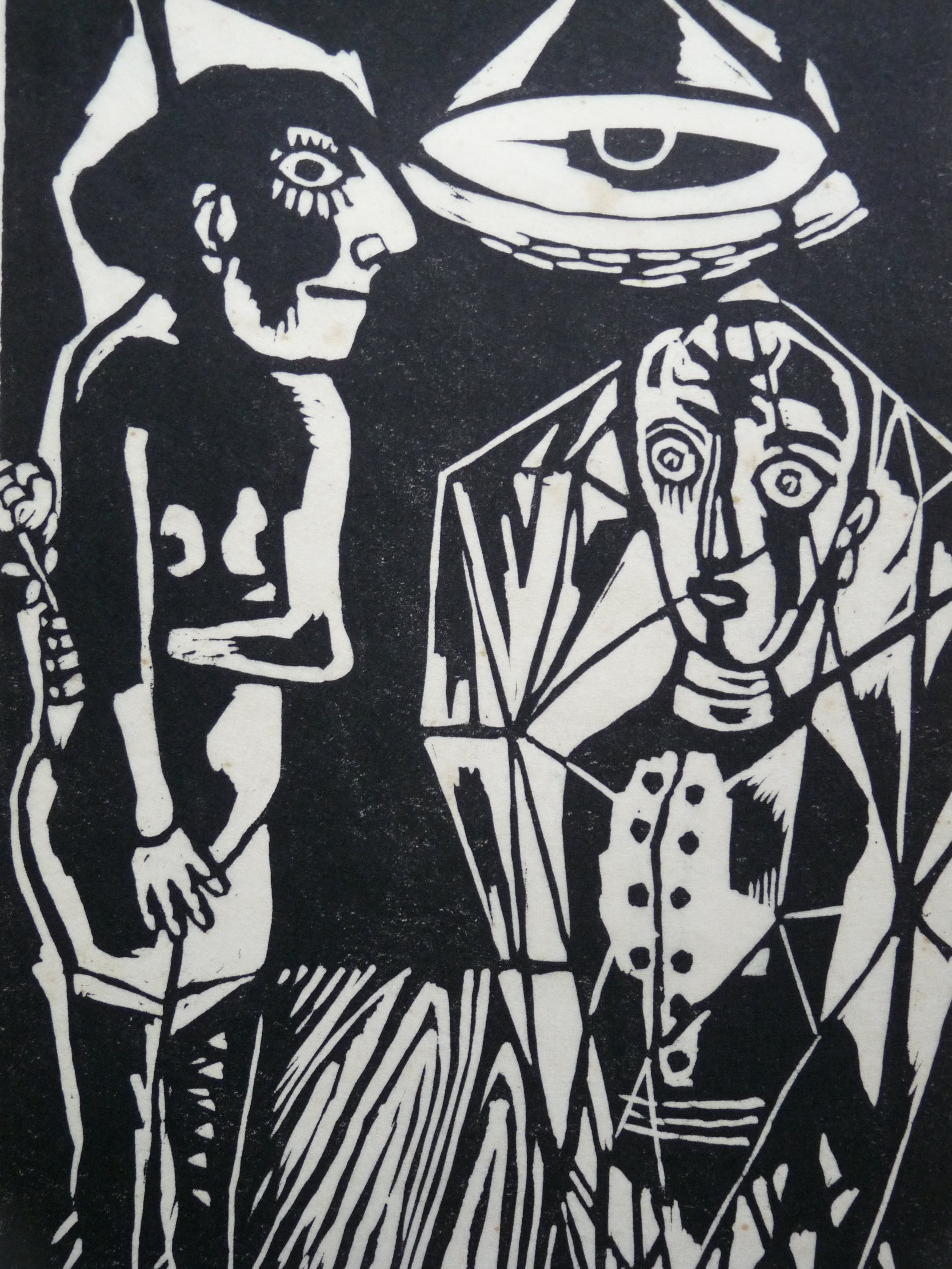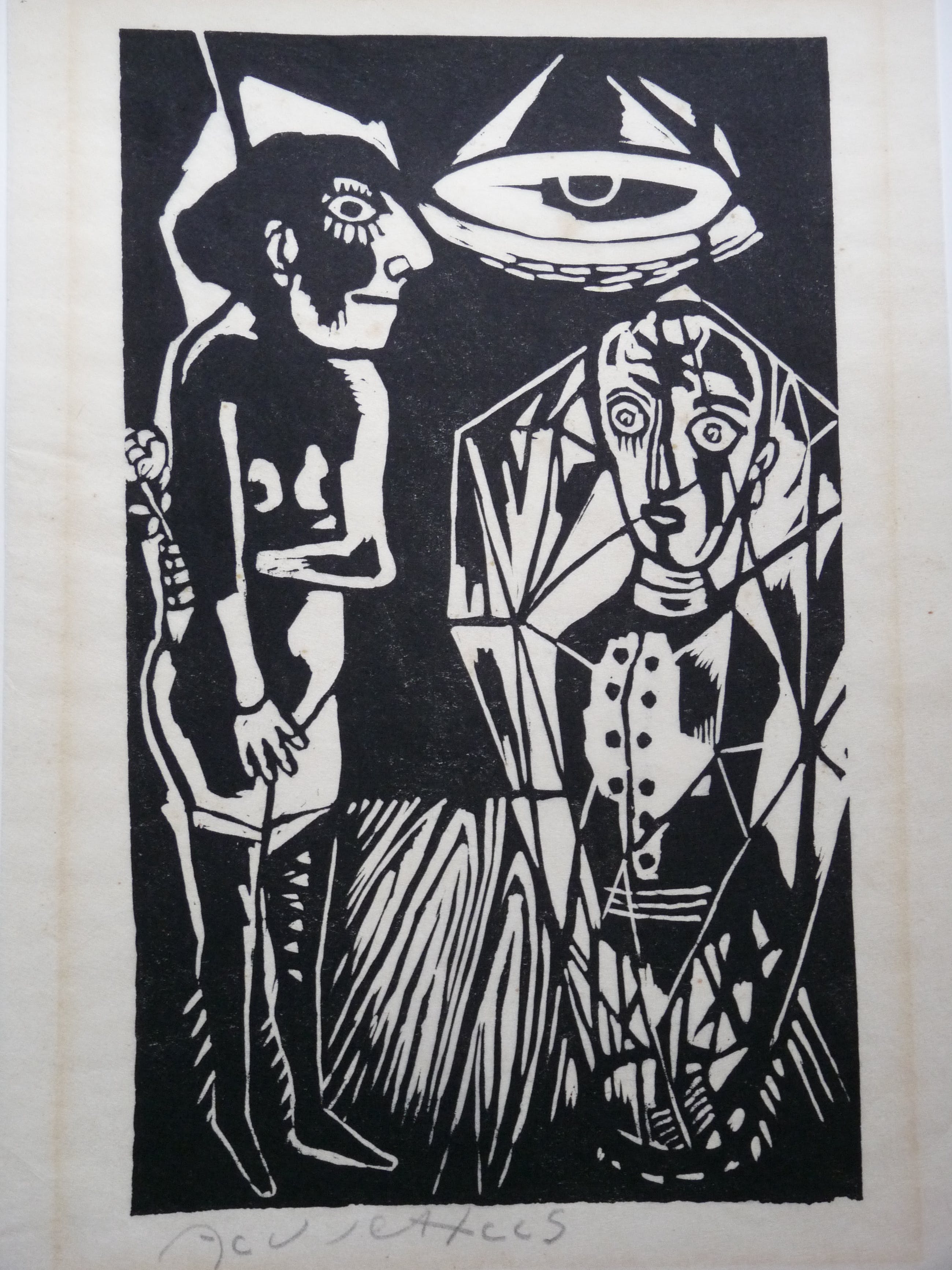 Linodruk op erg dun, kwetsbaar papier. Ook deze afbeelding is gebruikt in een postume uitgave. Dit exemplaar uit de periode 1966/1968 is door de kunstenaar zelf gesigneerd. Omranding afbeelding is iets verkleurd en binnen de afbeelding zitten op de lamp wat kleine bruine vlekjes. Afmeting blad 47,5 x 33 cm. Afbeelding 40 x 24 cm.